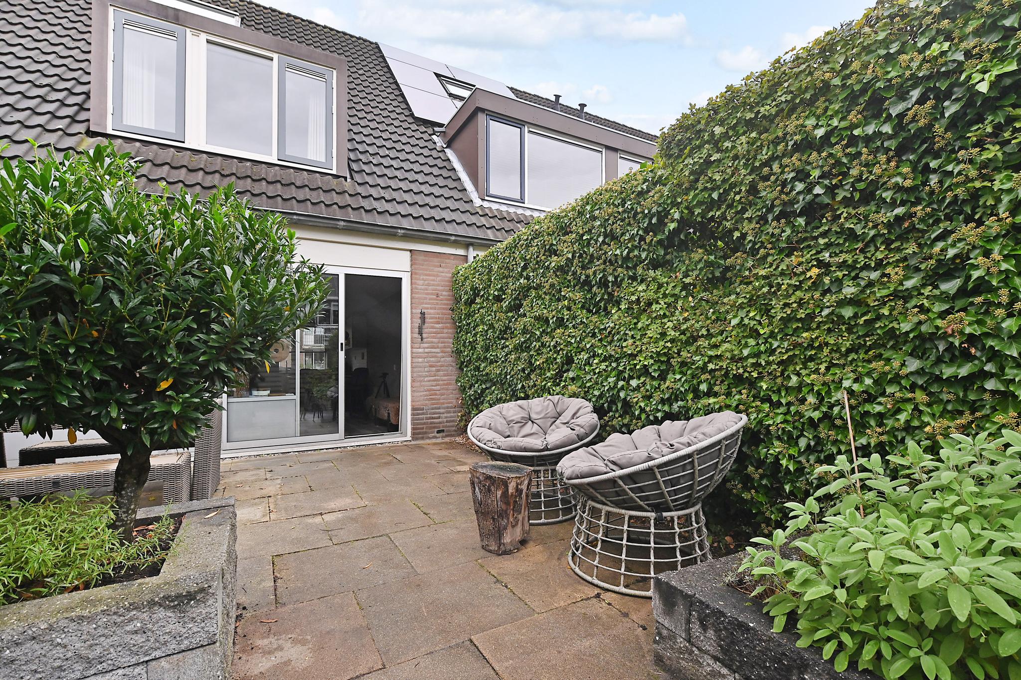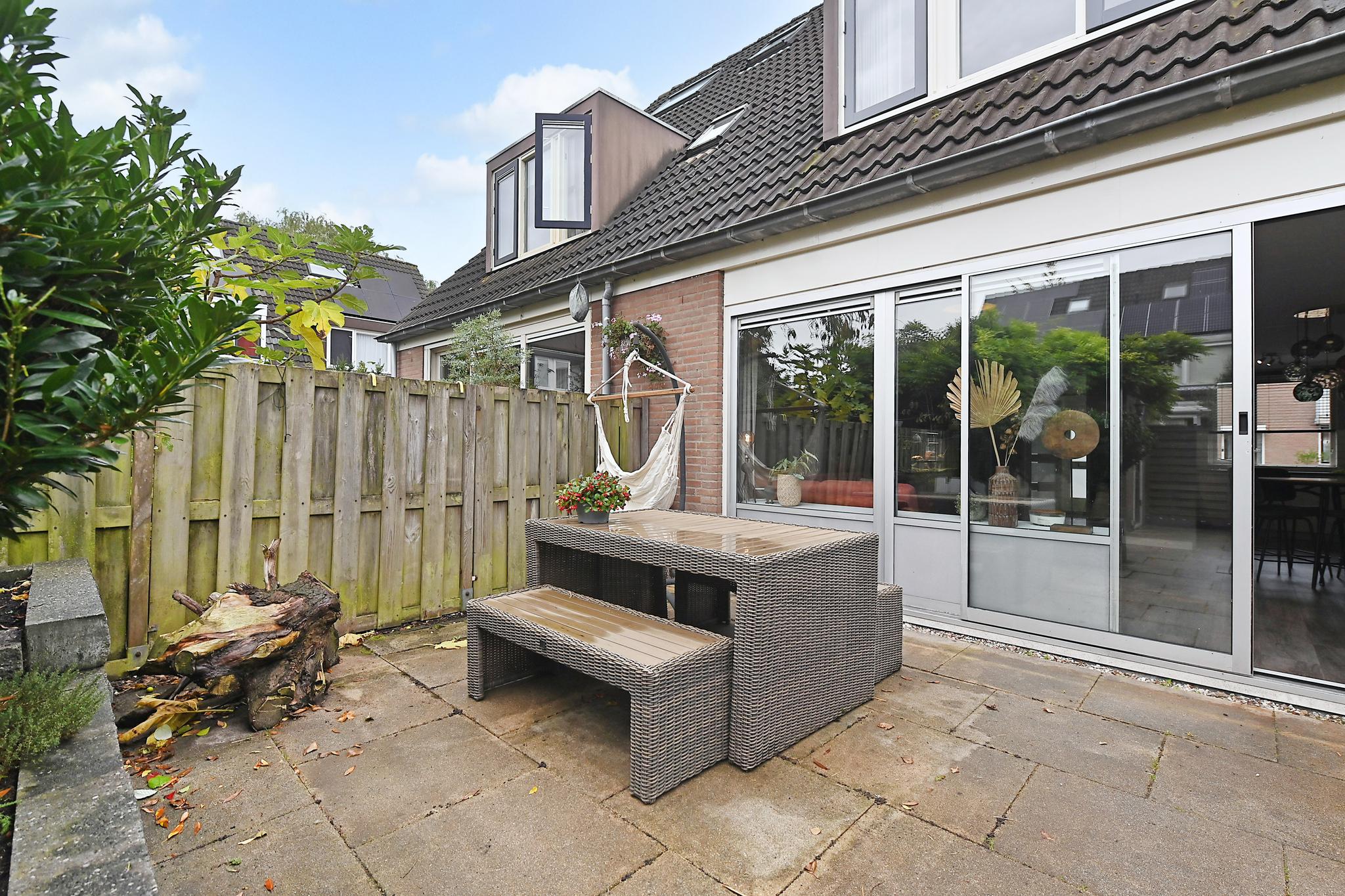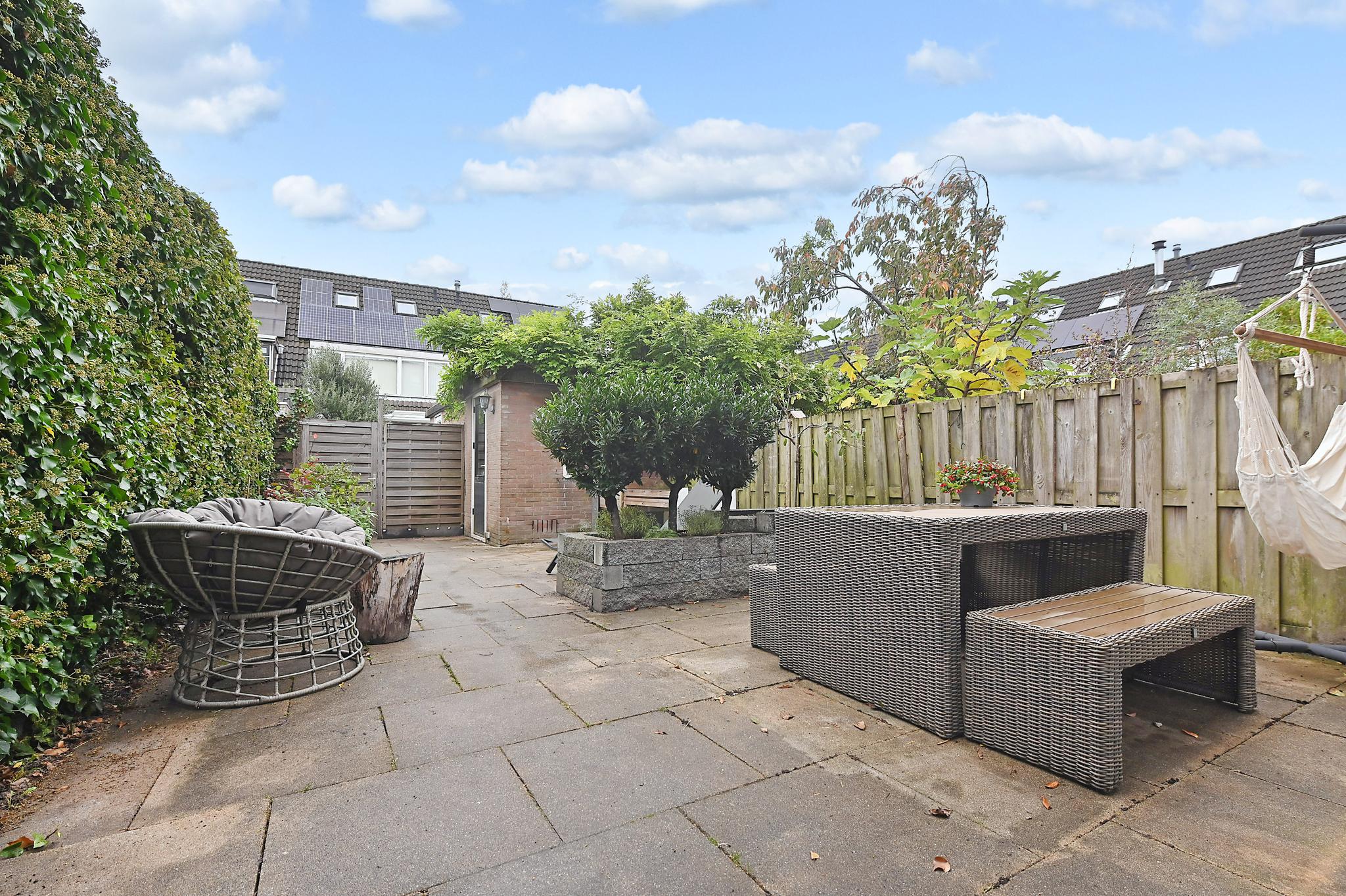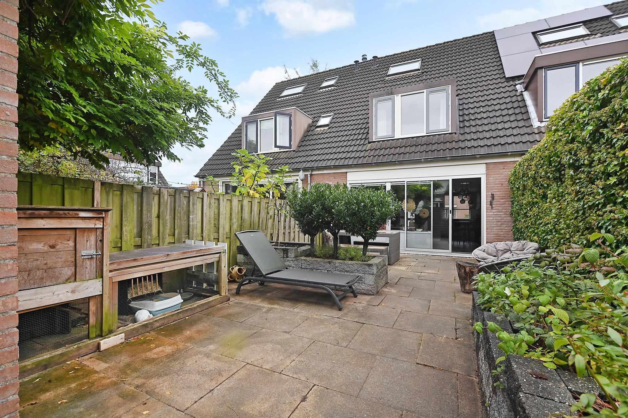Vanuit de woonkamer kom je via de schuifpui in de achtertuin. Deze is netjes aangelegd met sierbestrating en groene borders. Achterin de tuin bevindt zich een praktische stenen berging met elektra.