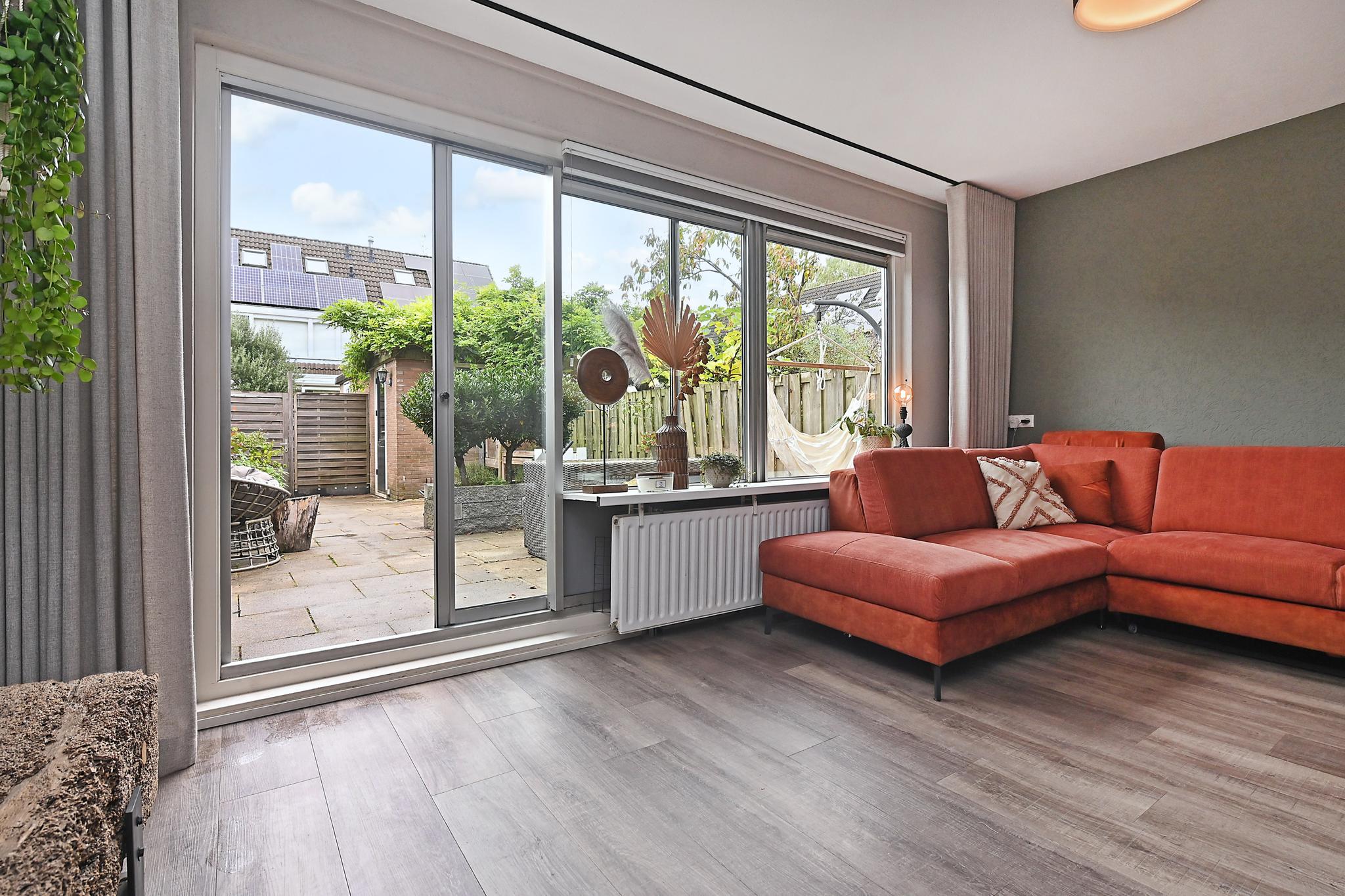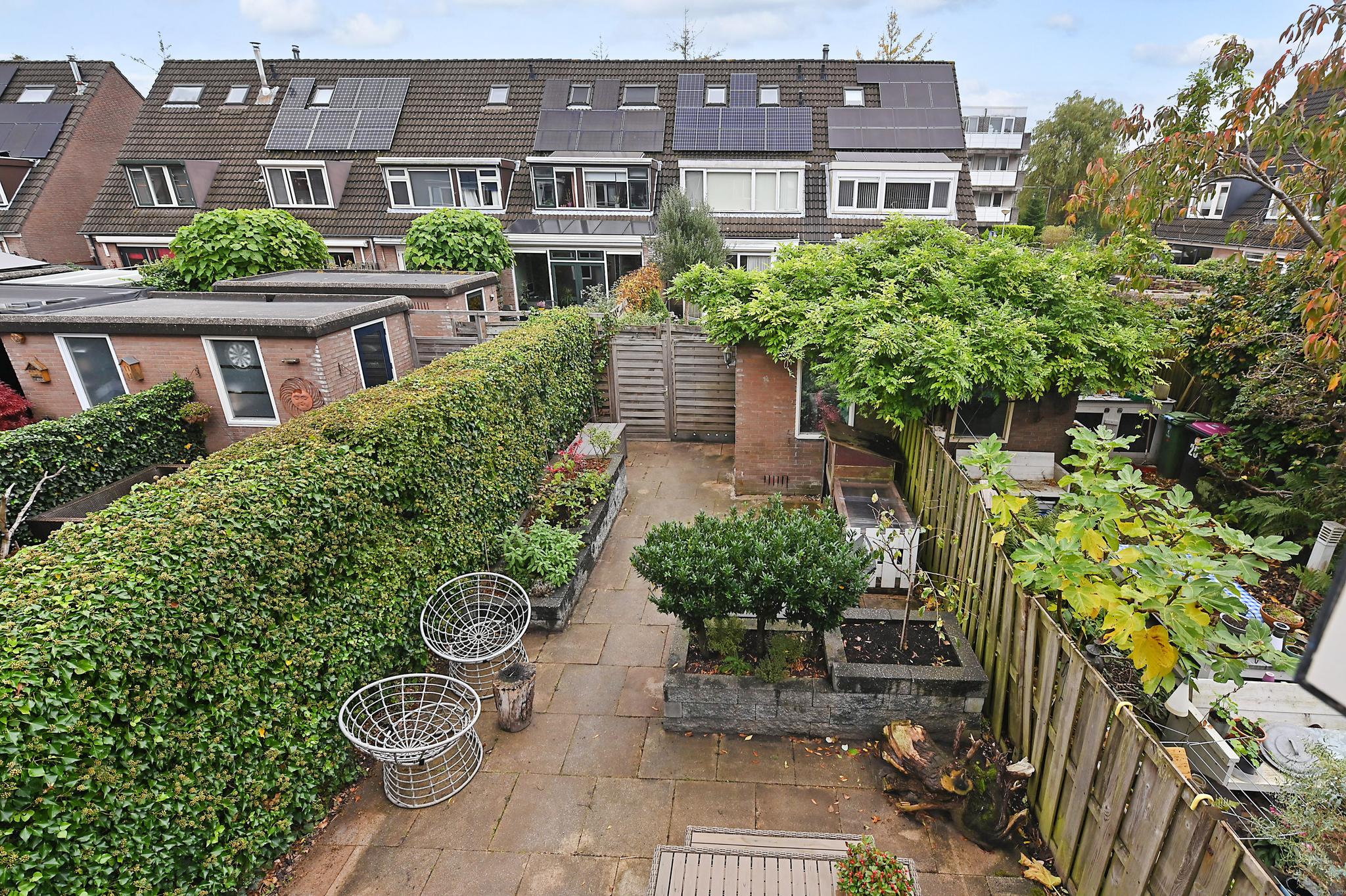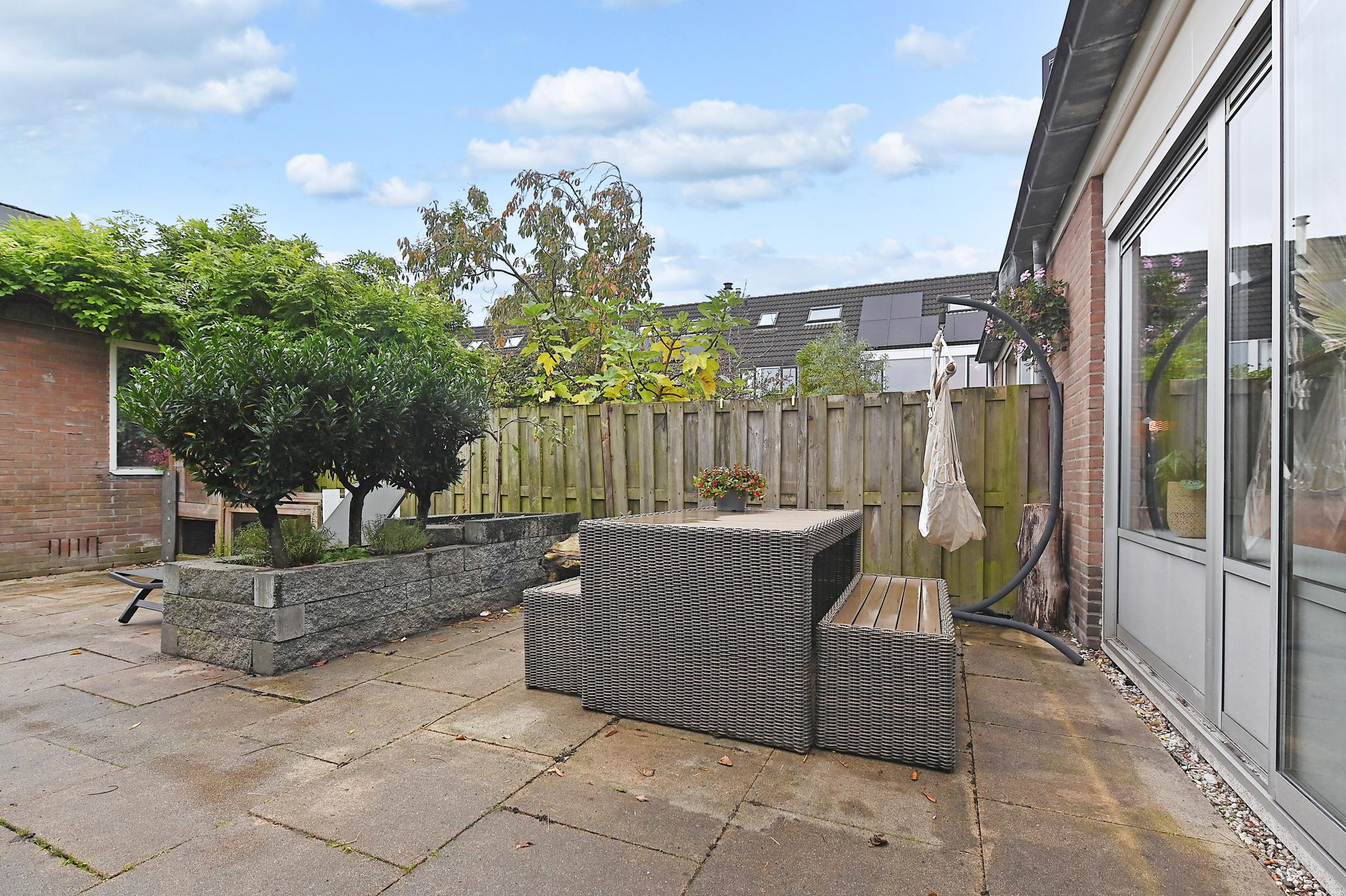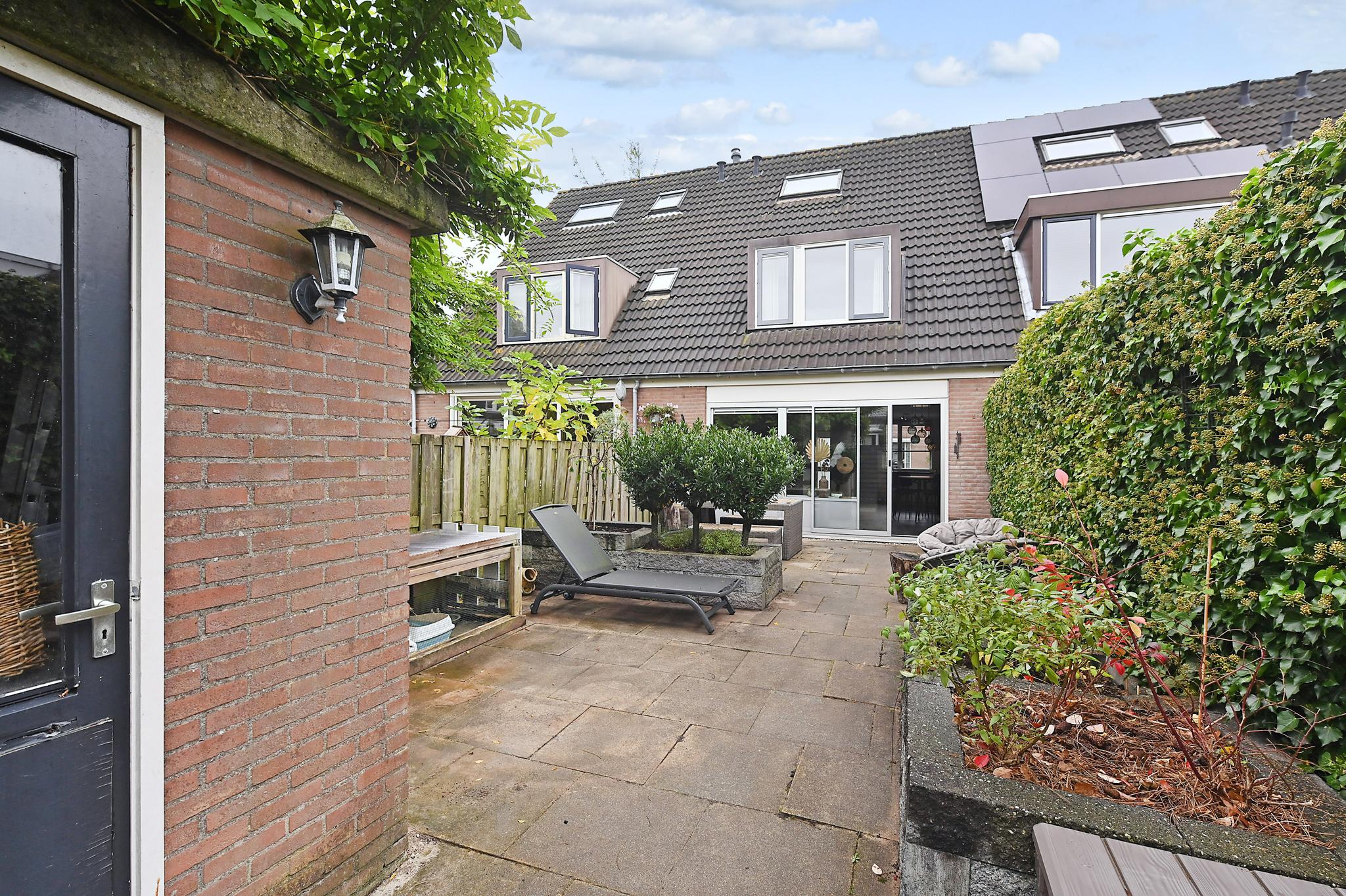 Vanuit de woonkamer kom je via de schuifpui in de achtertuin. Deze is netjes aangelegd met sierbestrating en groene borders. Achterin de tuin bevindt zich een praktische stenen berging met elektra.