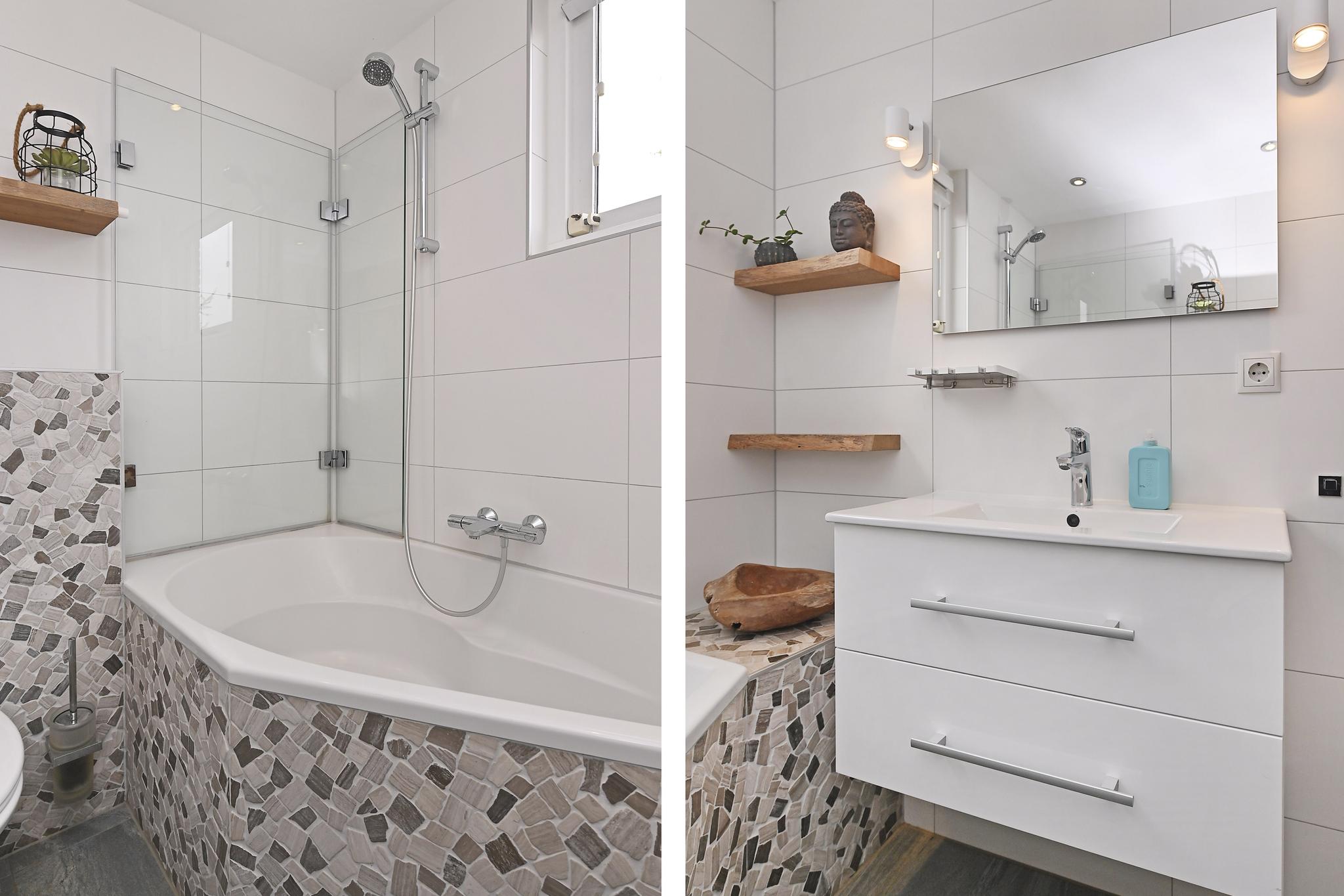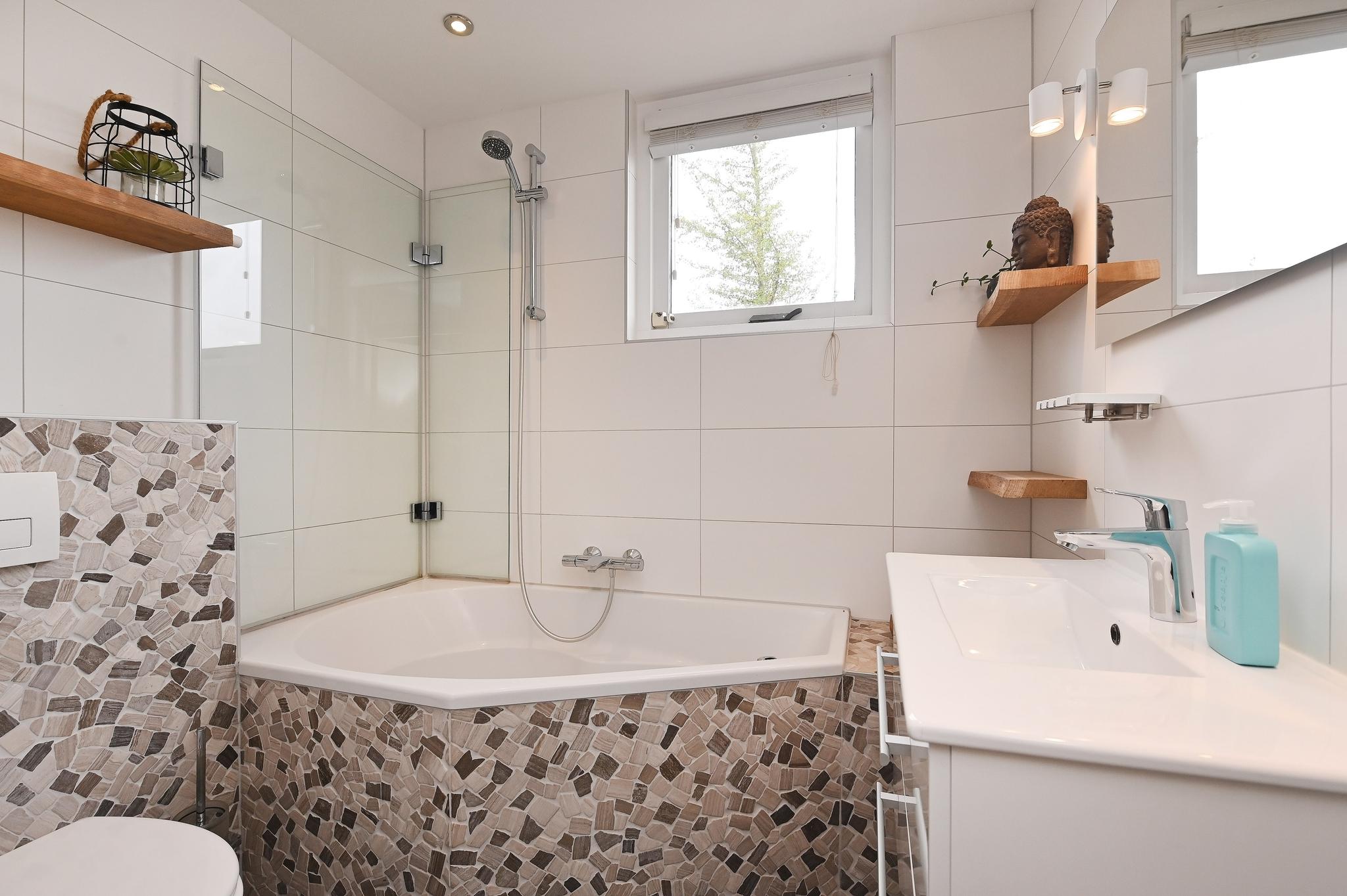 De moderne badkamer is van alle gemakken voorzien: een heerlijk ligbad met douche, een toilet, een stijlvol wastafelmeubel en een designradiator.