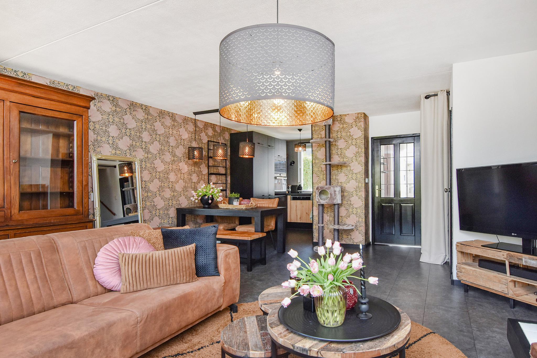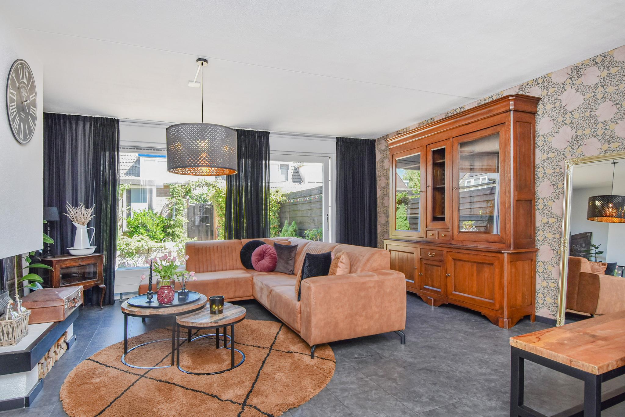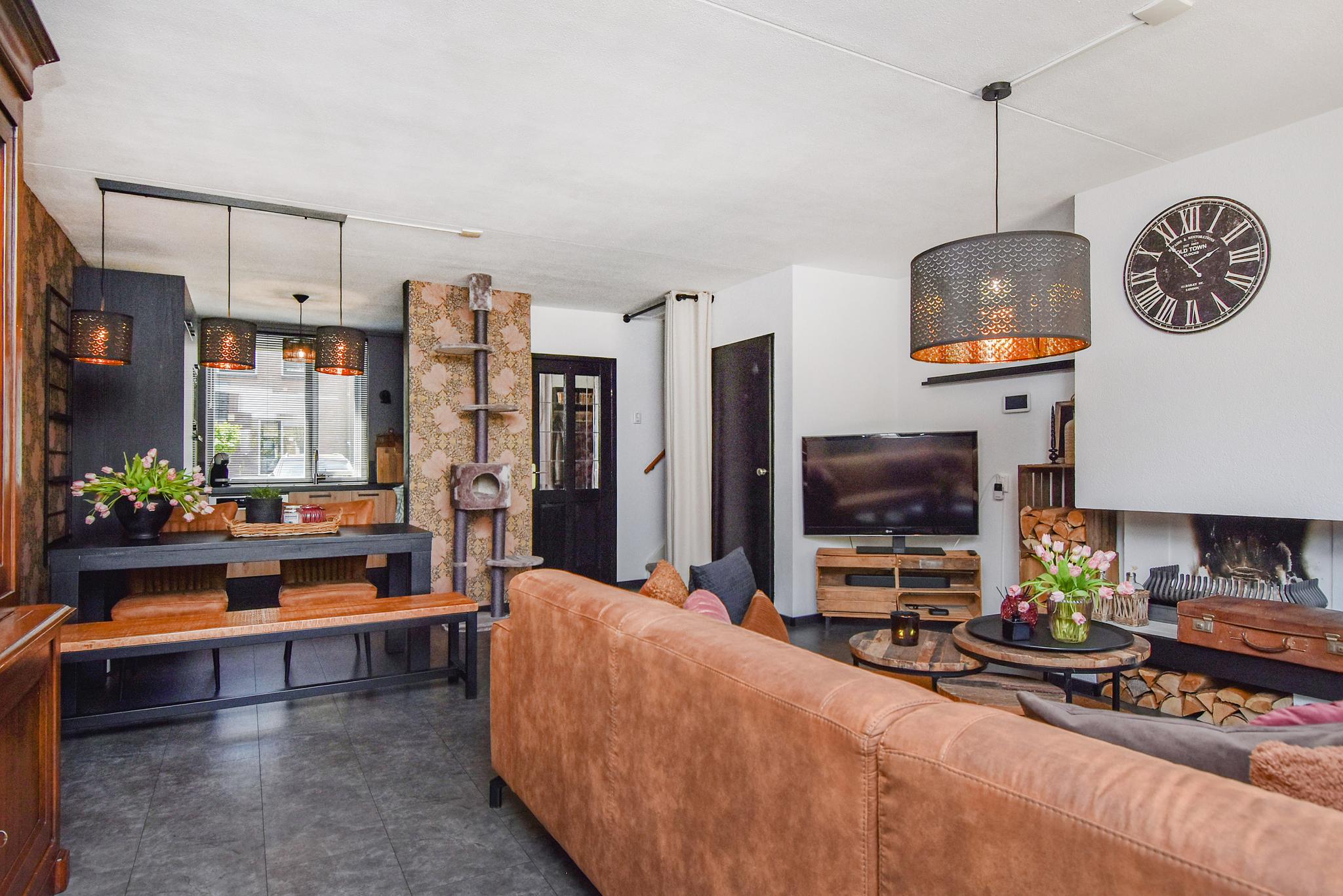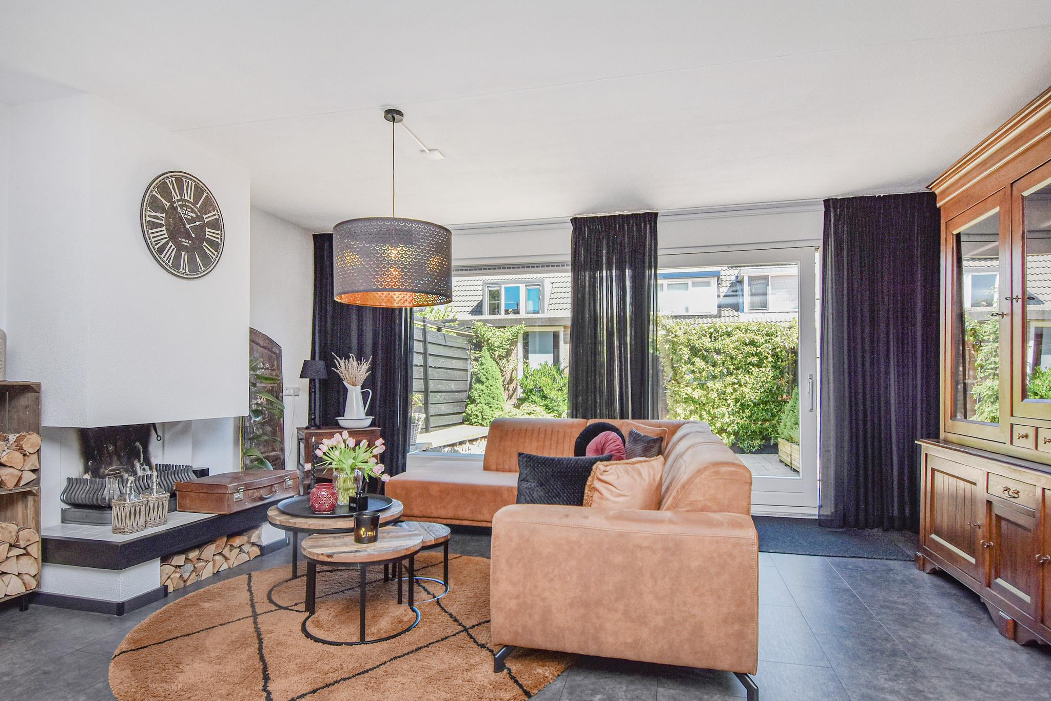 Woonkamer: Tuingerichte woonkamer met een gezellige open haard, mooie vloerafwerking, nieuwe binnendeur en veel lichtinval door de grote schuifpui over de gehele breedte.