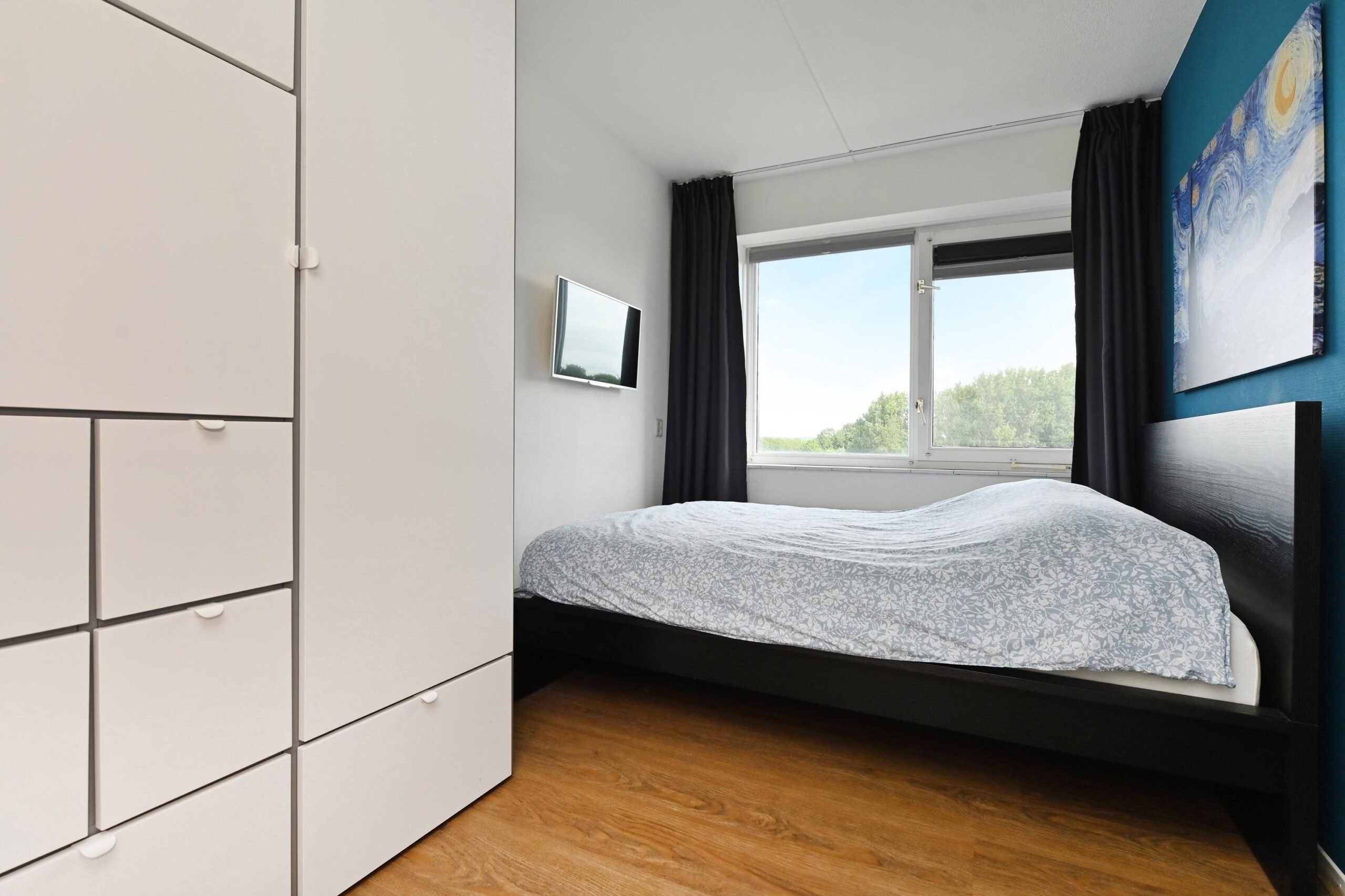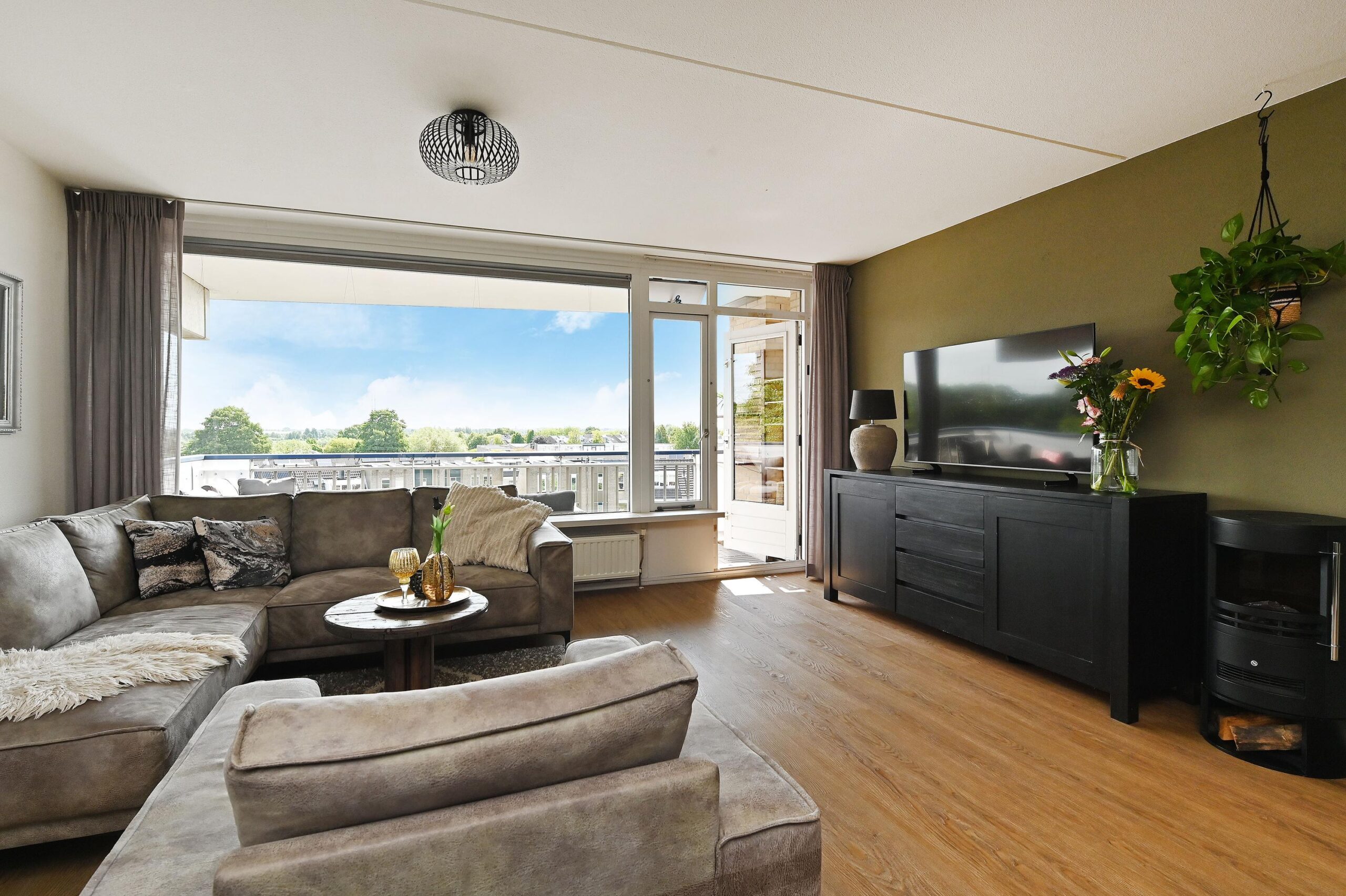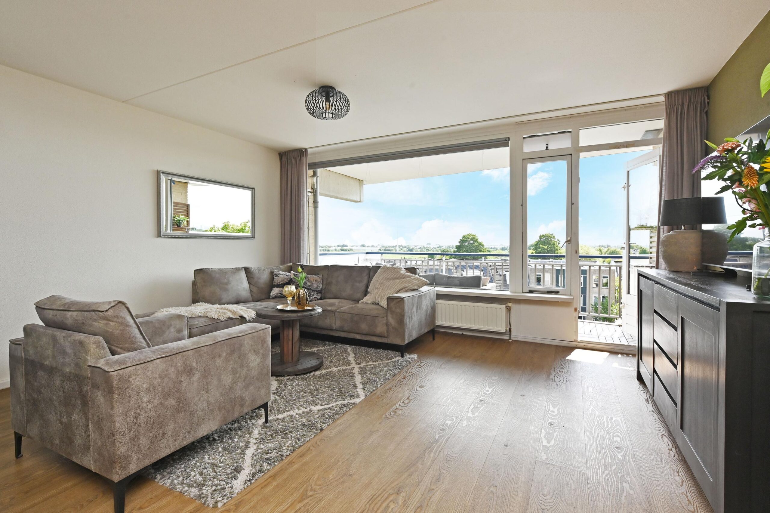 Op de bovenste, 4e verdieping ligt dit ruime appartement, waar een prachtig uitzicht en een keurige afwerking samenkomen. De grote raampartijen zorgen voor een overvloed aan licht, waardoor de living en open keuken een uitnodigende en warme uitstraling hebben. Vanaf het zonnige balkon op het zuidoosten strekt het uitzicht zich ver uit over de groene en ruim opgezette omgeving.