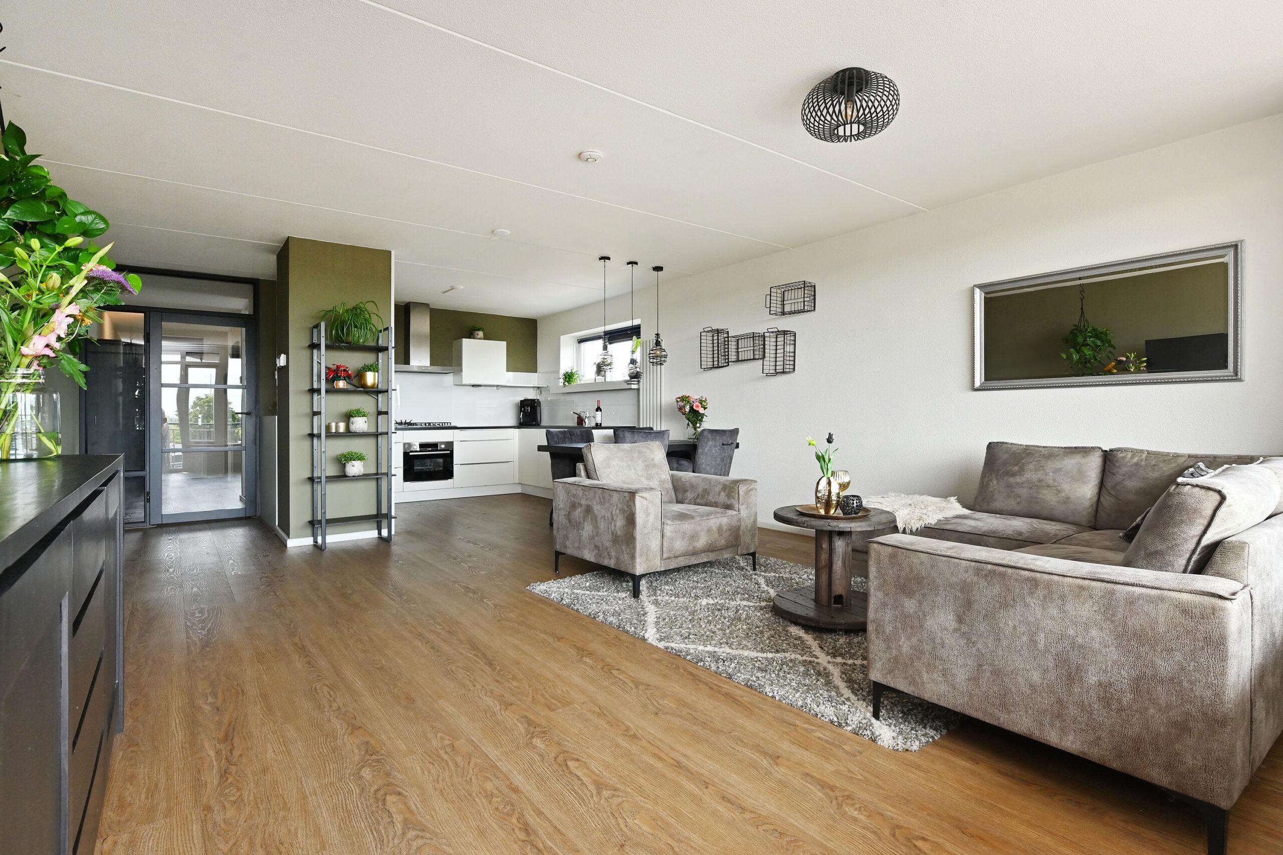 De lichte woonkamer vormt samen met de moderne open keuken het hart van de woning.