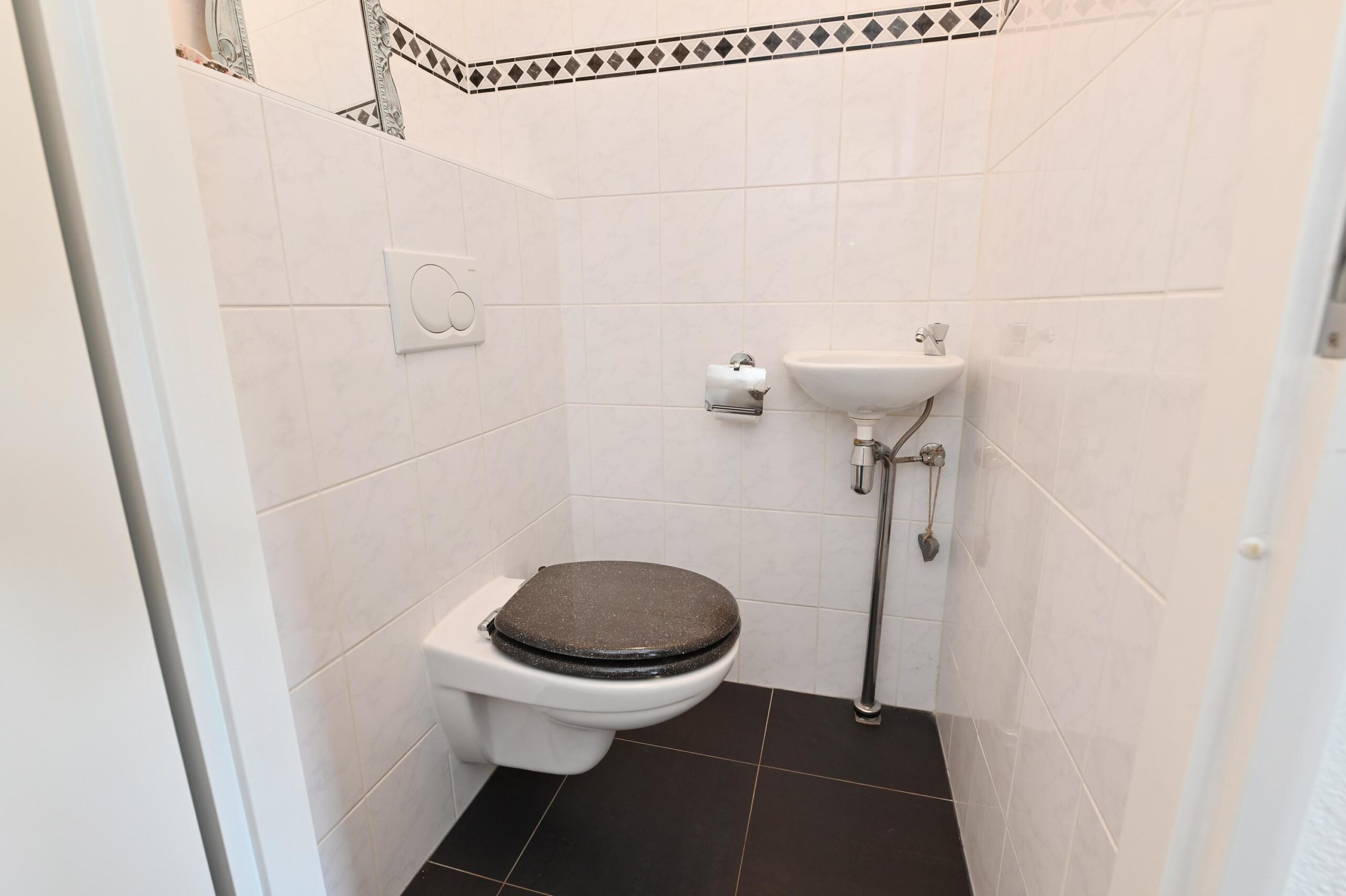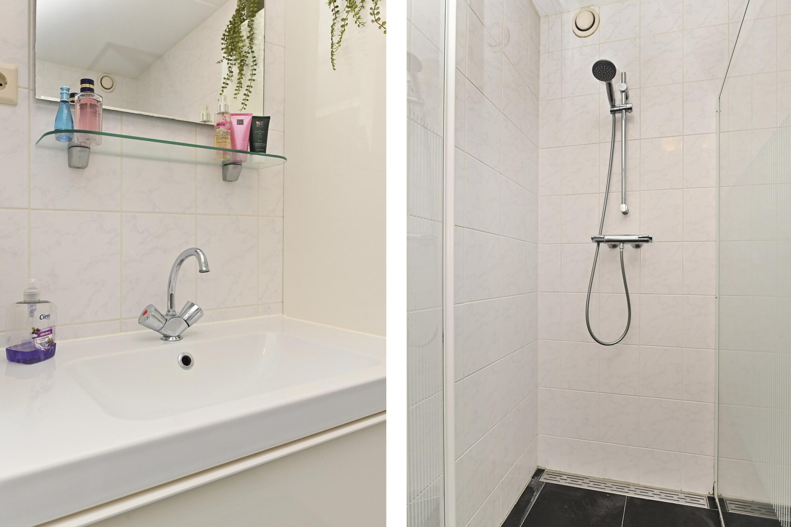 De badkamer is keurig afgewerkt met een douche en wastafelmeubel, terwijl het toilet met fonteintje apart is gesitueerd. Een praktische berging/wasruimte, met plaats voor de cv-ketel, maakt het geheel compleet.