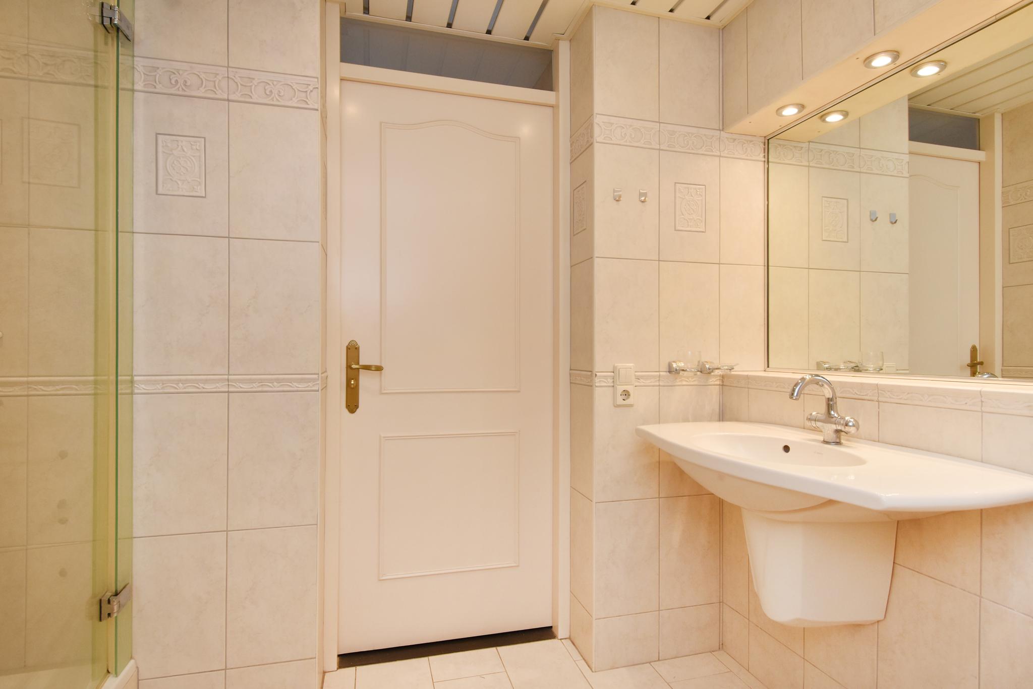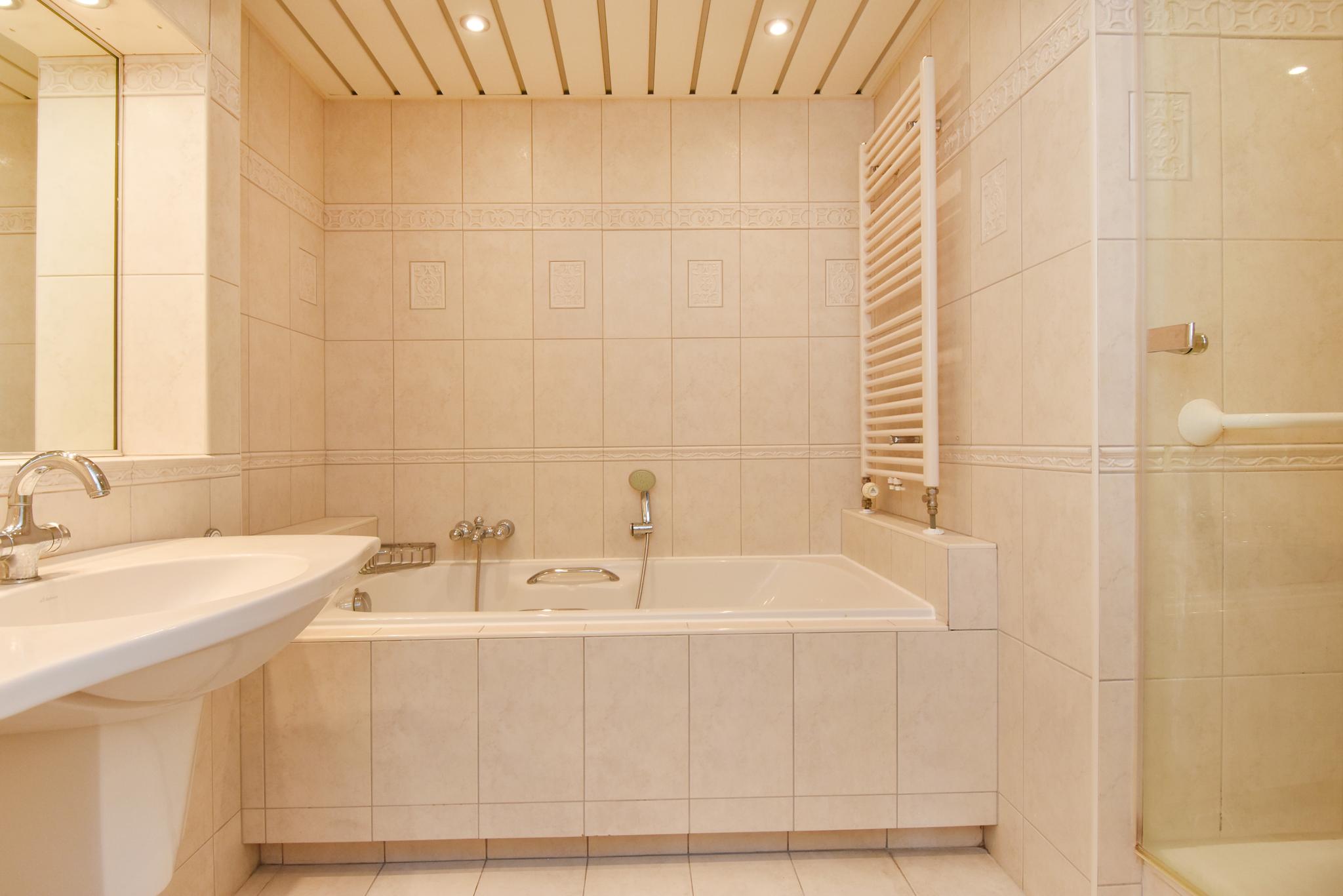 Badkamer: de badkamer is ruim en v.v. een ligbad, douche en wastafelmeubel.