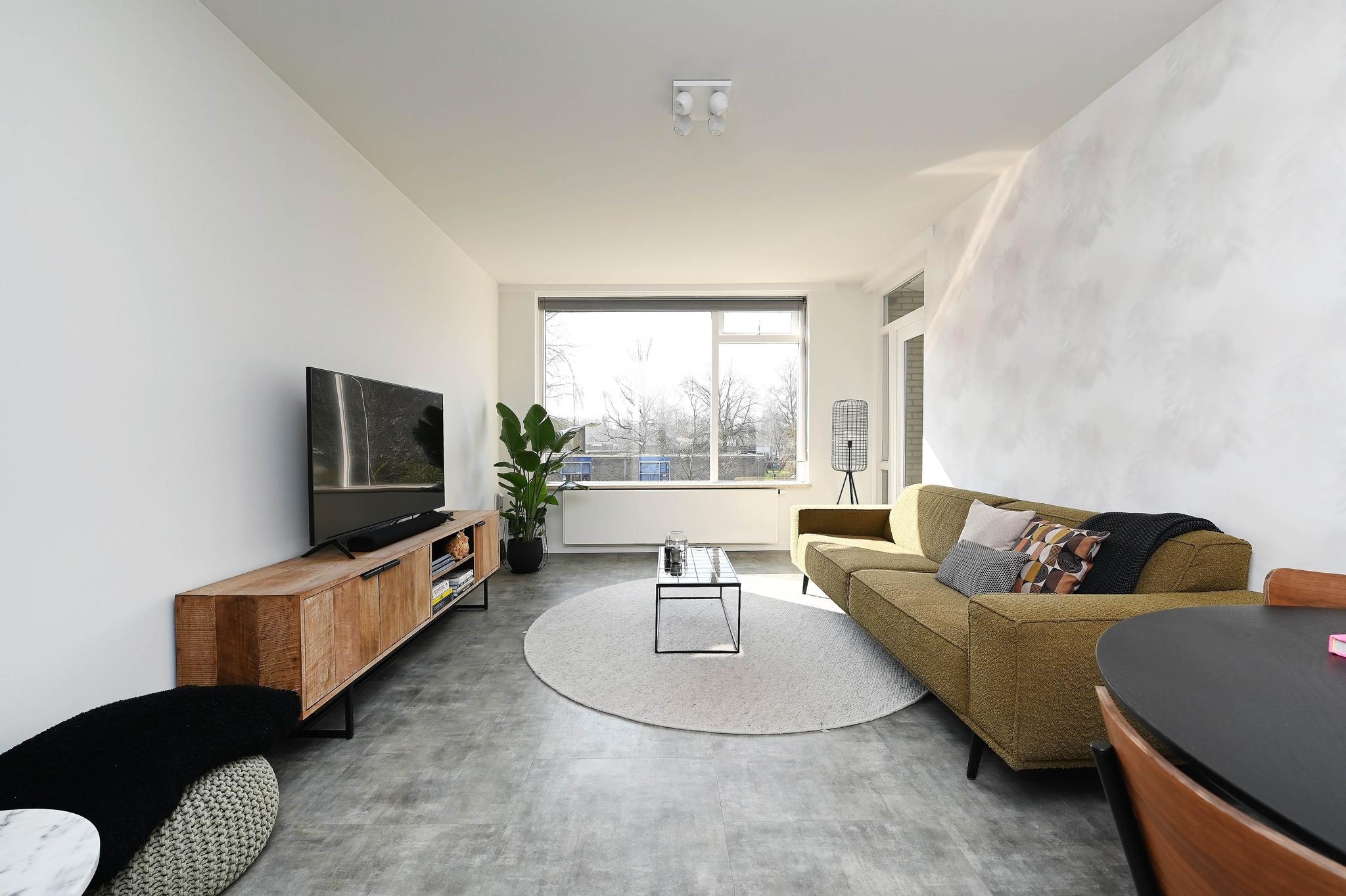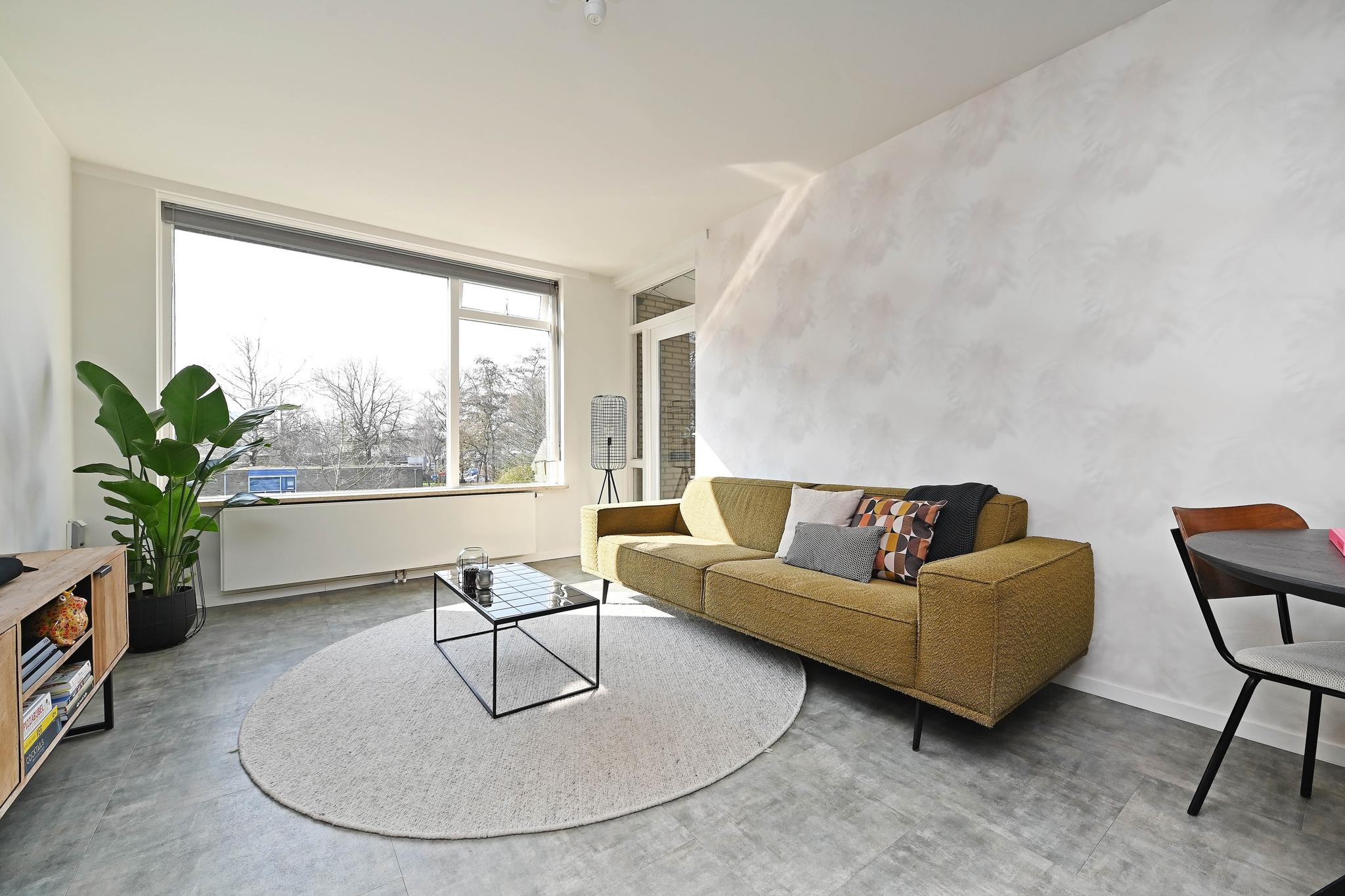 Eerste etage: Welkom, kom binnen! Met de trap is de 1e woonverdieping bereikbaar. Bij binnenkomst word je verwelkomd in de kleine hal met garderoberuimte. De woonkamer heeft prettig veel lichtinval en biedt vrij uitzicht op achtergelegen groen en voorgelegen straatzijde. Het balkon aan de achterzijde is op het zonnige zuidwesten en bereikbaar via de woon- en slaapkamer.