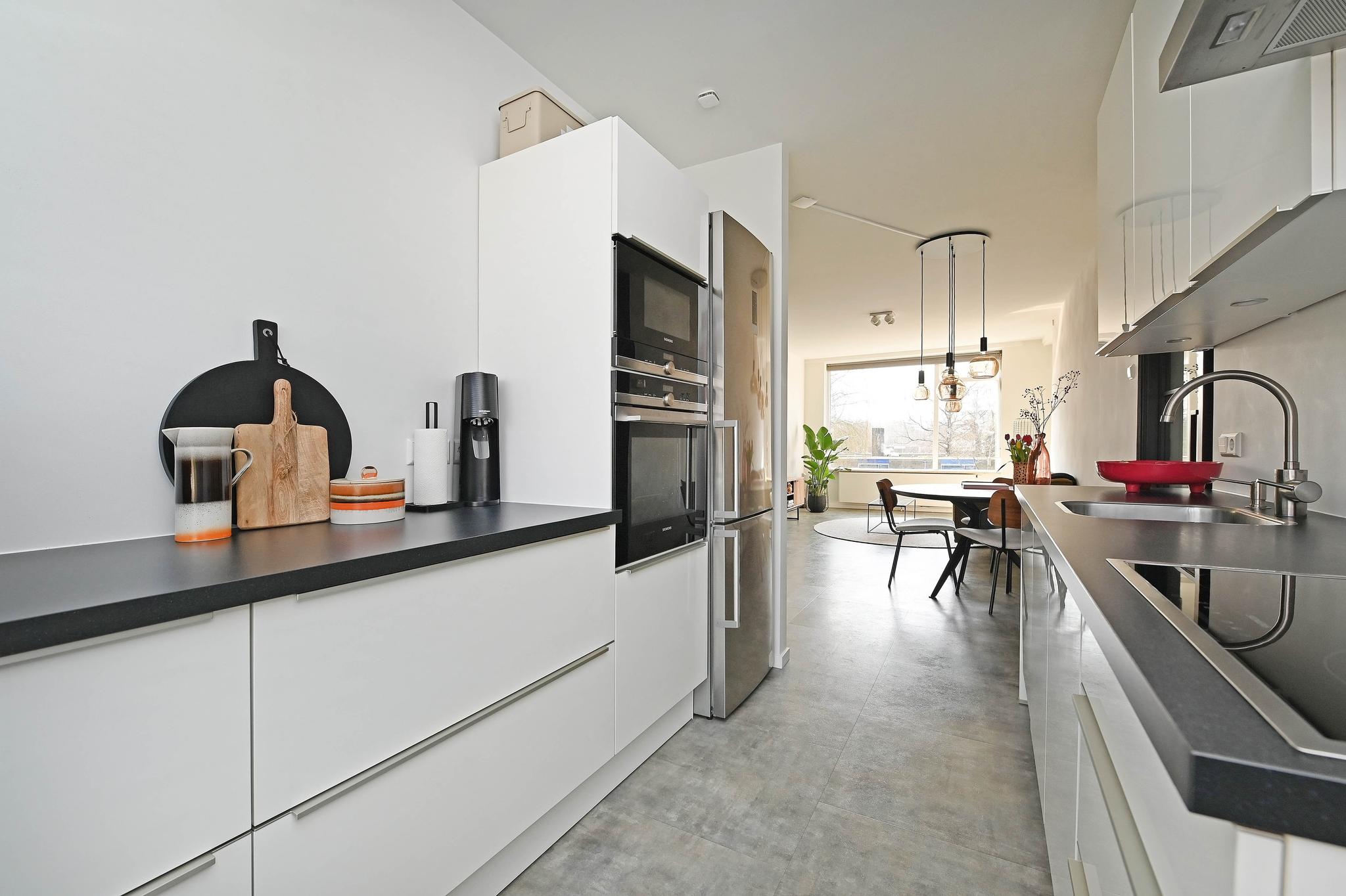 Wat een fijne keuken! Aan de voorzijde is de moderne keuken, van alle gemakken voorzien, te weten een vaatwasser, combi oven/magnetron en inductiekookplaat. Via de keuken is het balkon toegankelijk. Geniet hier van de ochtend zon met een kopje koffie.