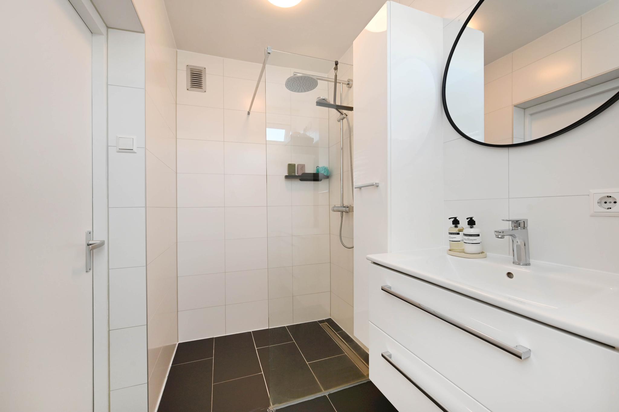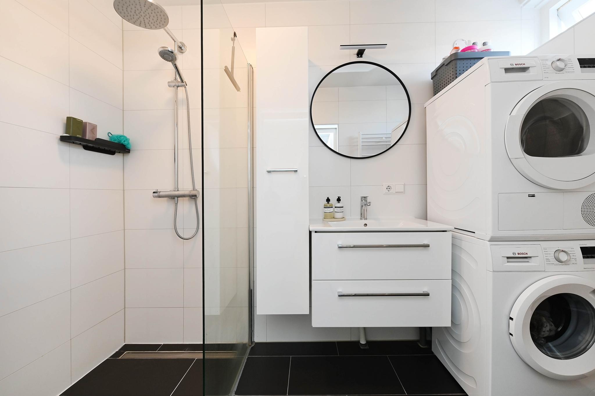 De badkamer is voorzien van een fraaie douchehoek, wastafelmeubel met extra kastruimte en een aansluiting voor de wasmachine. Het toilet is separaat.