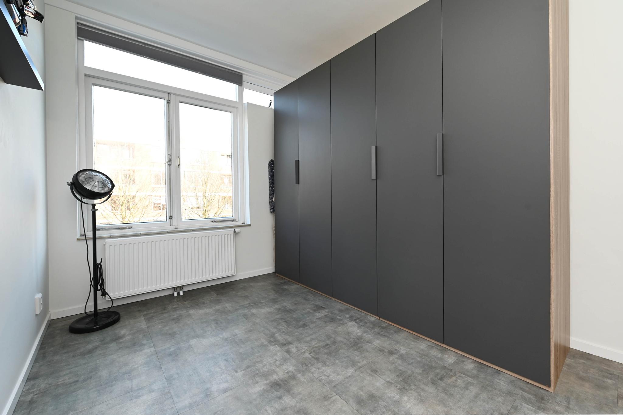 Aan de voorzijde is een grote slaapkamer met een vaste kast. De 2e slaapkamer is vergroot door het samentrekken van 2 slaapkamers. Indien wenselijk is het vrij eenvoudig terug te brengen naar de oude situatie aangezien de deuren in tact zijn gebleven. Tevens vanuit de grote slaapkamer direct toegang tot het balkon. In de woning zijn diverse vaste inbouwkasten.