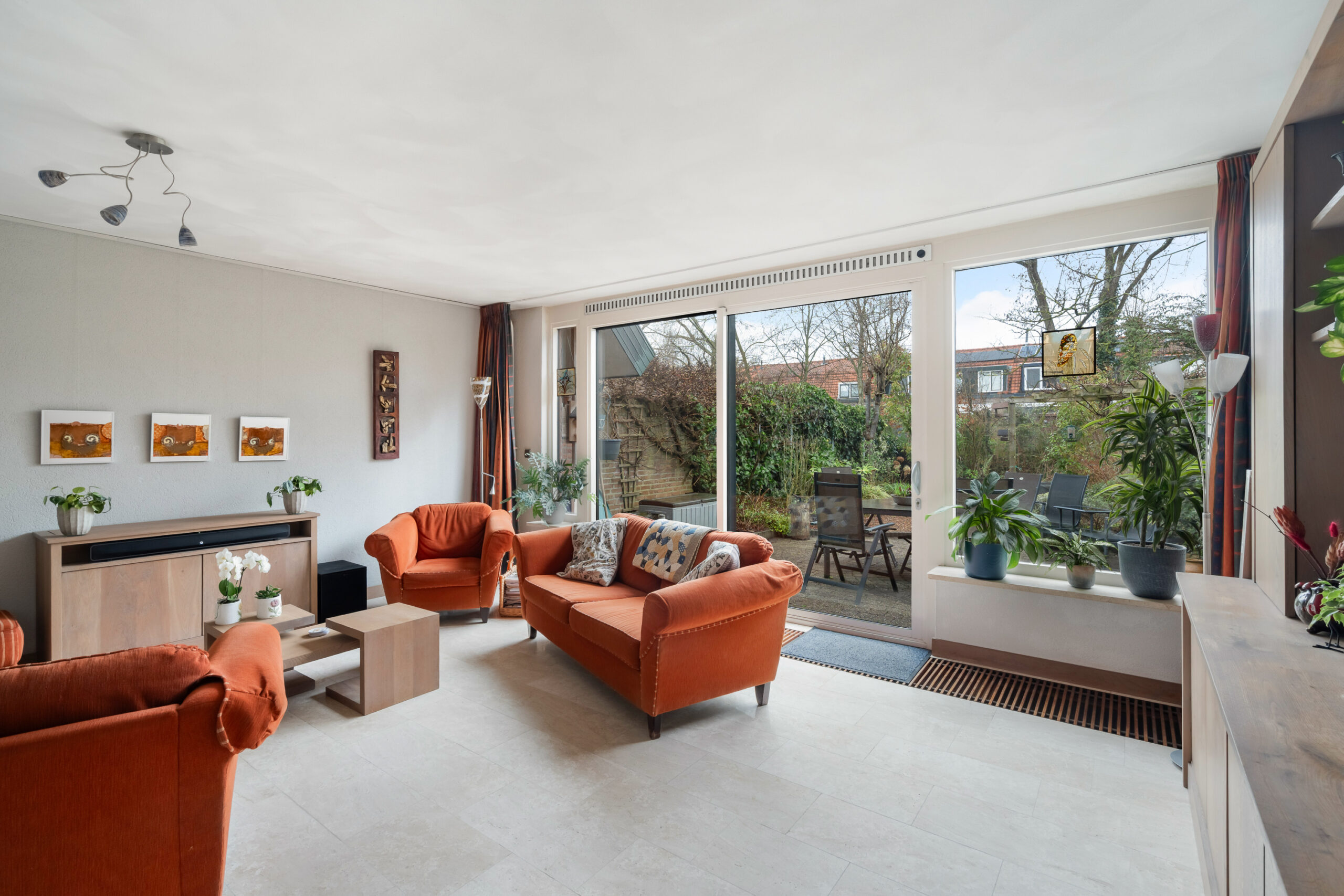Wauw wat een ruimte! De living is ruim opgezet en biedt volop mogelijkheden voor een comfortabele zit- en eethoek, rondom de sfeervolle houtkachel. Dankzij de grote schuifpui is er een fraai uitzicht op het groen.