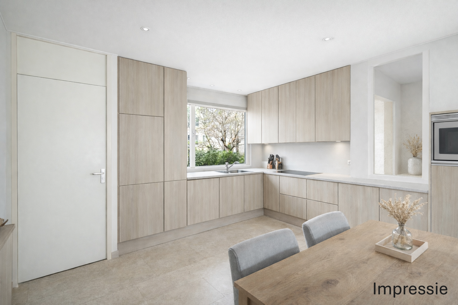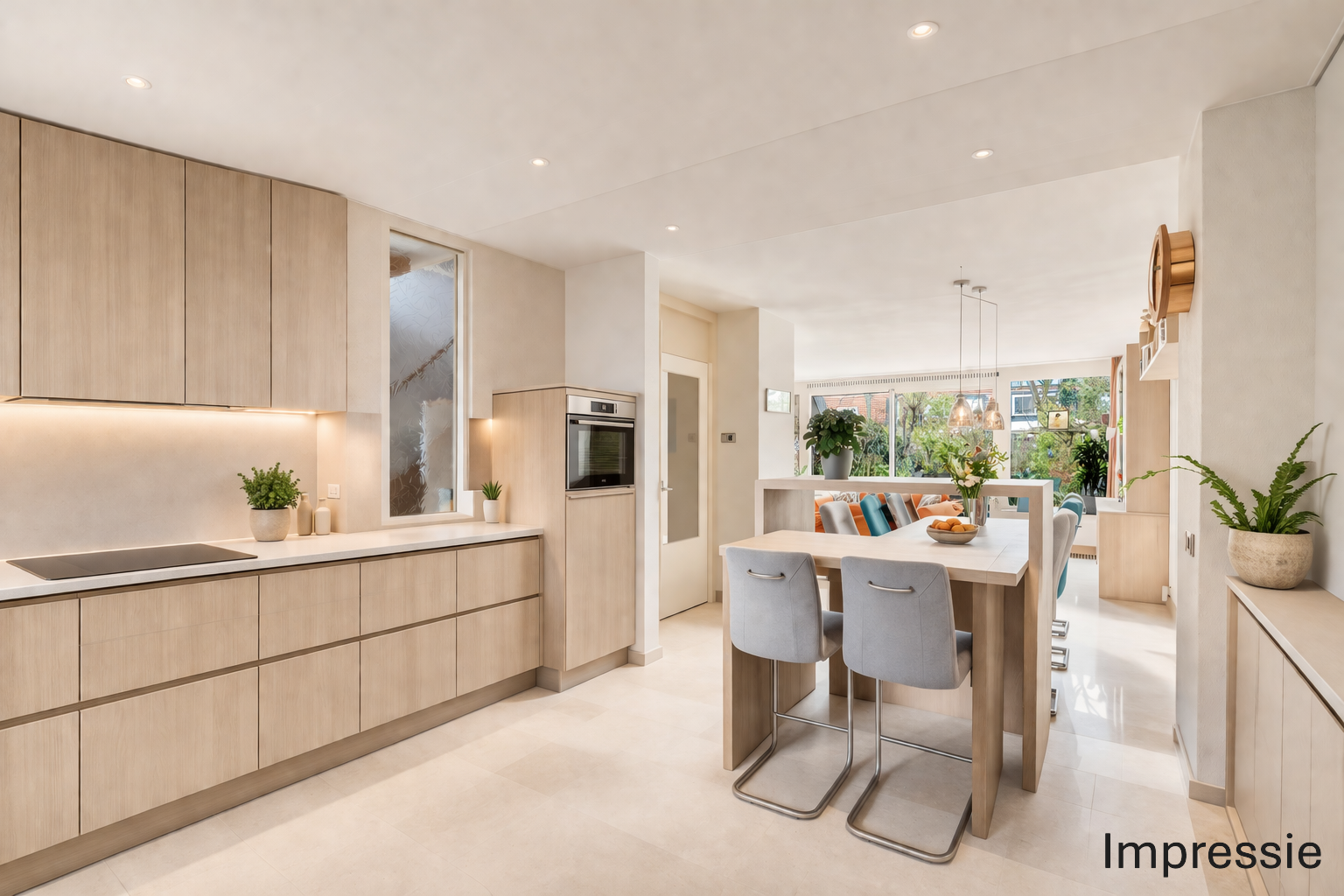 De keuken staat in verbinding met de woonruimte. Aan de voorzijde bevindt zich een praktische bijkeuken met een wasmachineaansluiting. Perfect voor extra opslag, witgoed, provisie én de fietsen.