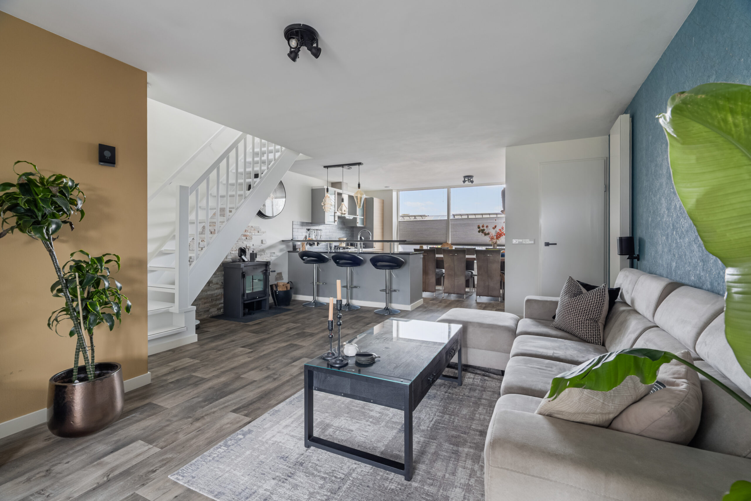 Entree/gang met meterkast, royale living opgedeeld in een open keuken aan de voorzijde. De keuken is op een praktische manier ingericht en optisch gescheiden van de woonkamer met een verhoogd aanrechtblad. Keuken is circa 8 jaar oud, de Quooker en koelkast/vriezer zijn 2 jaar oud. Een goed functionerende houtkachel zorgt letterlijk voor warmte en natuurlijk ook voor de gezelligheid. Grote zithoek aan de achterzijde, met schuifpui naar de achtertuin. De tuin is mooi aangelegd en is op het zonnige westen gesitueerd. Ruim toilet met fonteintje. Grote inloop-/bergkast. Open trap naar de slaapverdieping.