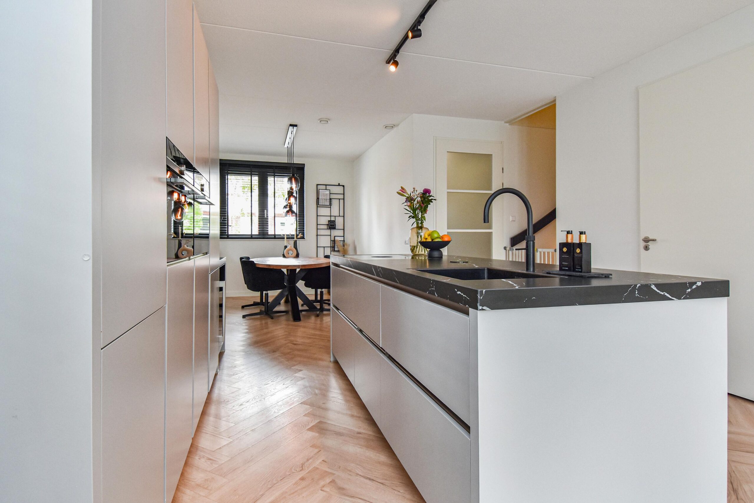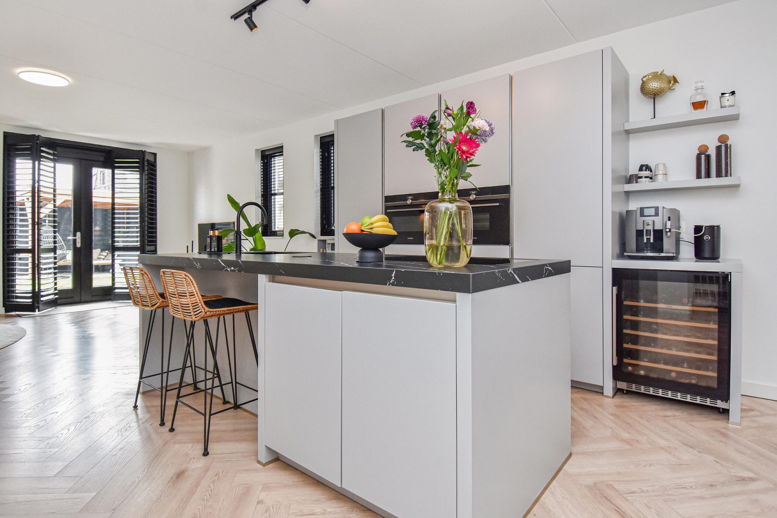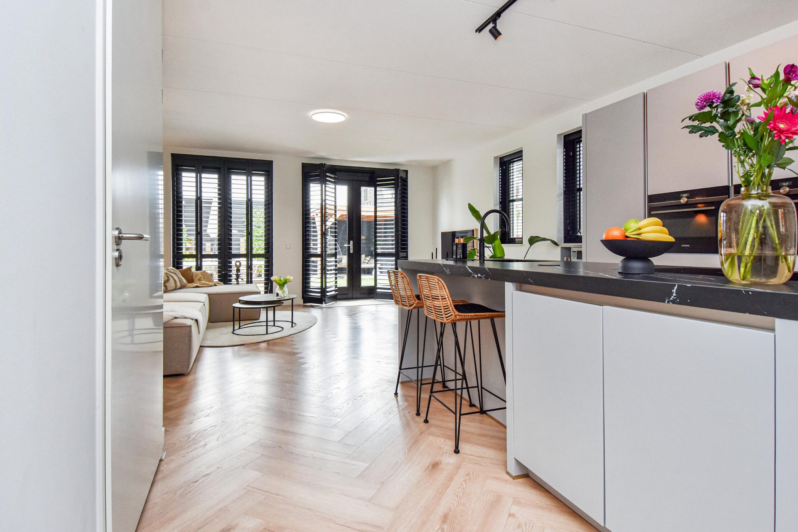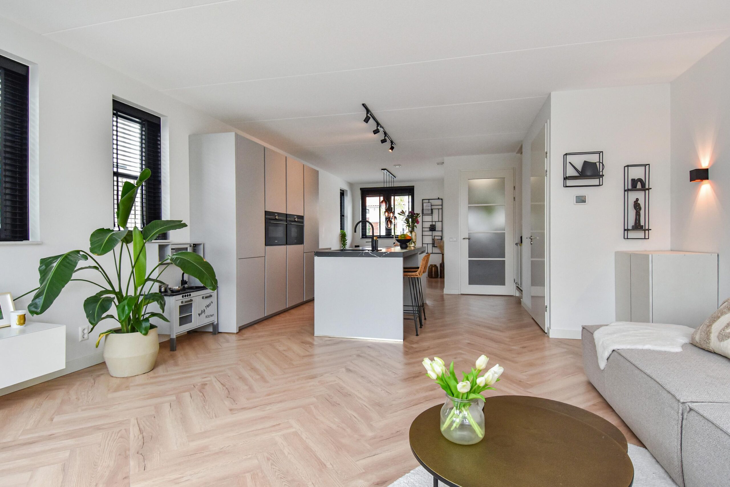 Binnen stap je een uitgebouwde woonkamer binnen, waar natuurlijk licht en sfeer samenkomen. De luxe open keuken met groot kookeiland is een ware eyecatcher – ideaal voor kookliefhebbers en gezellige diners. Een visgraat vloer en strakke wandafwerking maken het plaatje compleet.