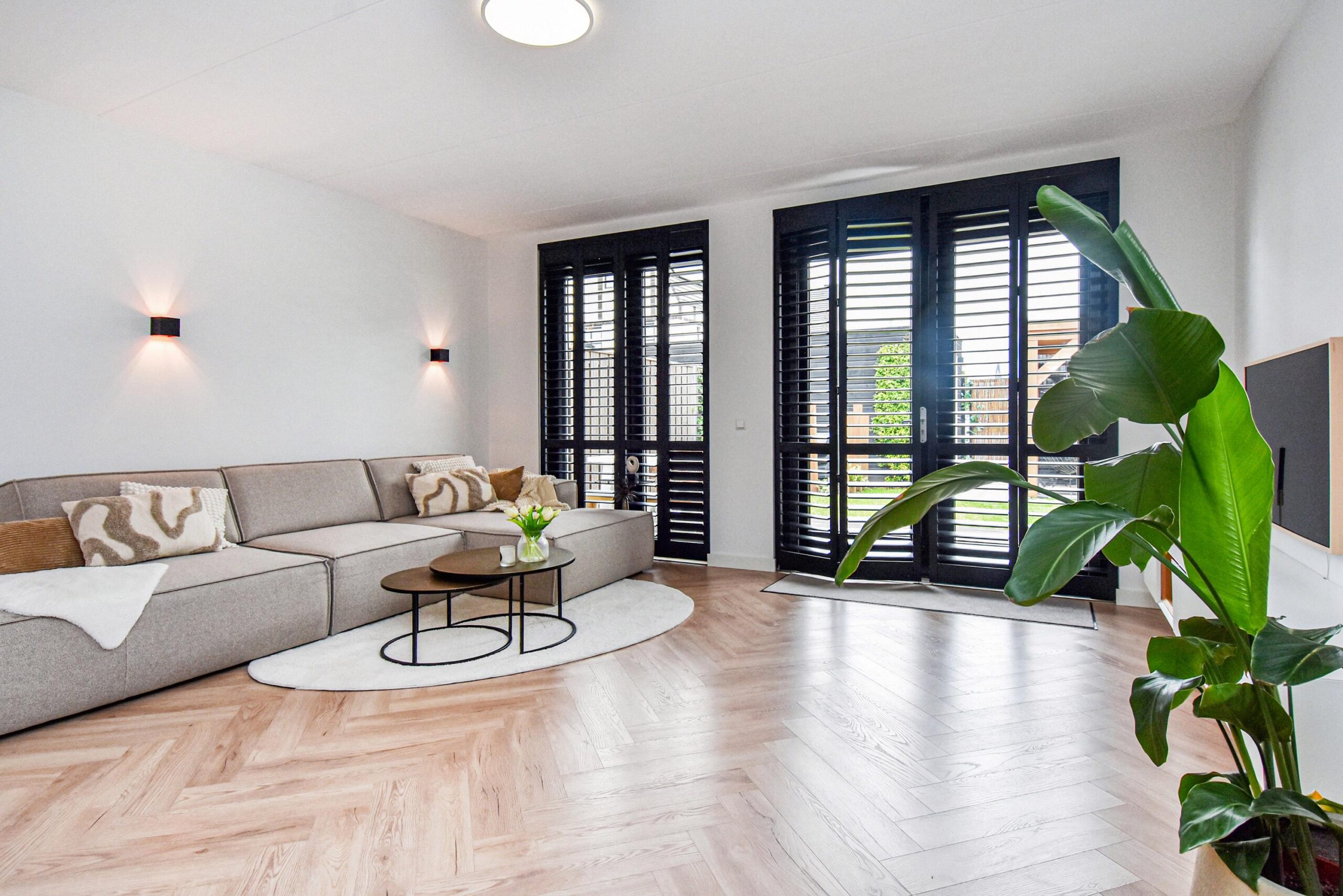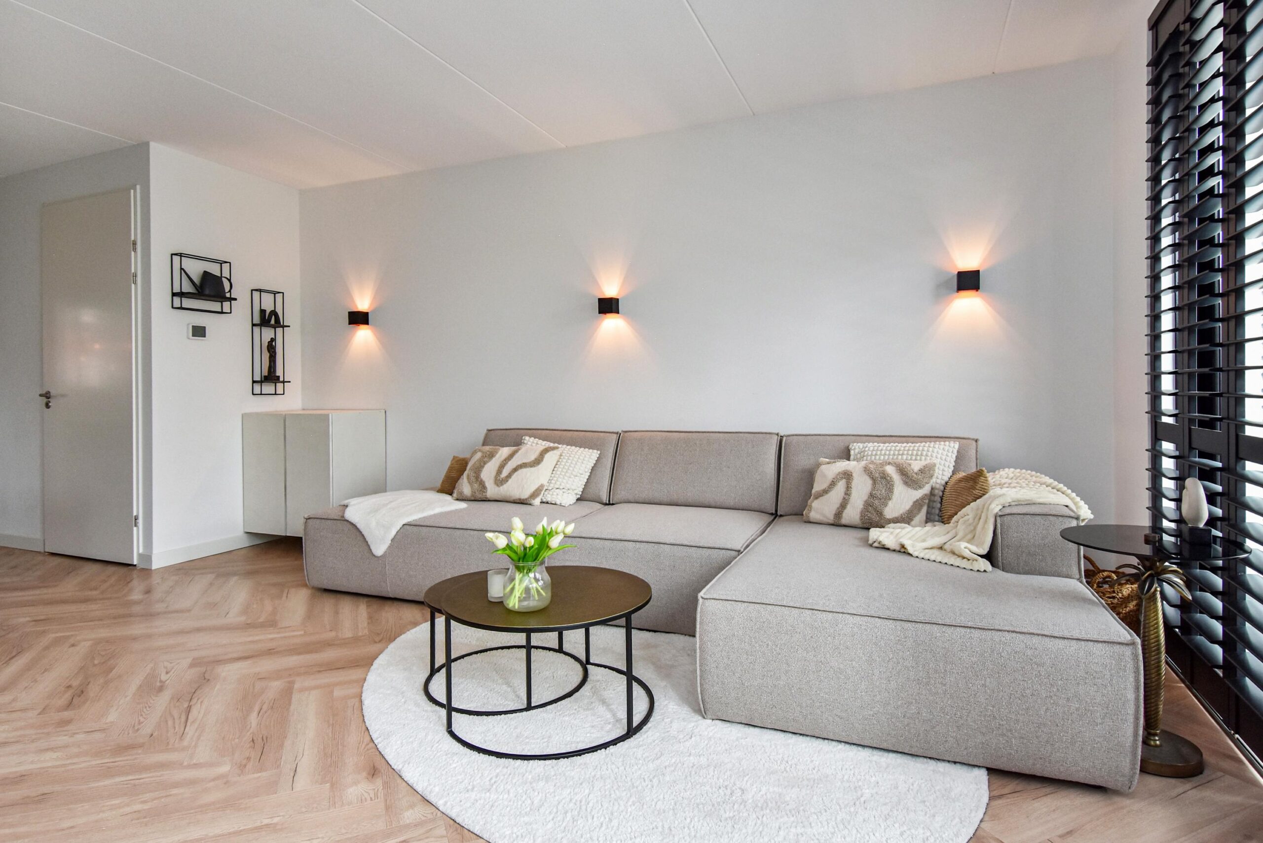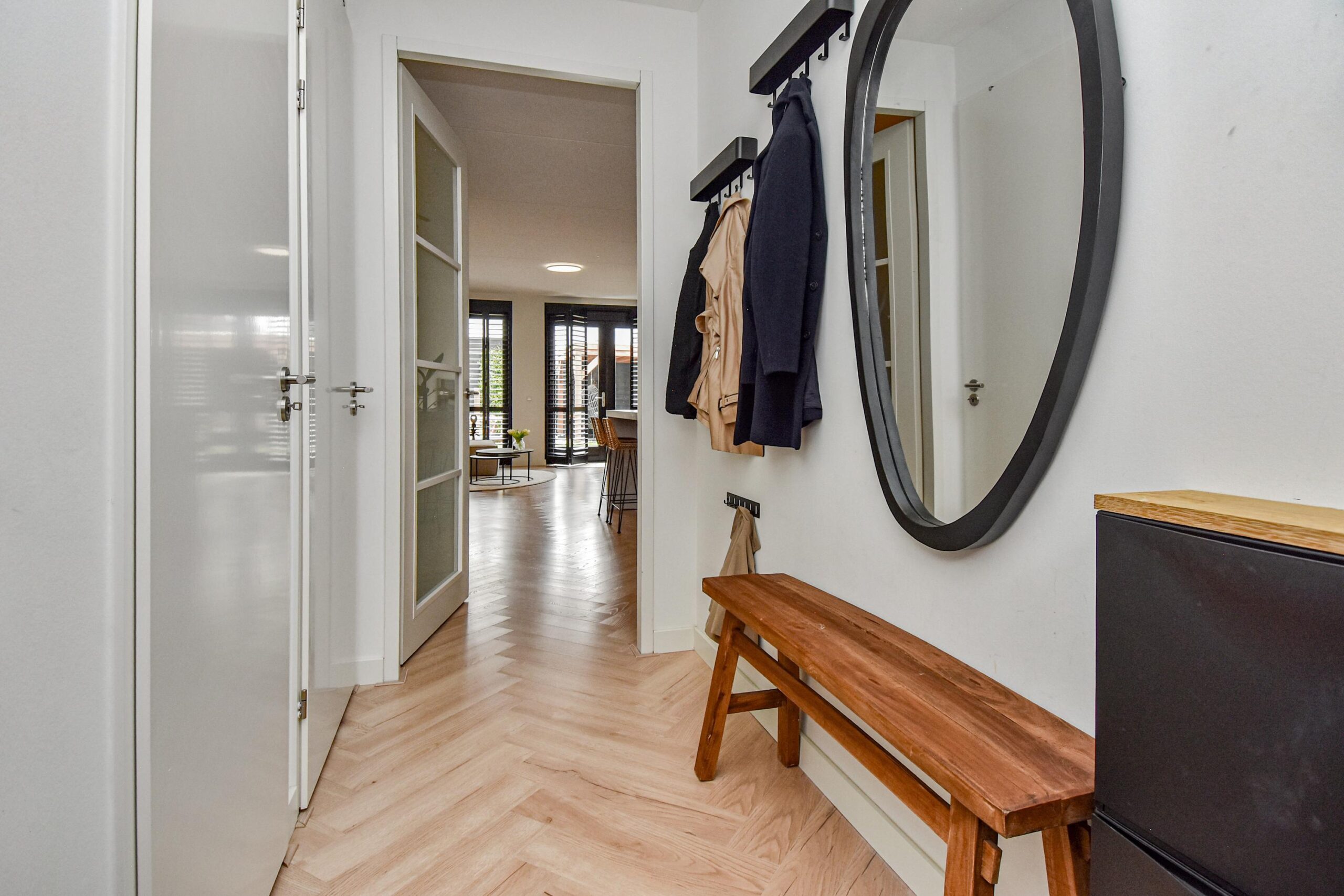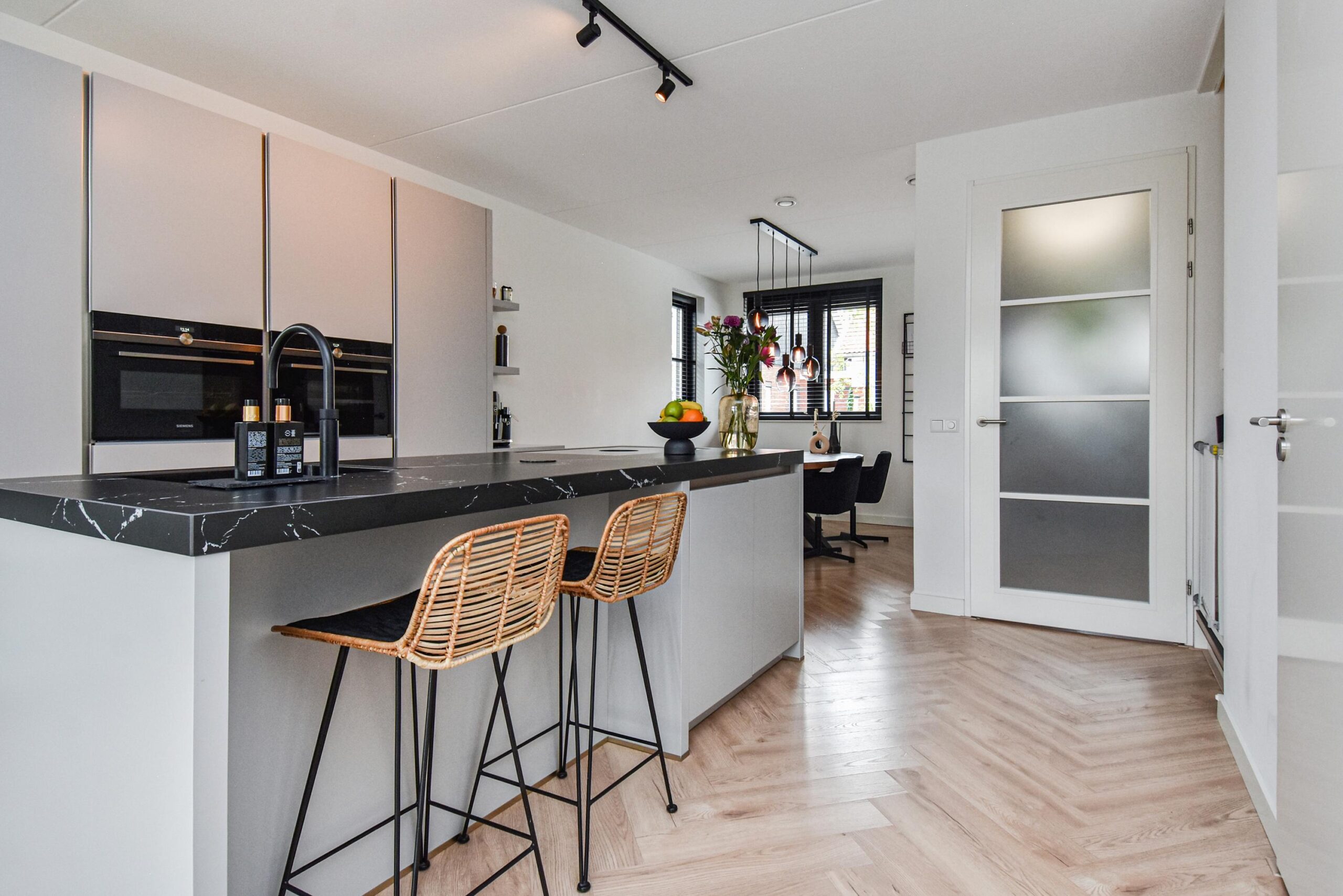 Binnen stap je een uitgebouwde woonkamer binnen, waar natuurlijk licht en sfeer samenkomen. De luxe open keuken met groot kookeiland is een ware eyecatcher – ideaal voor kookliefhebbers en gezellige diners. Een visgraat vloer en strakke wandafwerking maken het plaatje compleet.