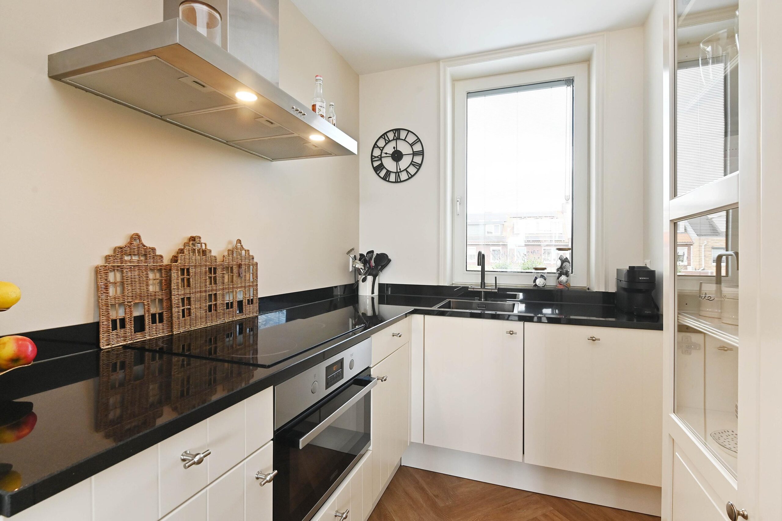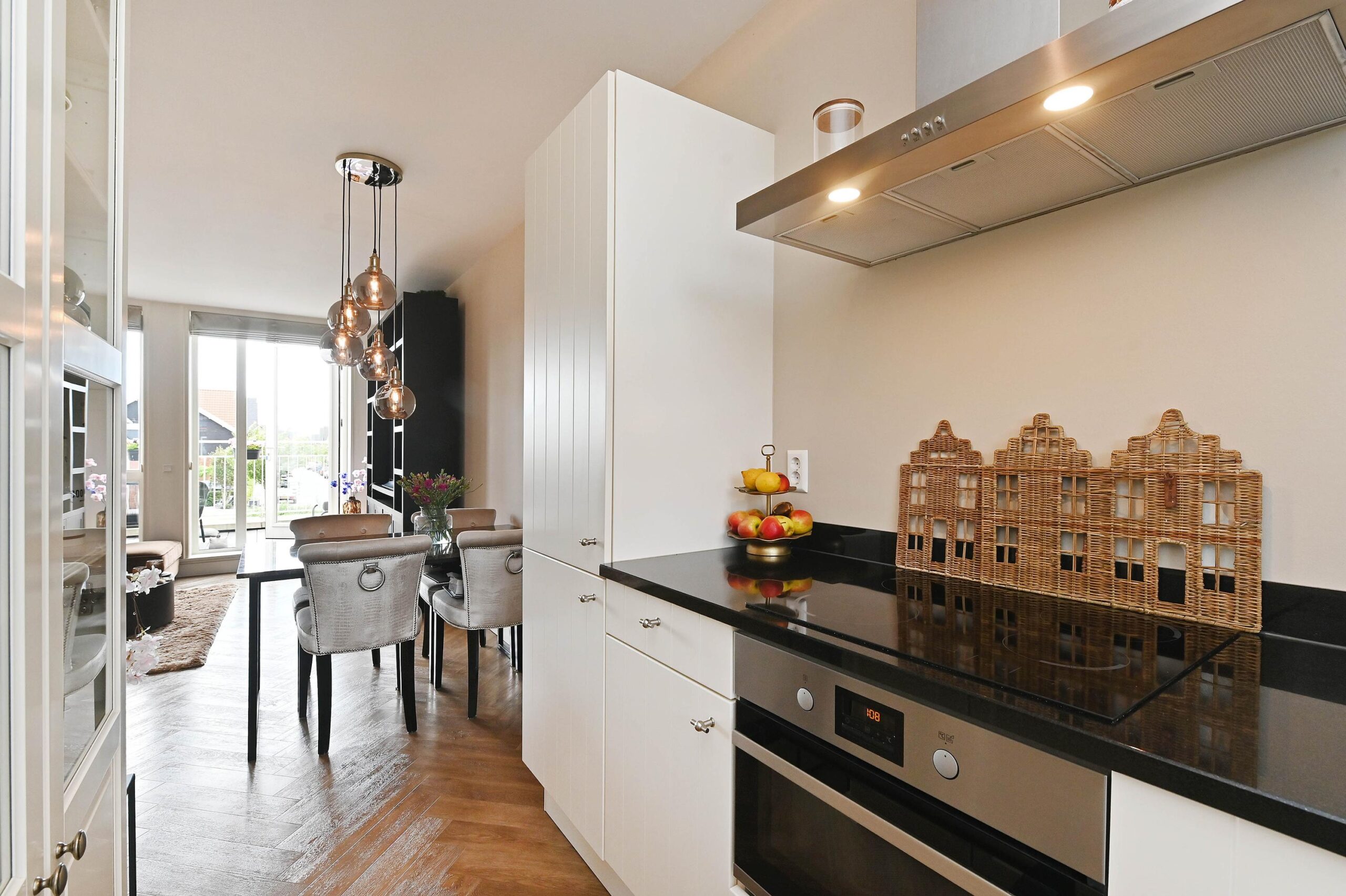 Aan de voorzijde is de open keuken, compleet ingericht met diverse inbouwapparatuur, te weten een Quooker, inductiekookplaat, koelkast, vriezer, vaatwasser en combi-oven.
