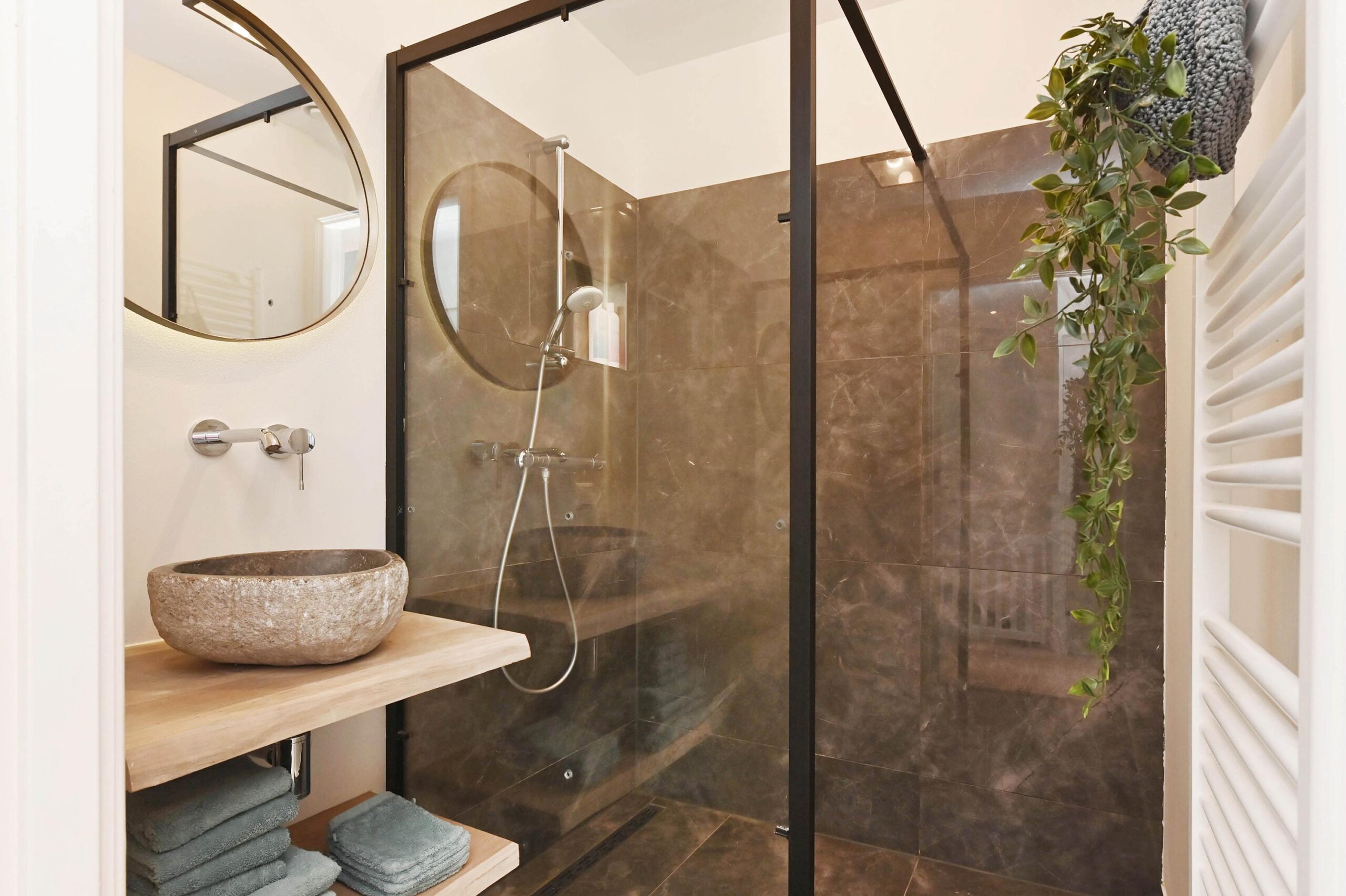 De badkamer is ingericht met een inloopdouche en wastafel met natuurstenen waskom, een echt wellness gevoel!