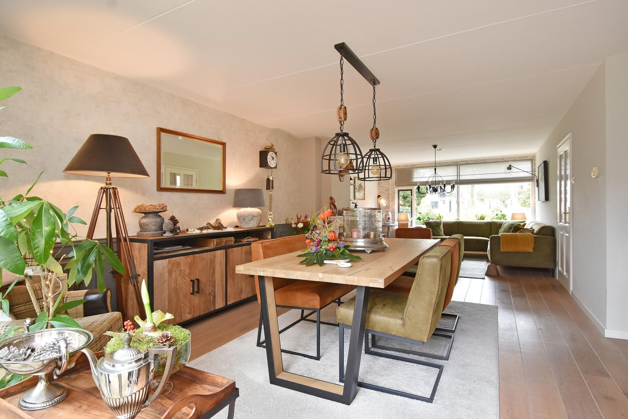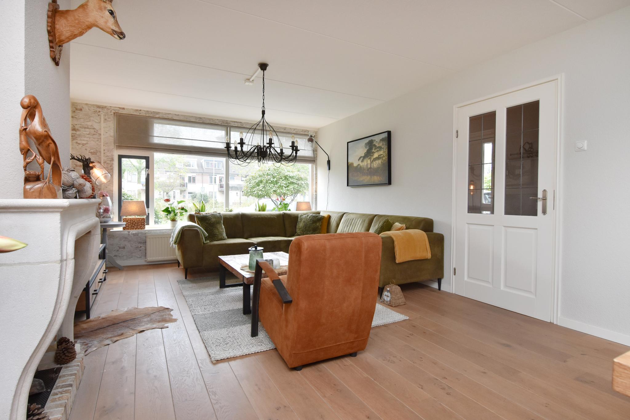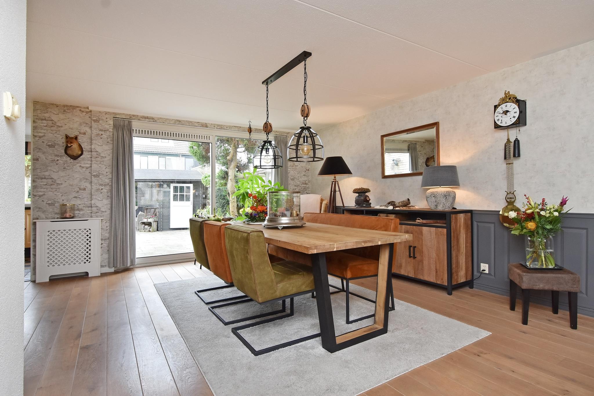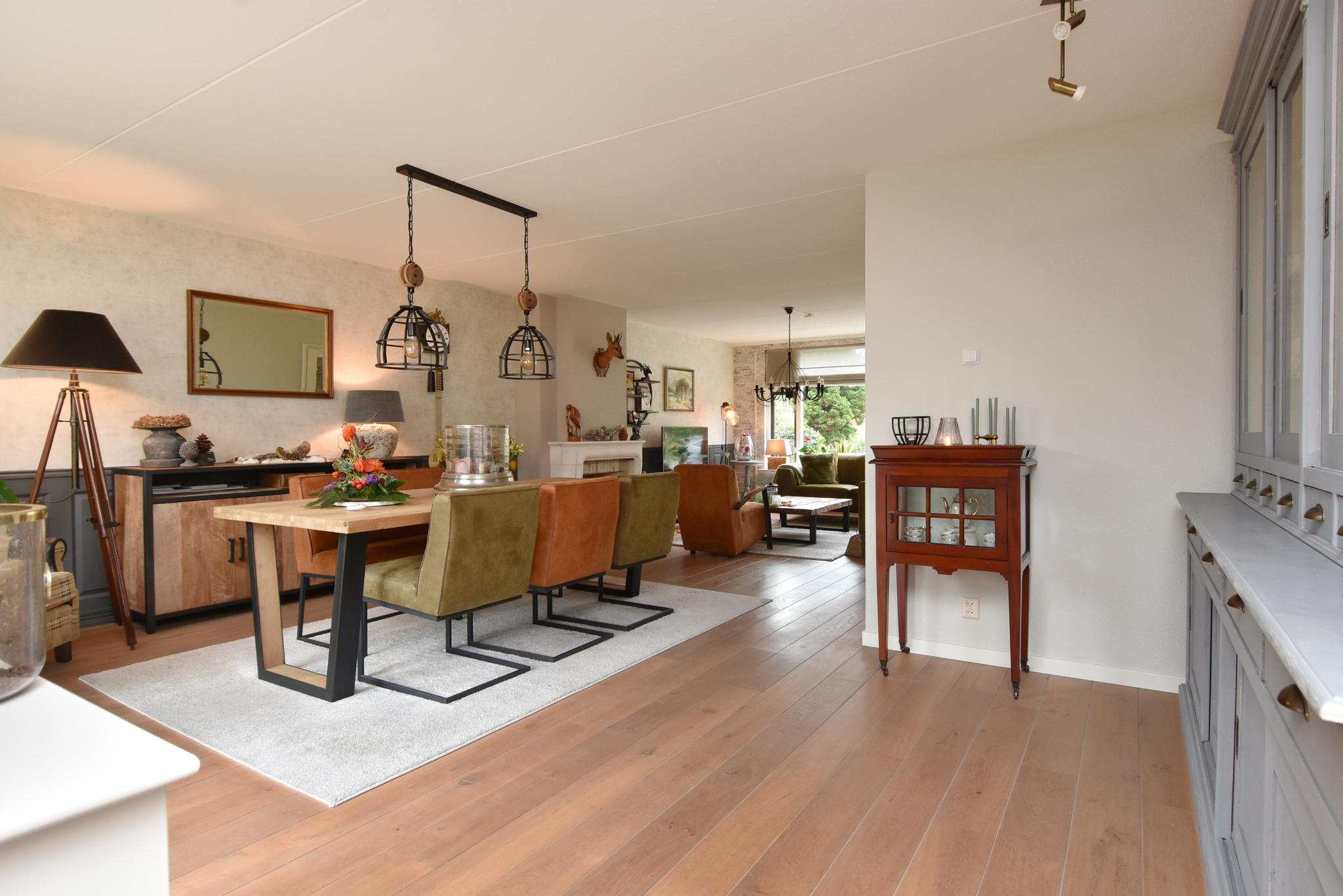 Woonkamer: een echt ruime woonkamer met massief houten vloer. Veel lichtinval door zowel de grote raampartijen aan de voorzijde als schuifpui aan de achterzijde. Vanuit de woonkamer een open verbinding naar de keuken.