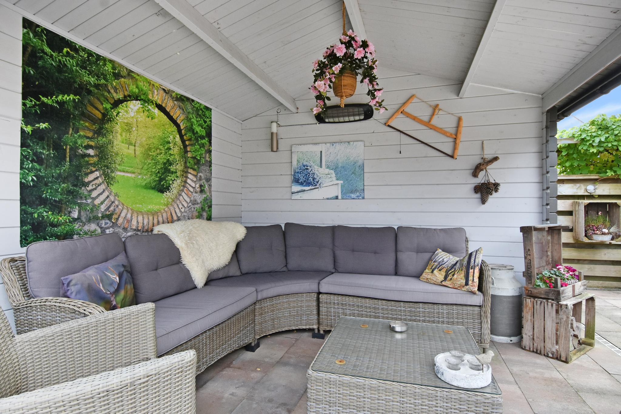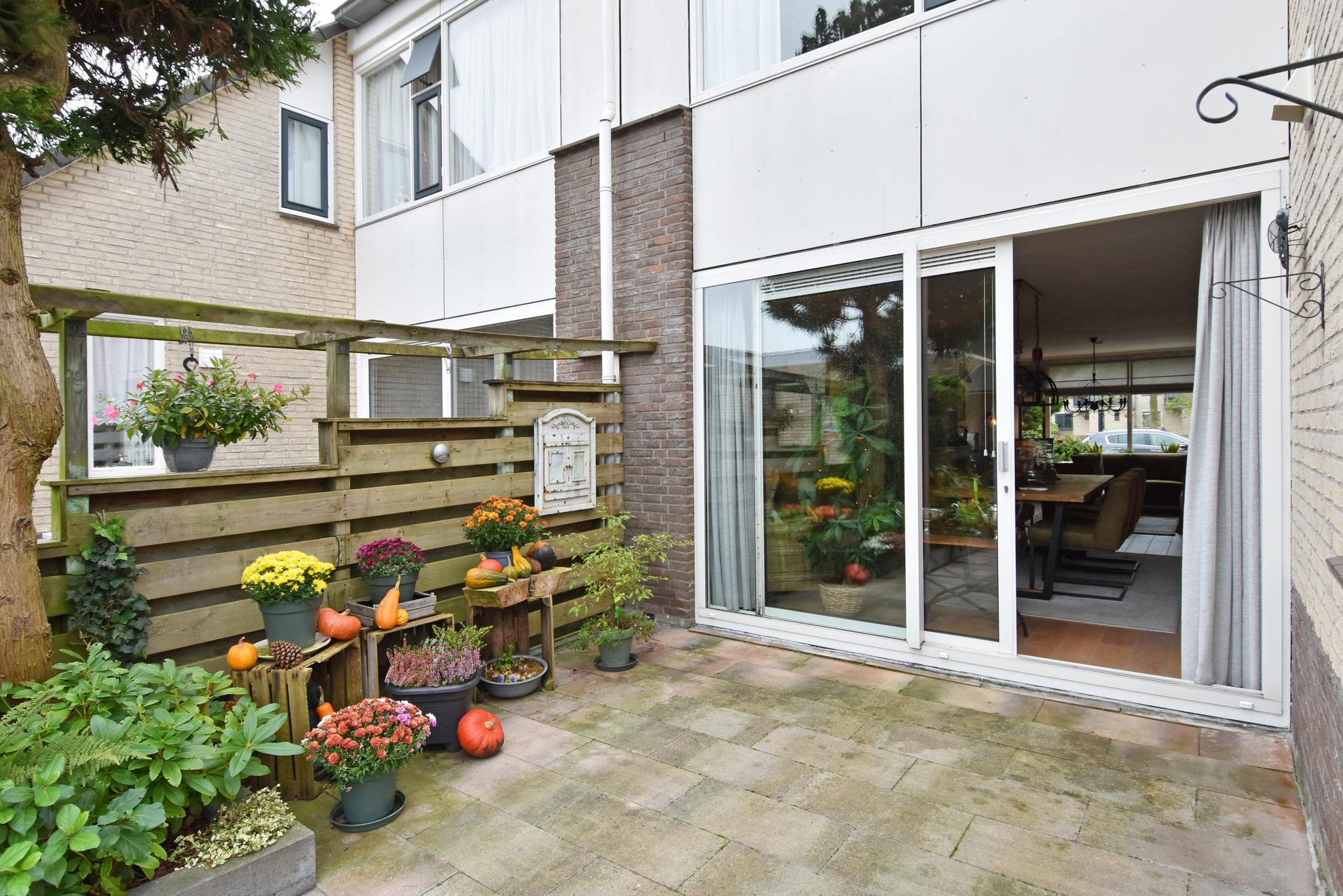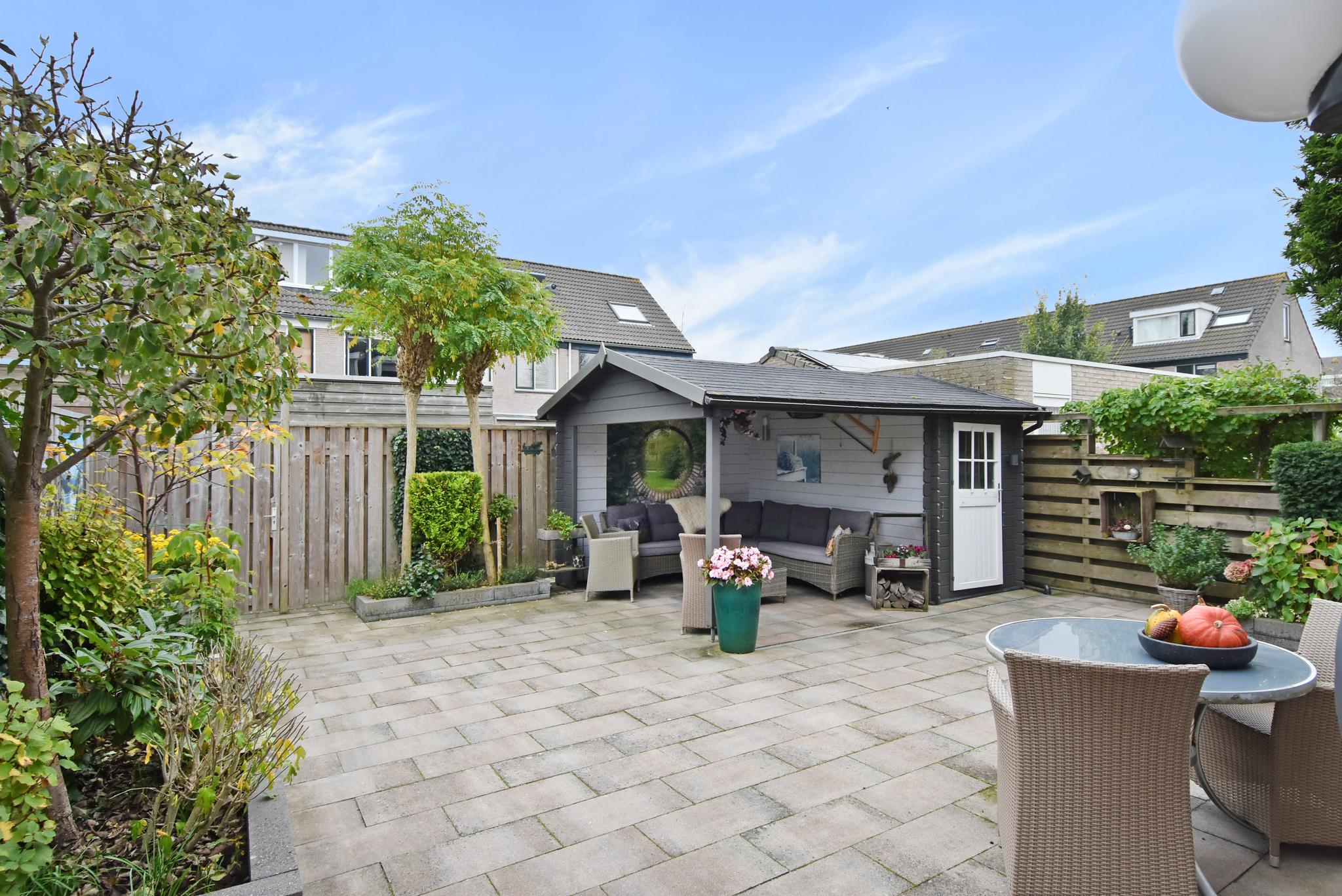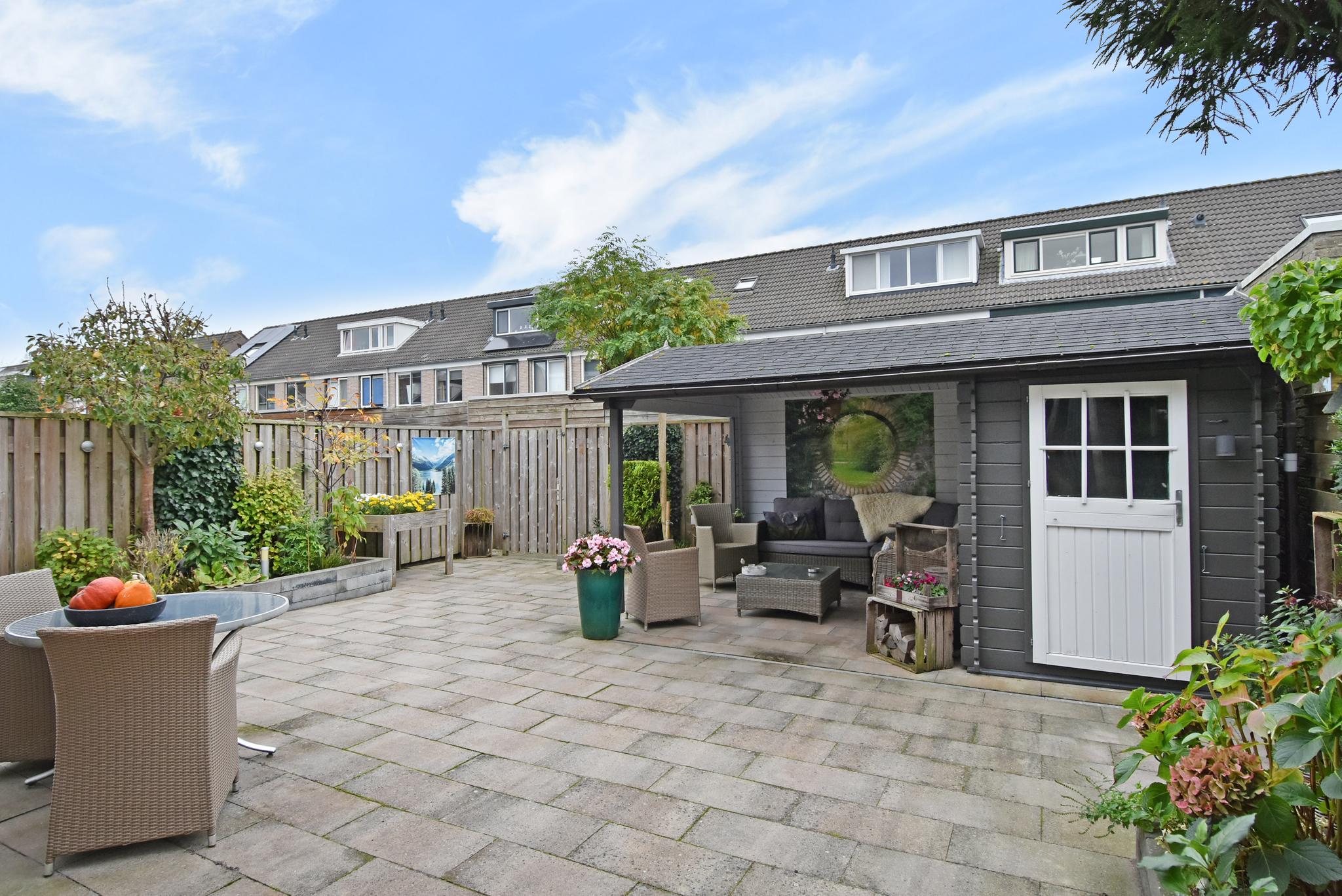 Tuin: leuk ingedeelde tuin met meerdere terrassen, mooi aangelegd met volwassen groen. Achterin de tuin een extra berging/overkapping en poortdeur. De tuin is gelegen op het oosten, de huidige eigenaren genieten volop van deze tuin in het zonnetje en met de hete zomers ook van de schaduw.
