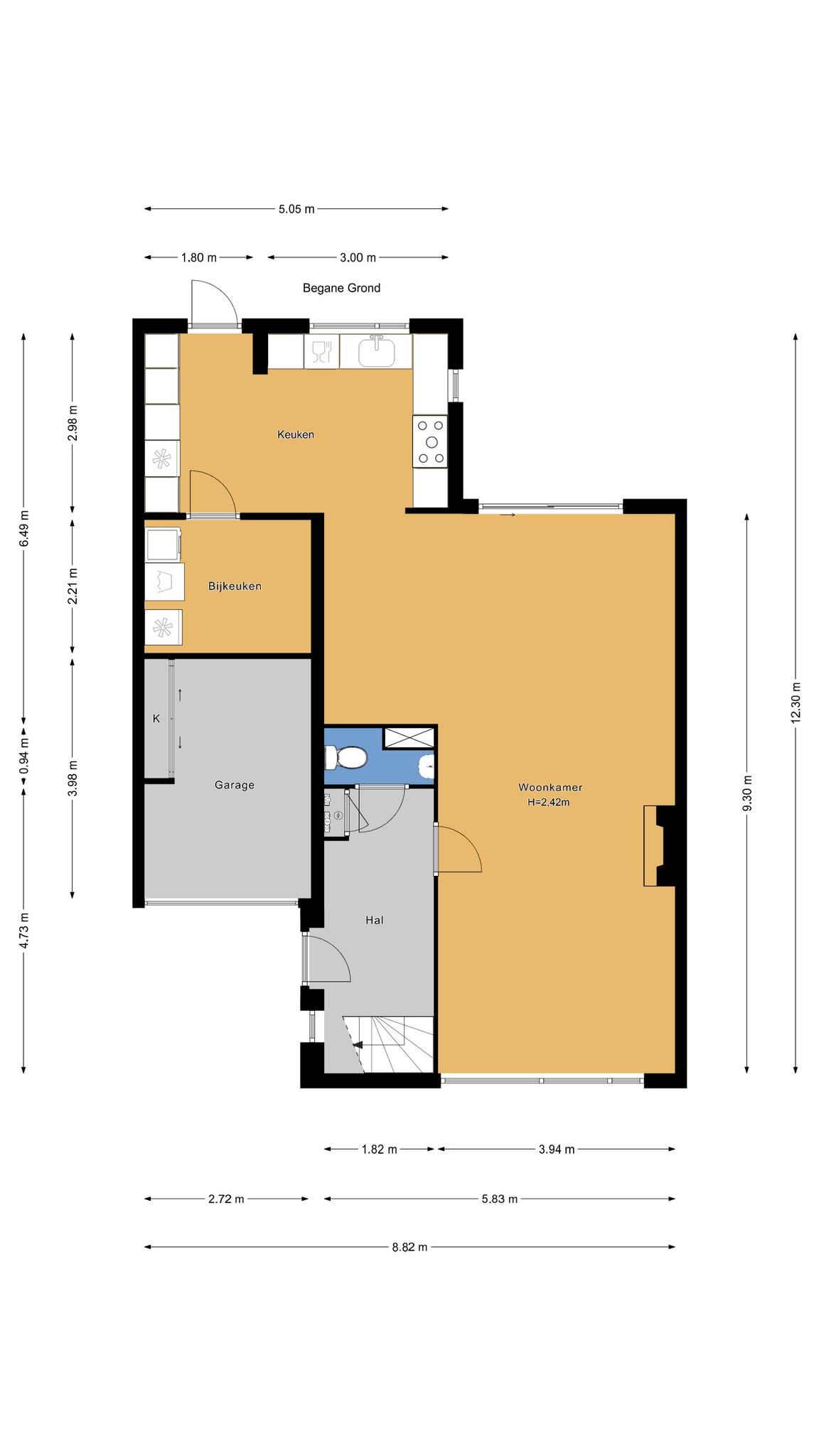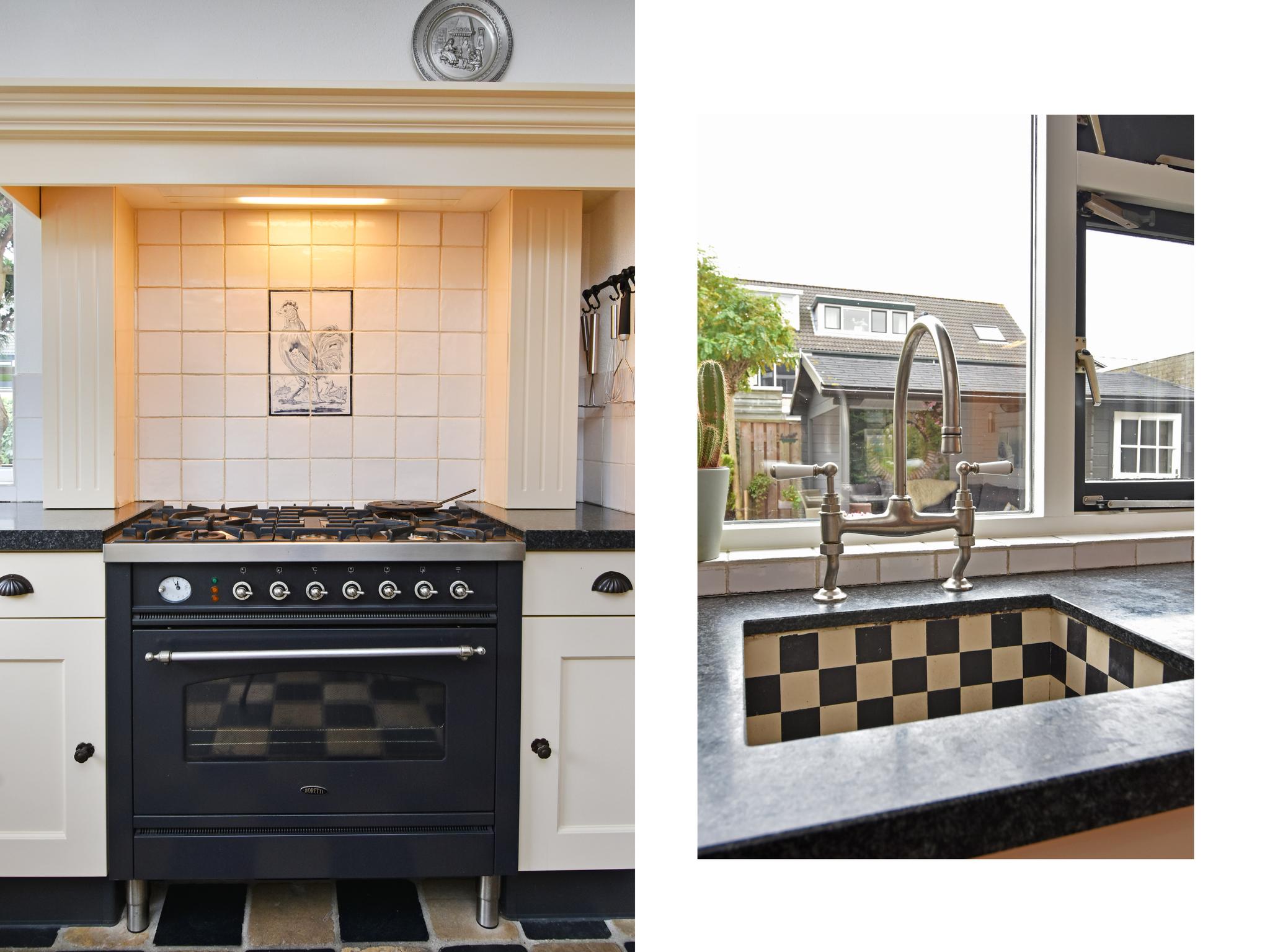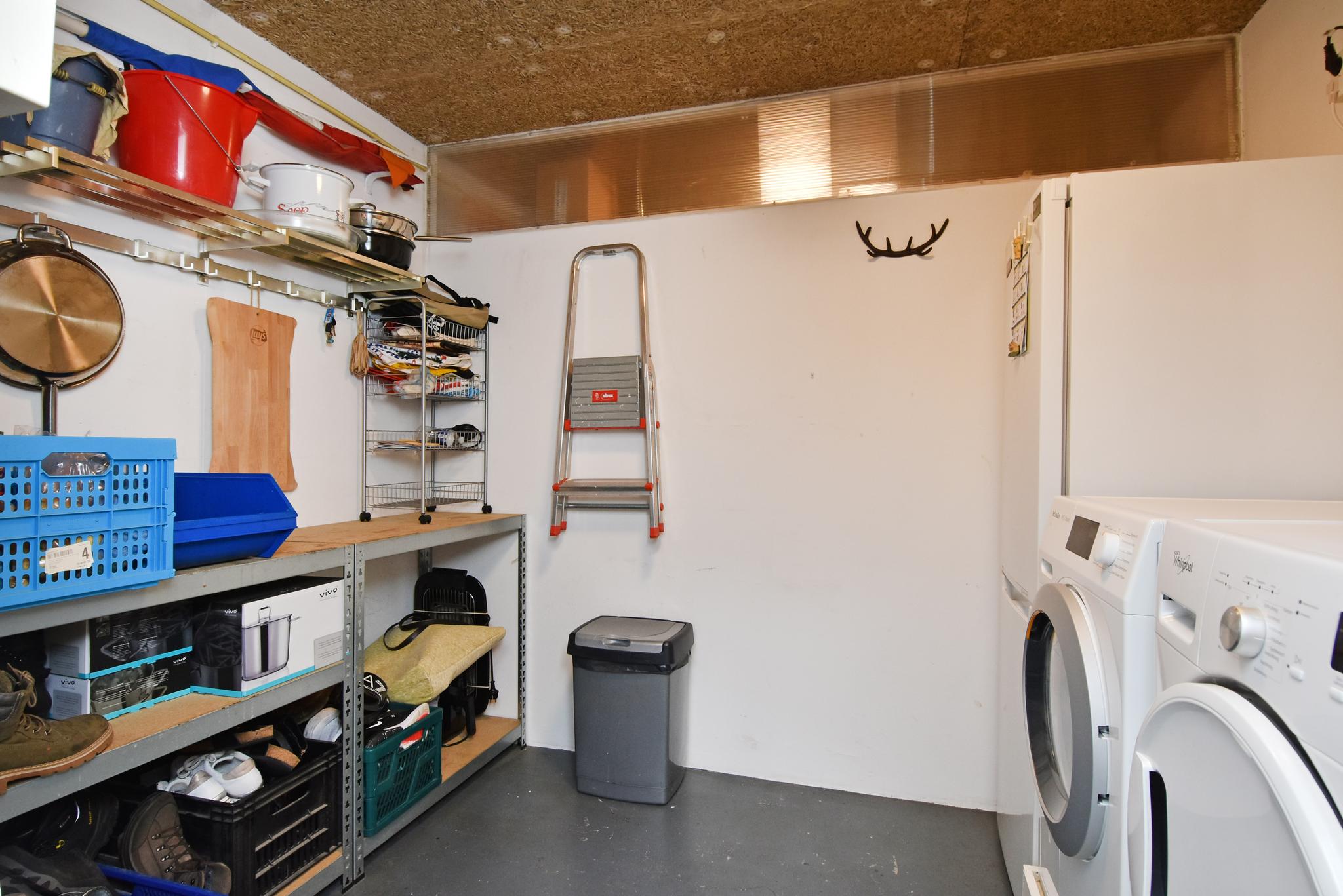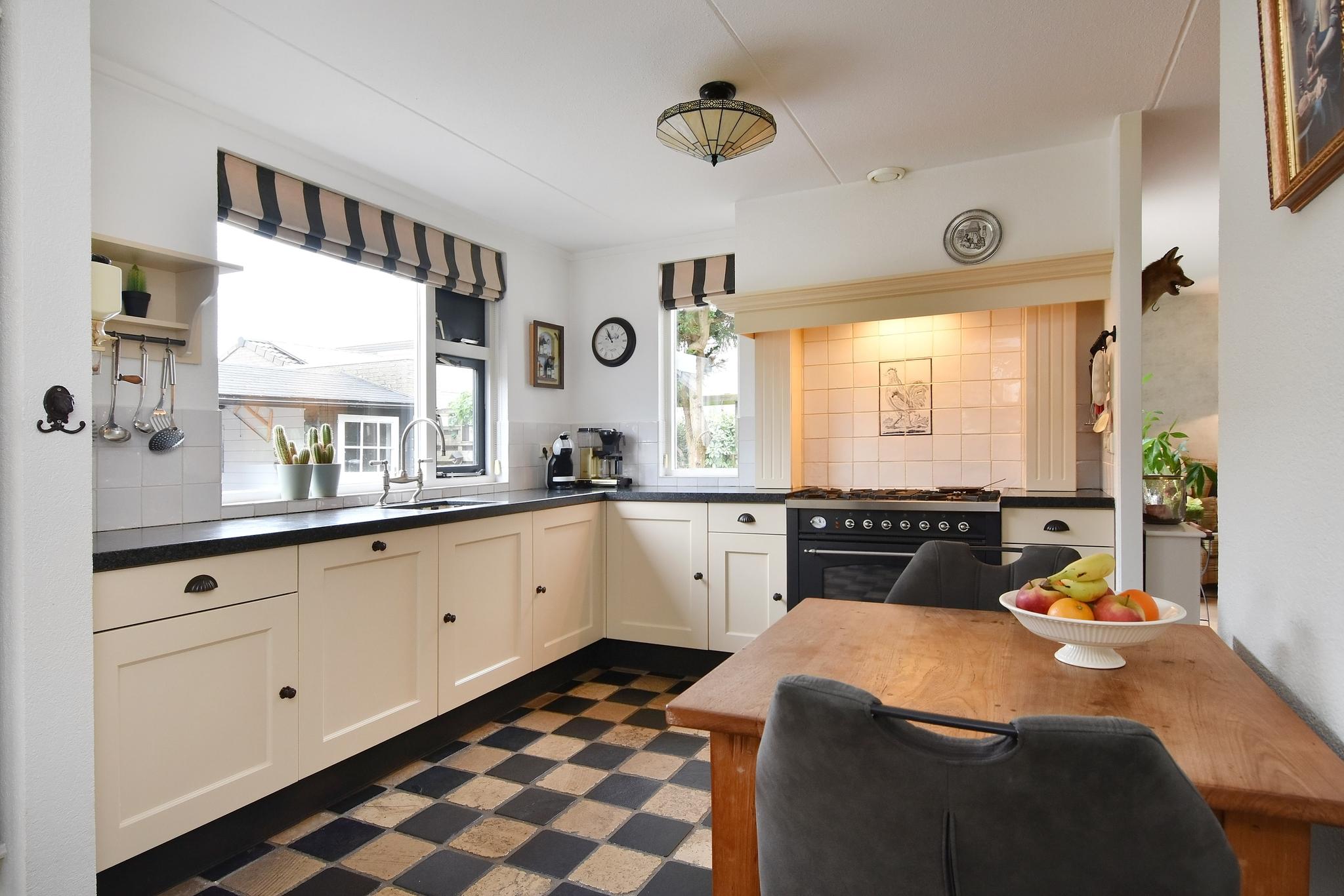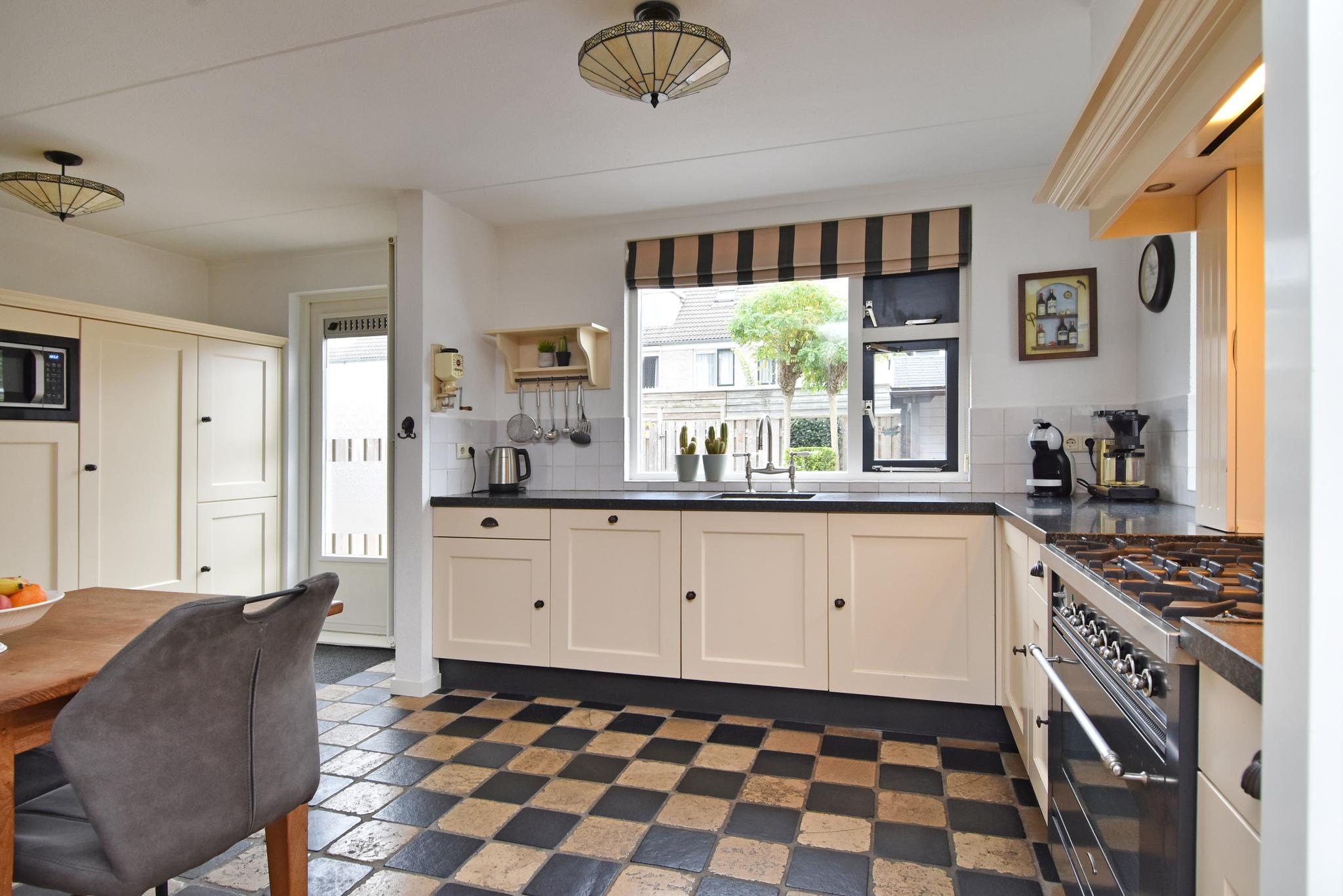 Keuken: de keuken is modern uitgevoerd en v.v. de volgende inbouwapparatuur: Borreti gasfornuis, afzuigkap, vaatwasser, koelkast, vriezer, combimagnetron en oven. Vanuit de keuken met een deur toegang tot de tuin. Interne doorgang vanuit de keuken naar de garage/bijkeuken voorzien van wasmachine- en drogeraansluiting en centrale verwarming.