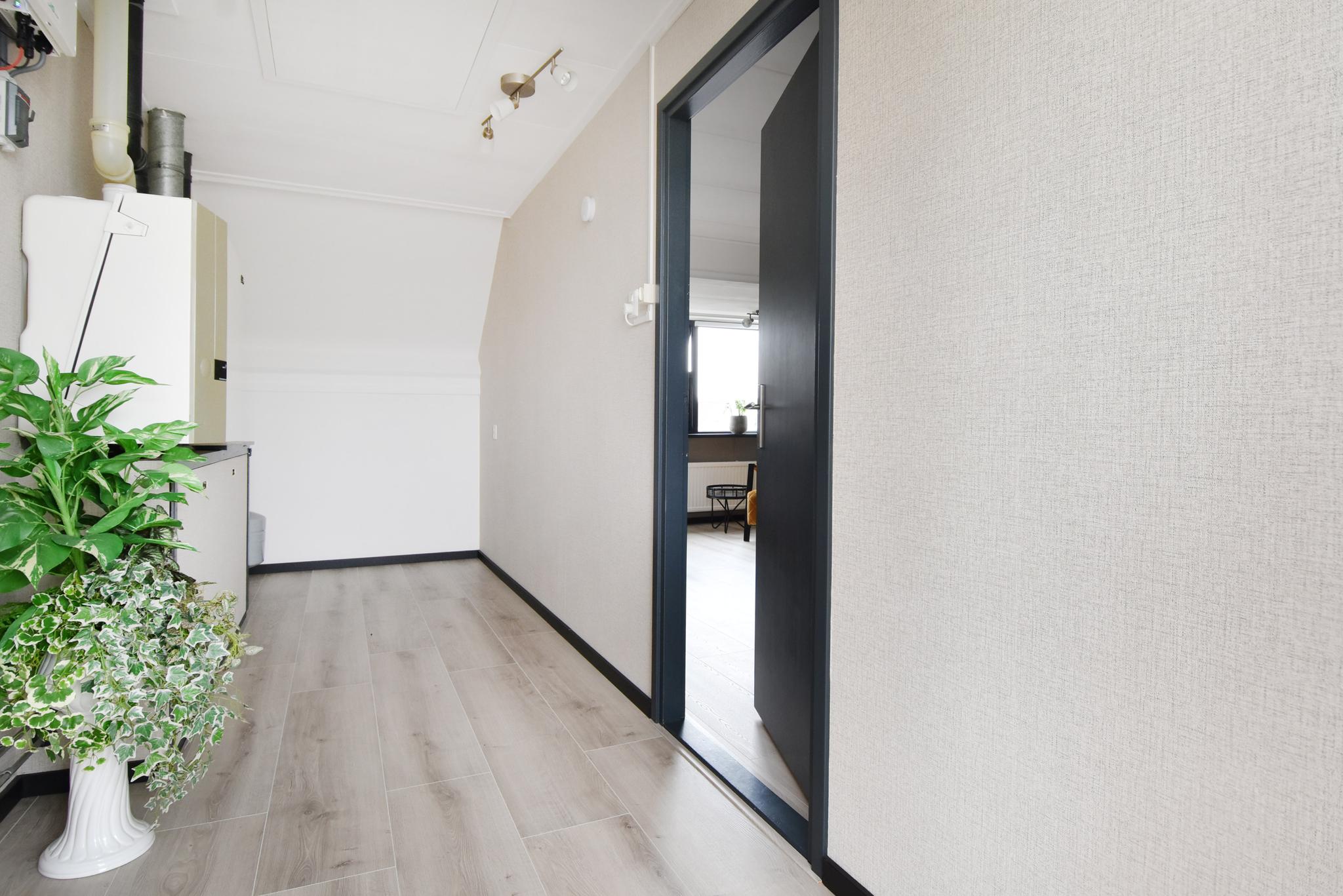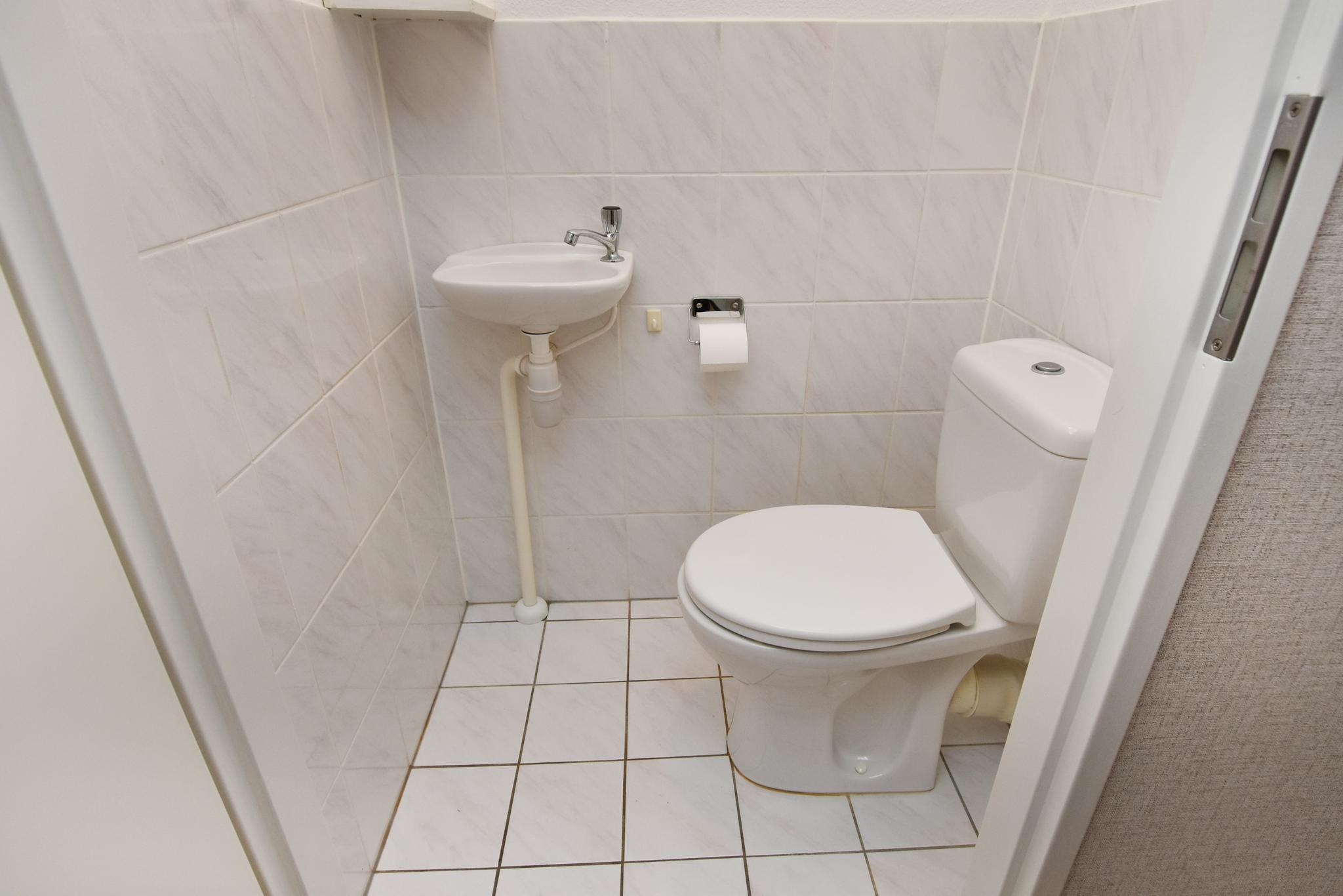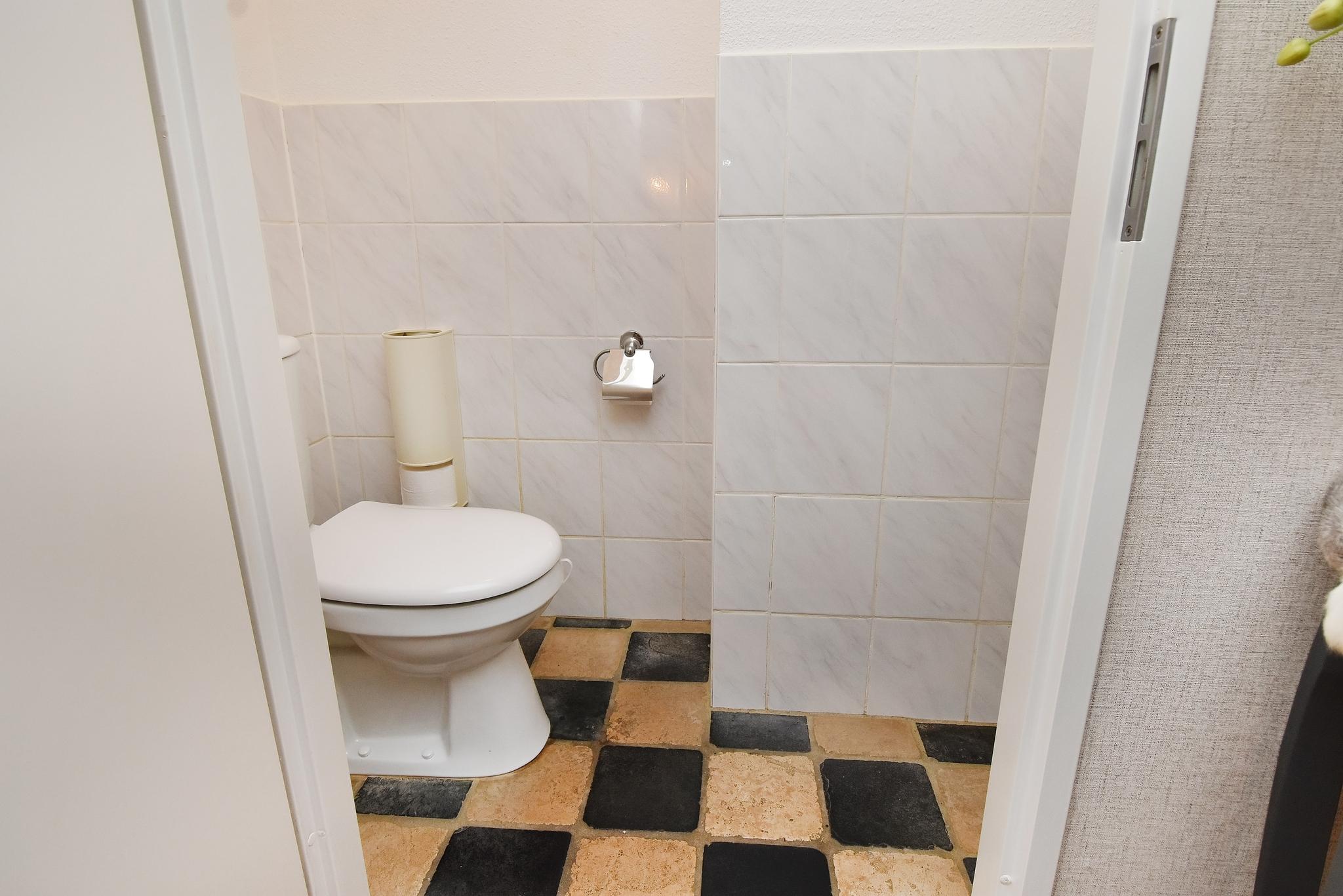 Hal: ruime hal met open trap, toilet en vernieuwde meterkast. Modern toilet is netjes uitgevoerd met een wasbakje.