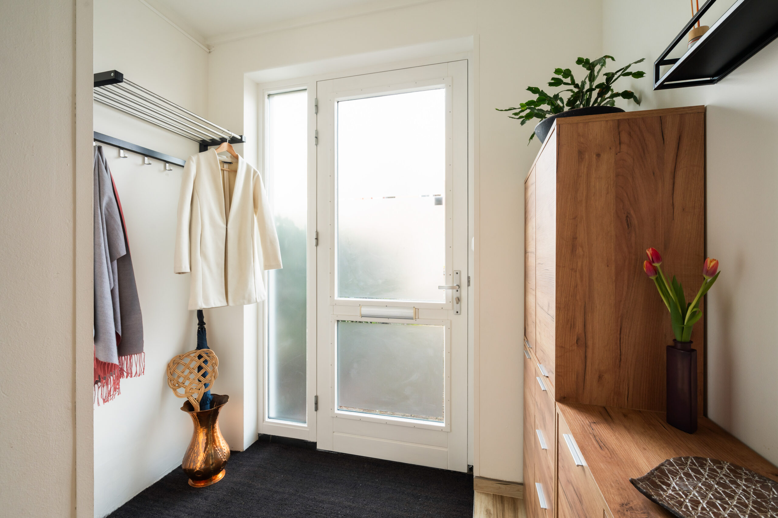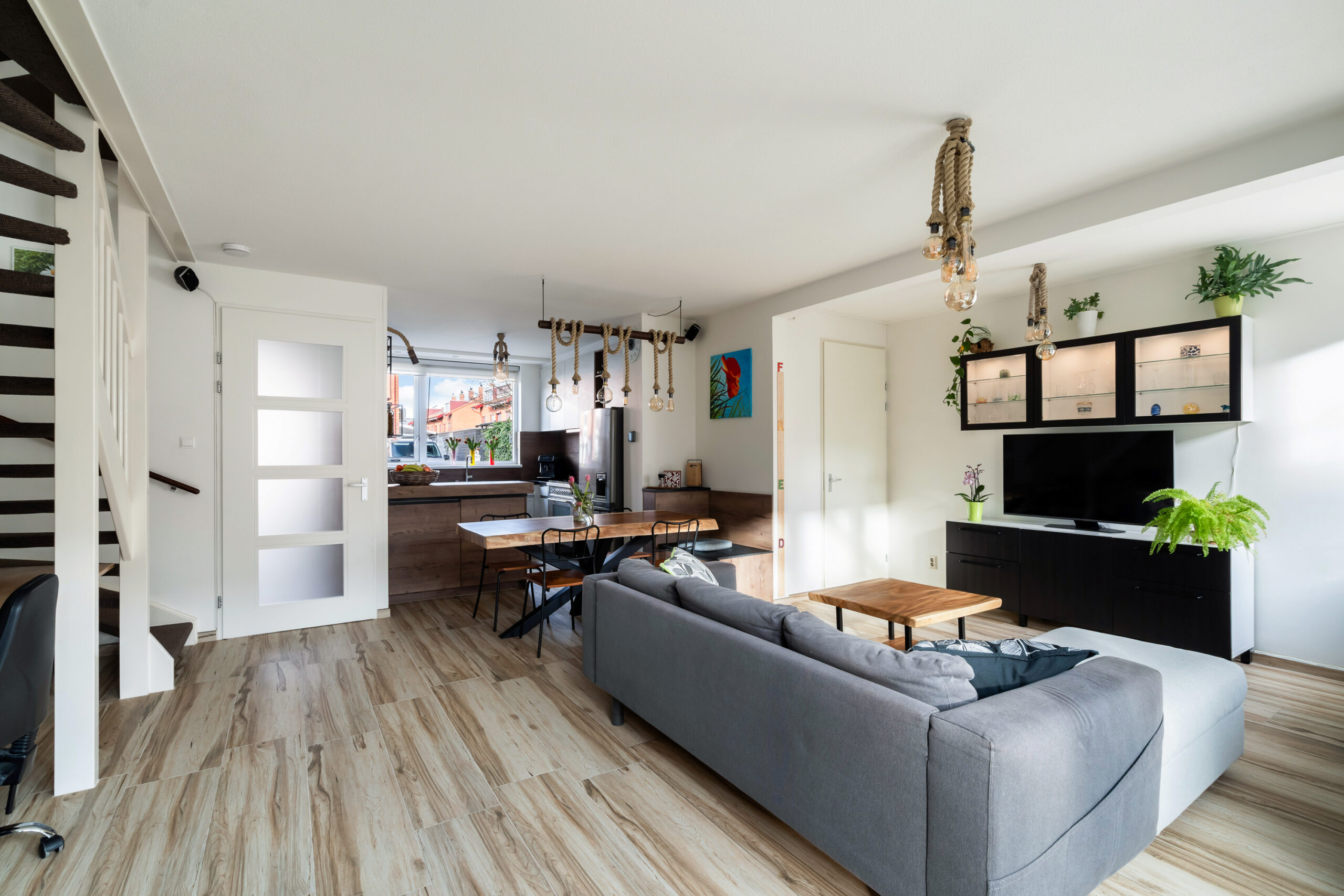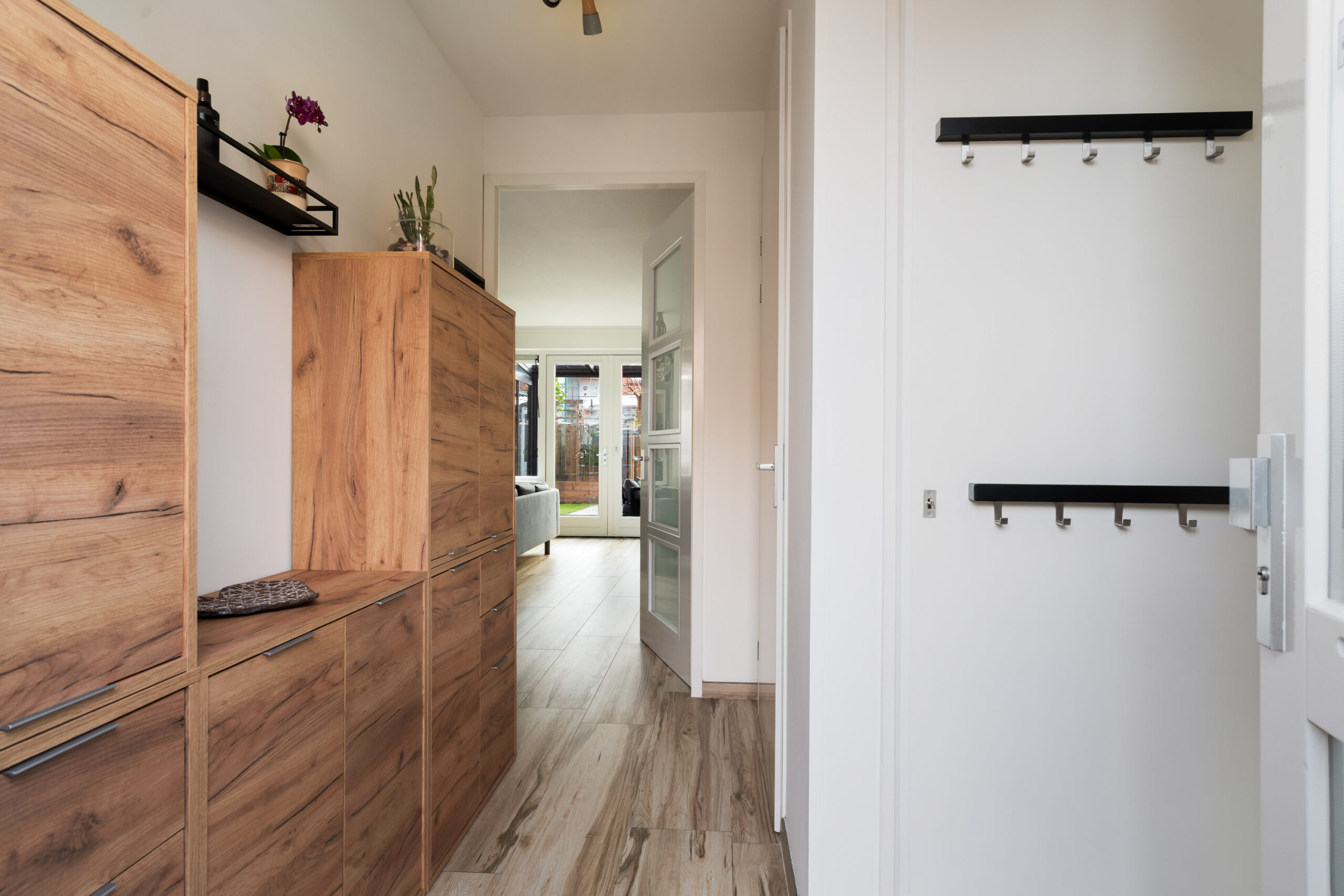 De woonkamer voorzien van een praktische voorraadkast en een, in 2023 aangebouwde, wasruimte, ideaal!