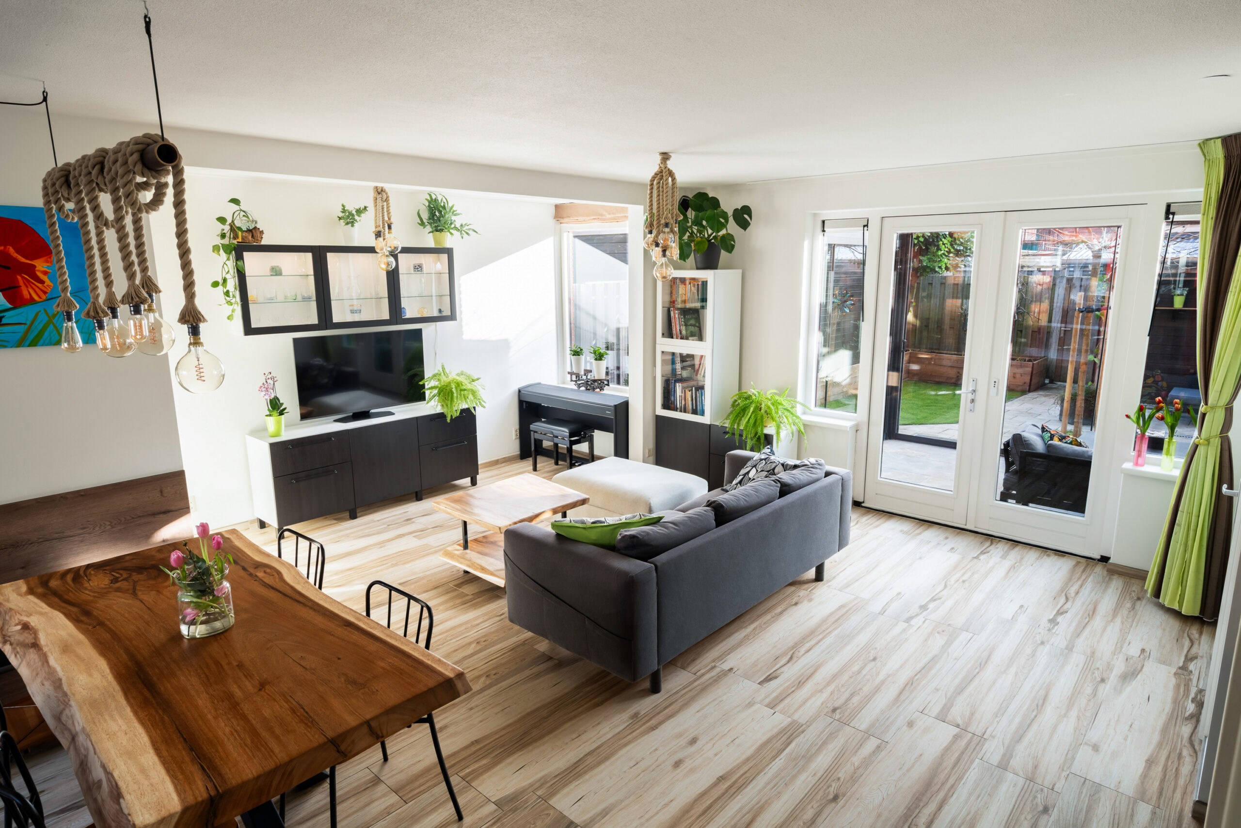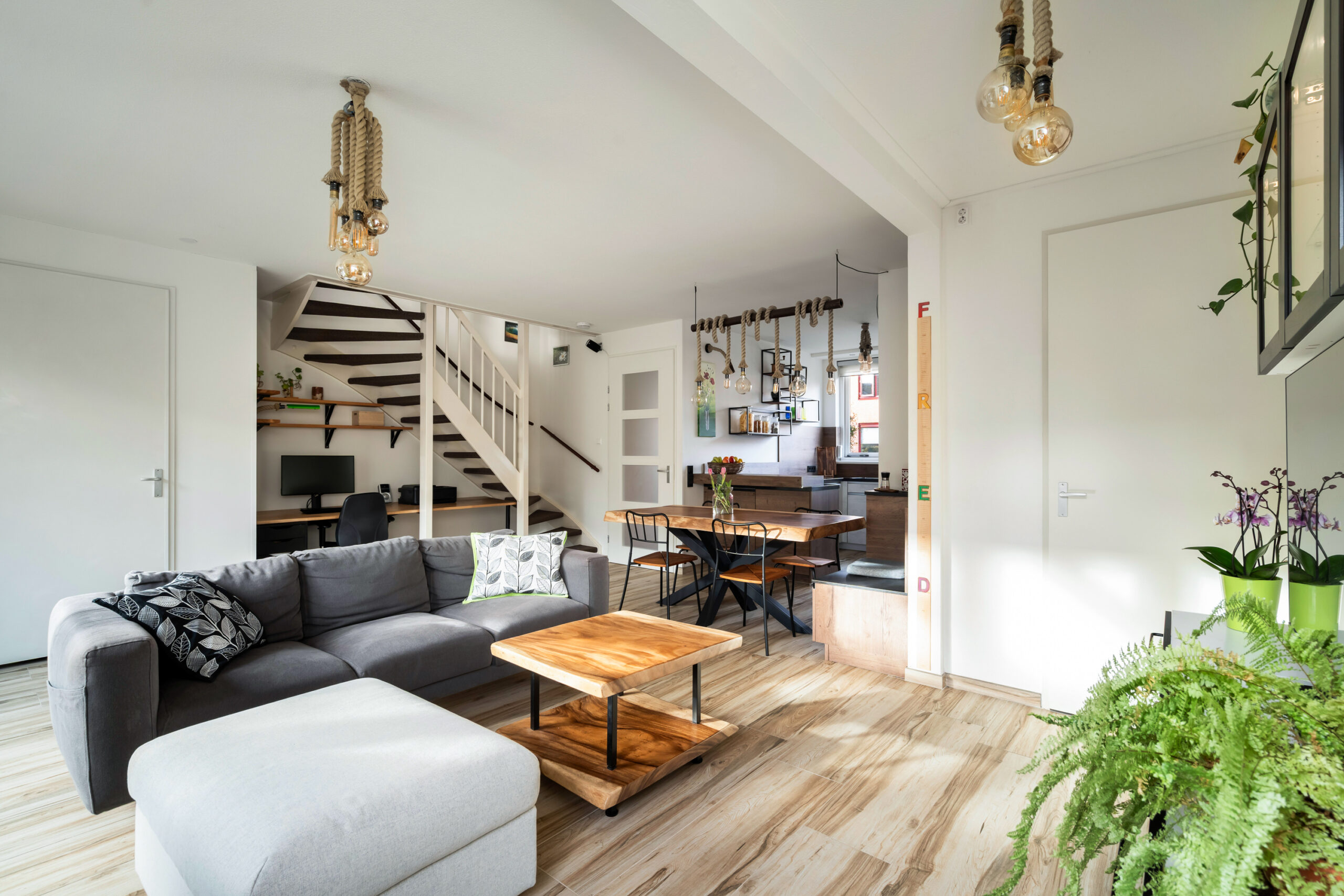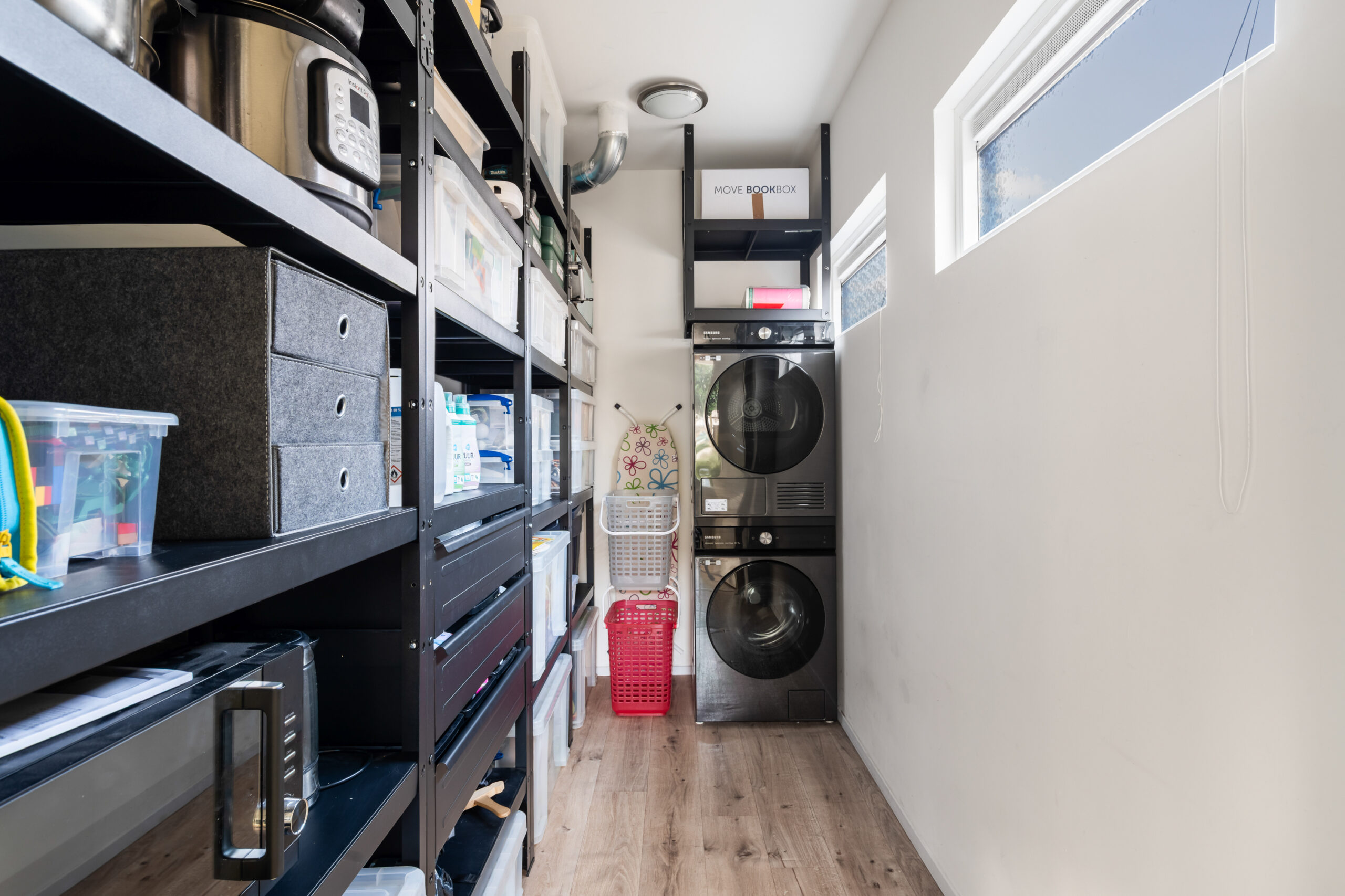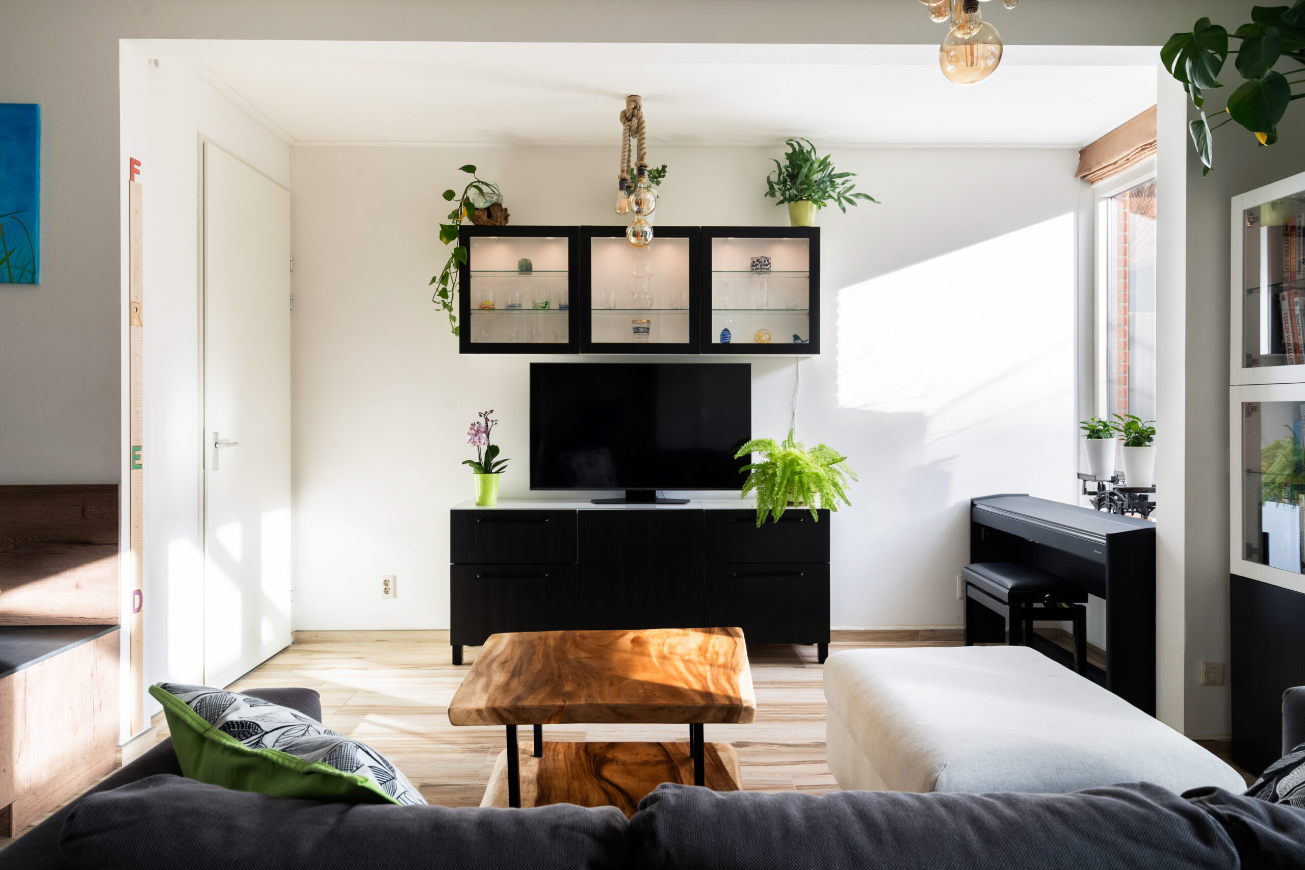 De woonkamer voorzien van een praktische voorraadkast en een, in 2023 aangebouwde, wasruimte, ideaal!