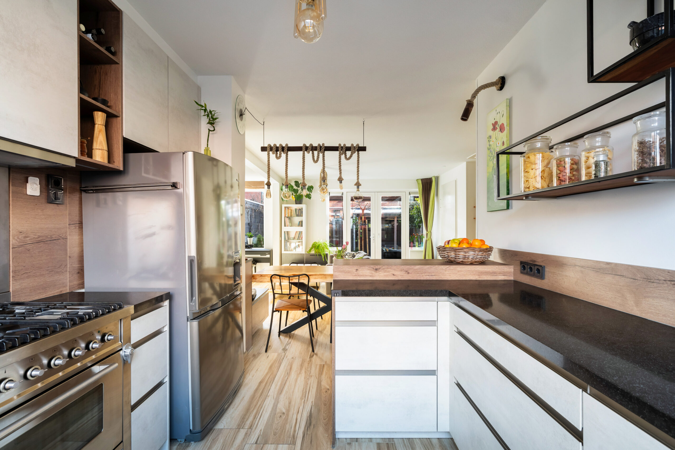 Aan de voorzijde bevindt zich de uitgebreide XL-keuken met schiereiland met 10% extra bergruimte, en voor de échte chef een Boretti fornuis met 6 pitten.
