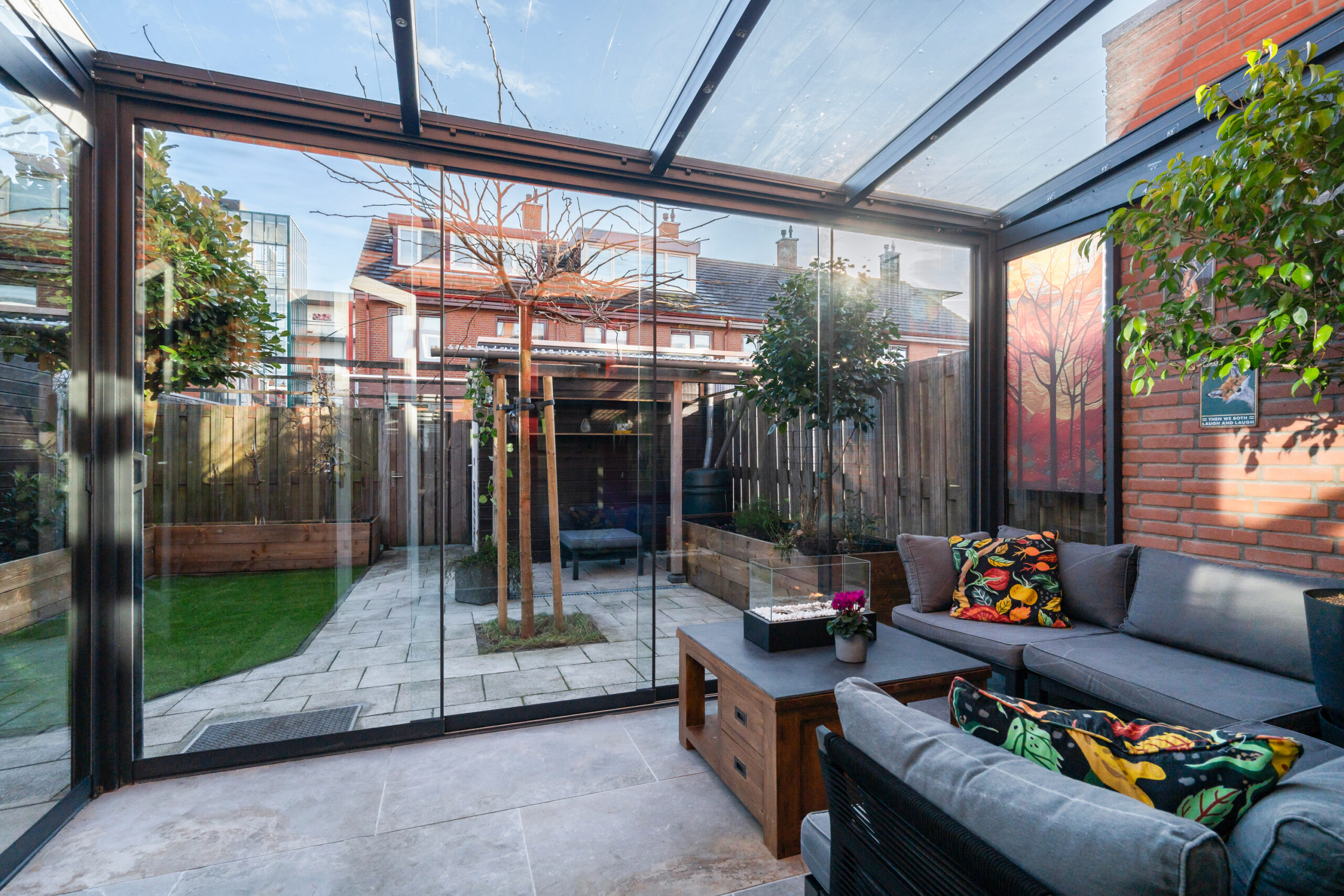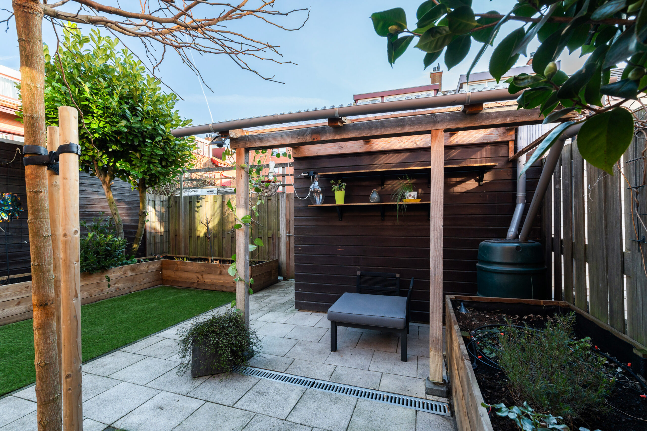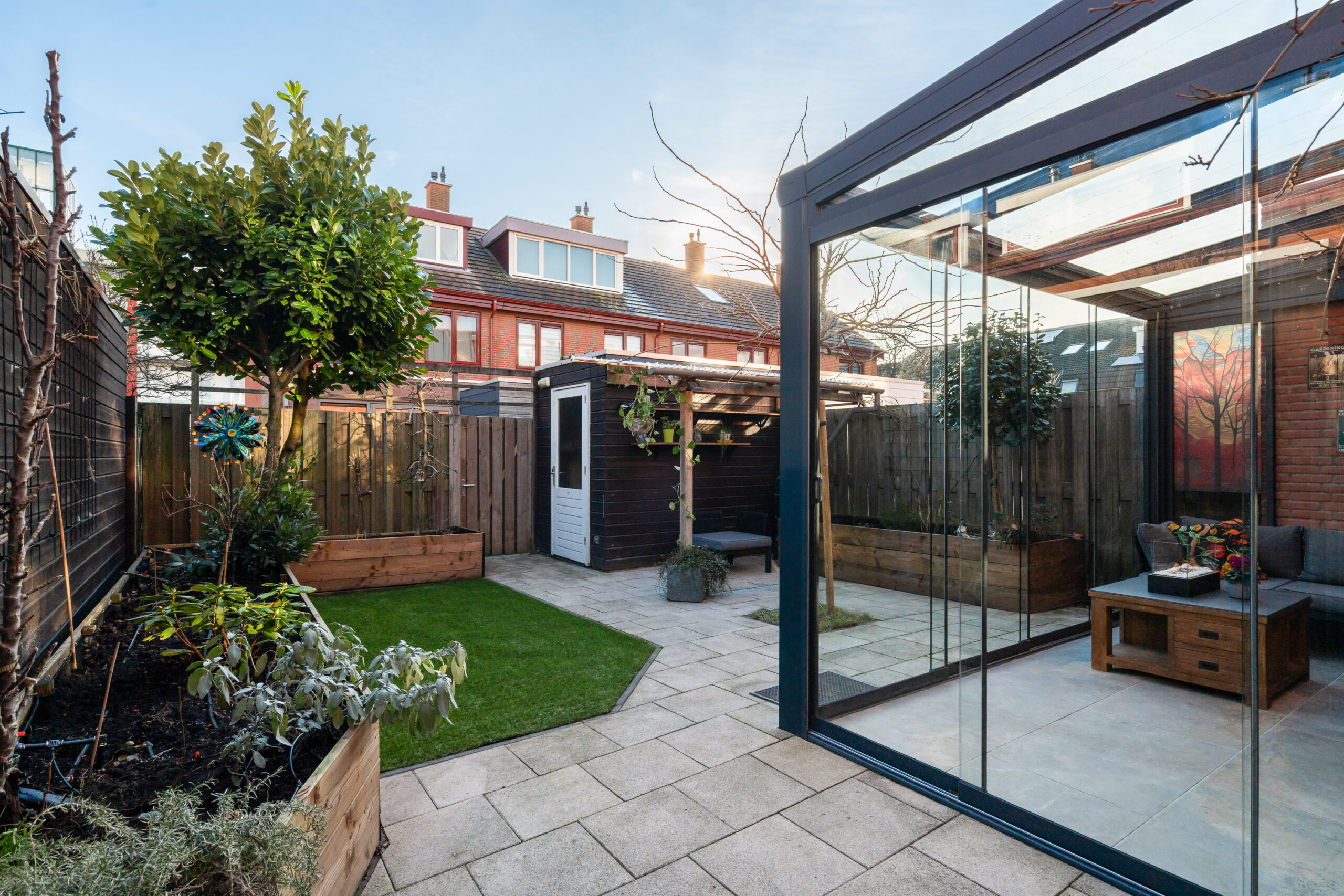 De serre (2024) is een heerlijke plek om ook tijdens regenachtige dagen van het buitenleven te genieten. De tuin is groen en verzorgd, met een houten berging voorzien van elektra en een afdak.