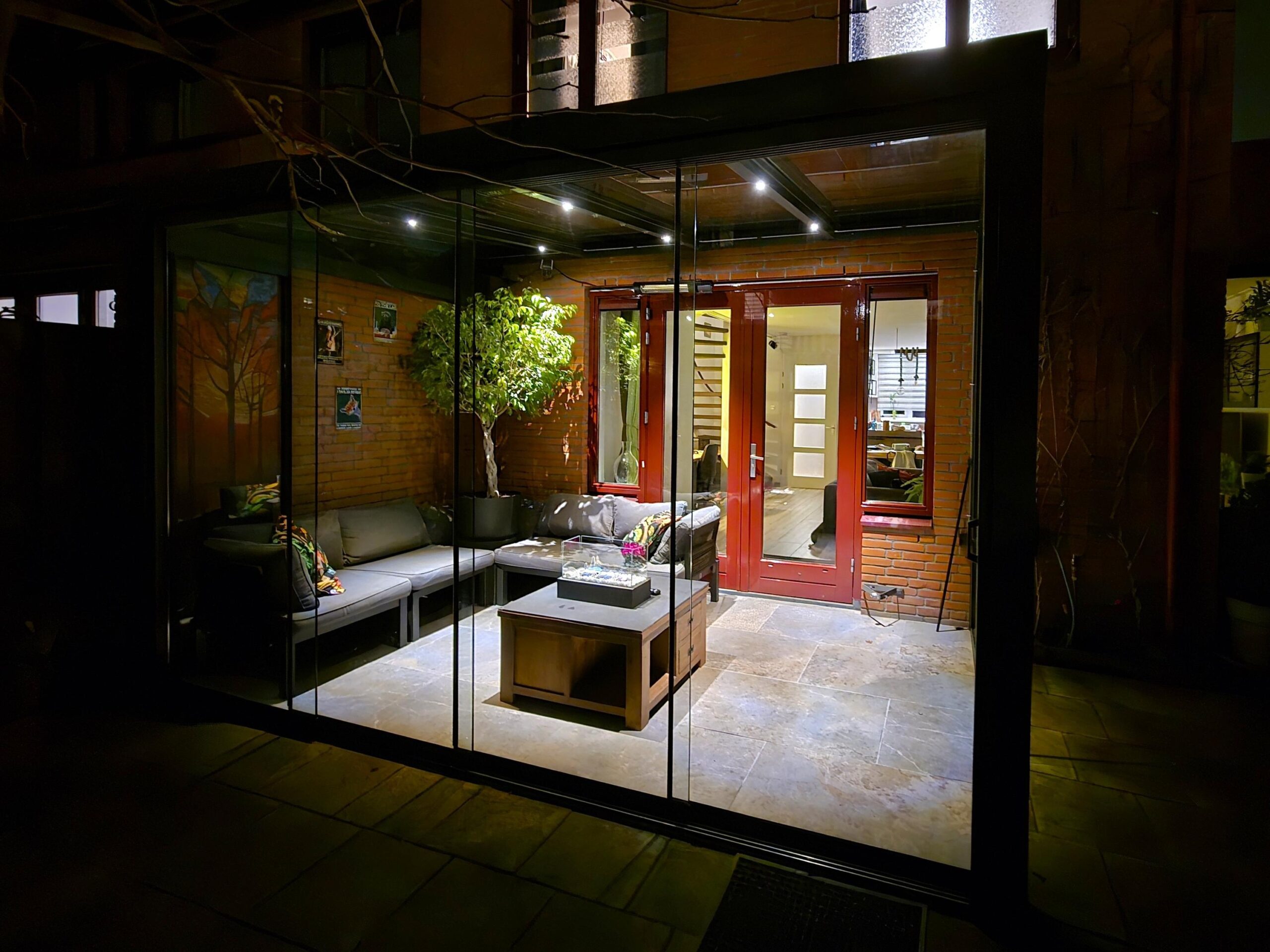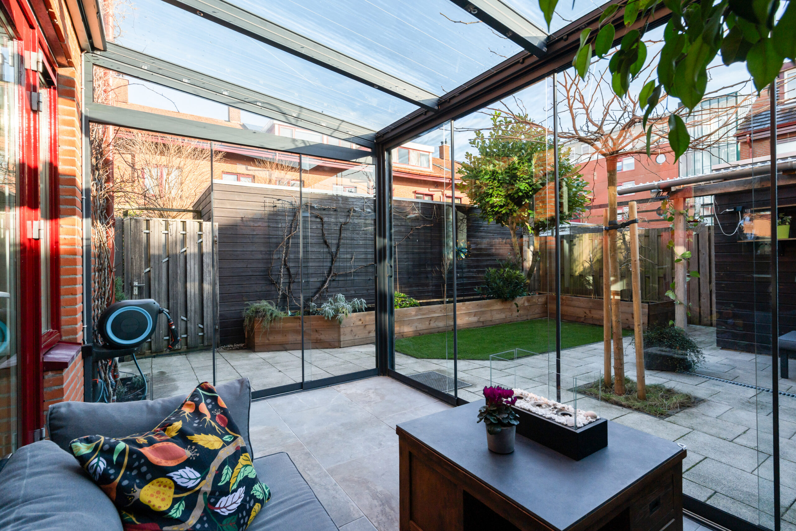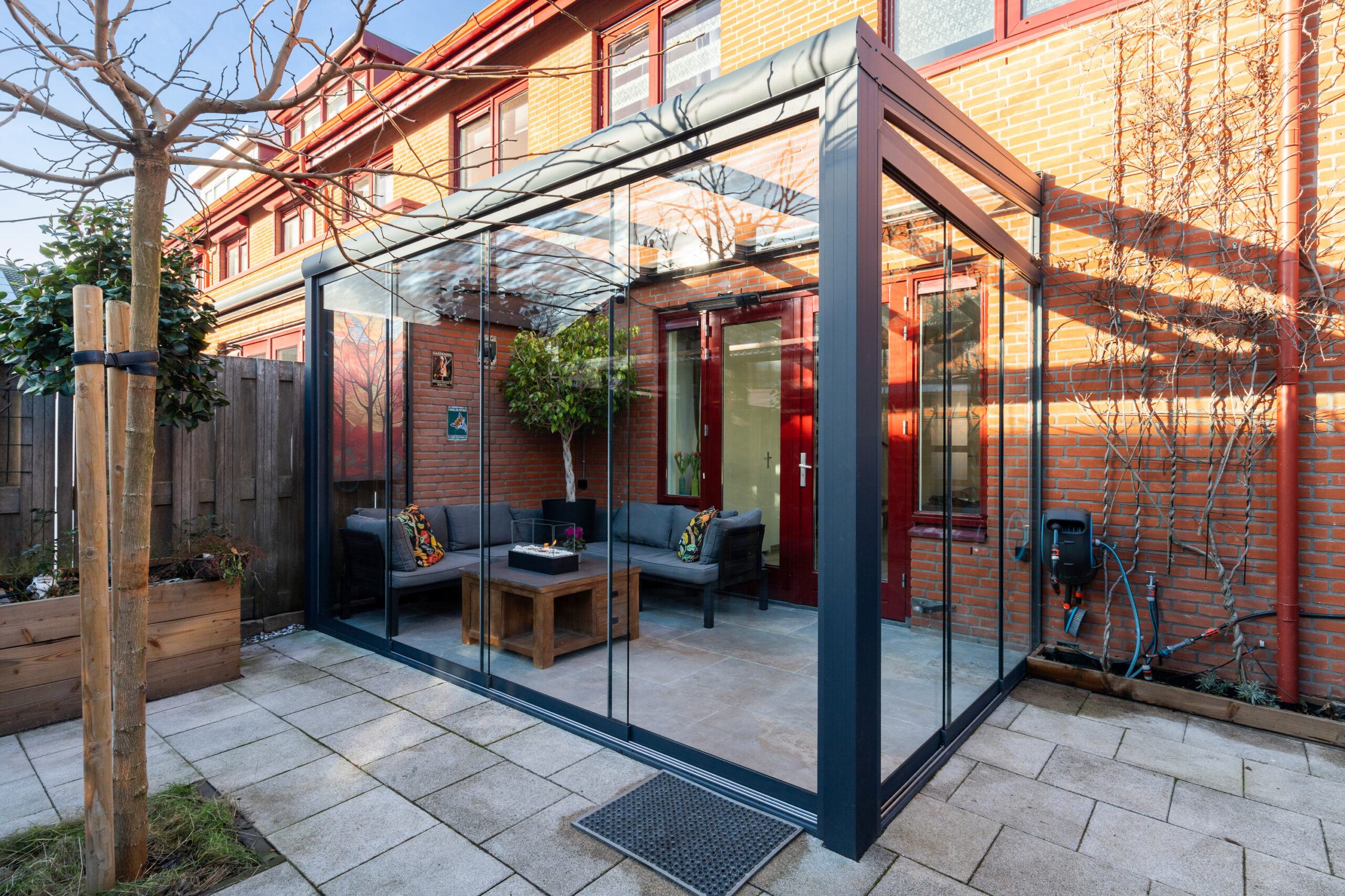 De serre (2024) is een heerlijke plek om ook tijdens regenachtige dagen van het buitenleven te genieten. De tuin is groen en verzorgd, met een houten berging voorzien van elektra en een afdak.