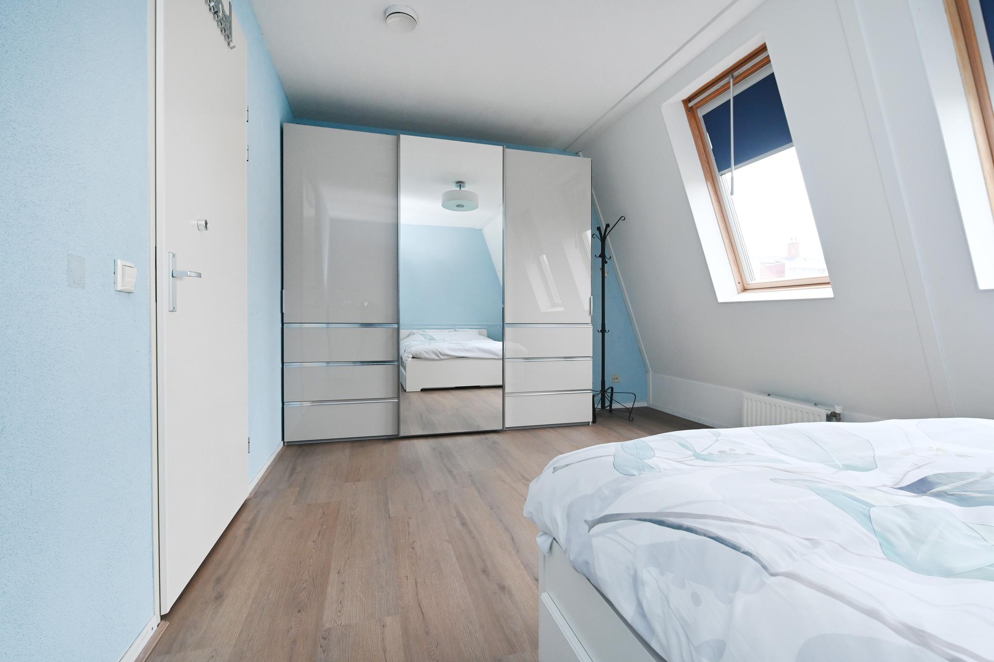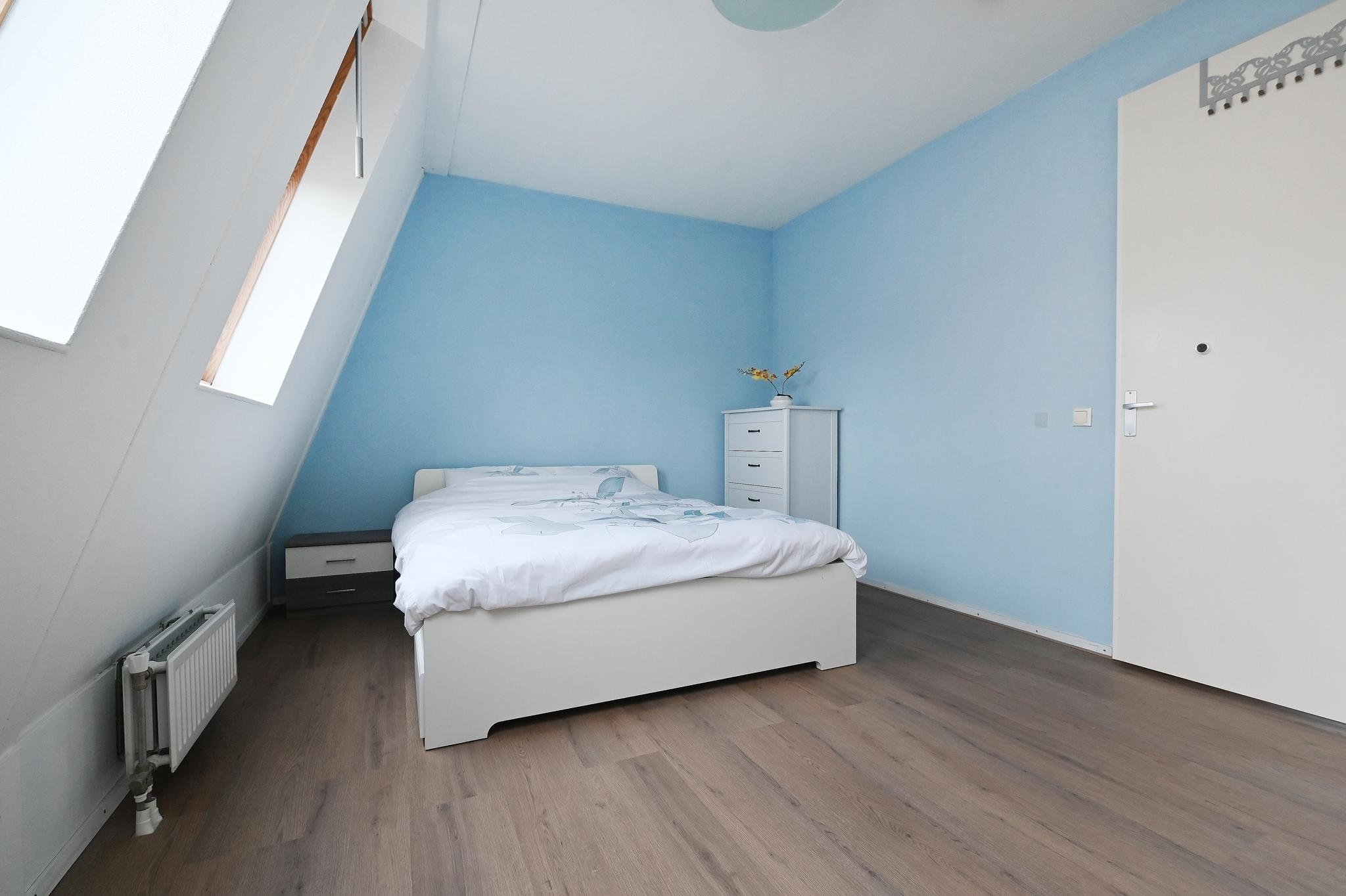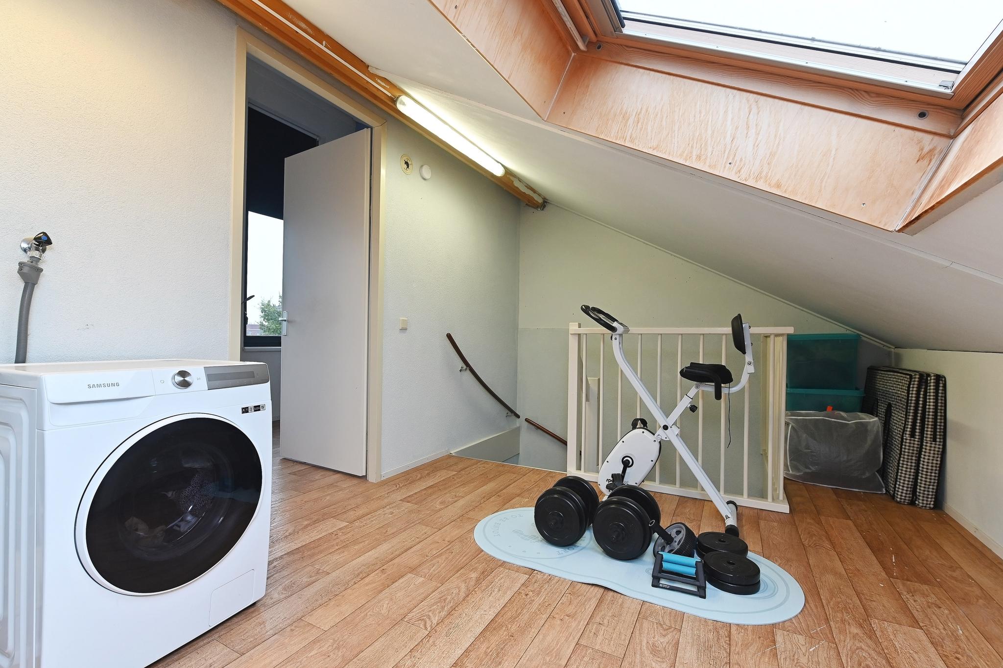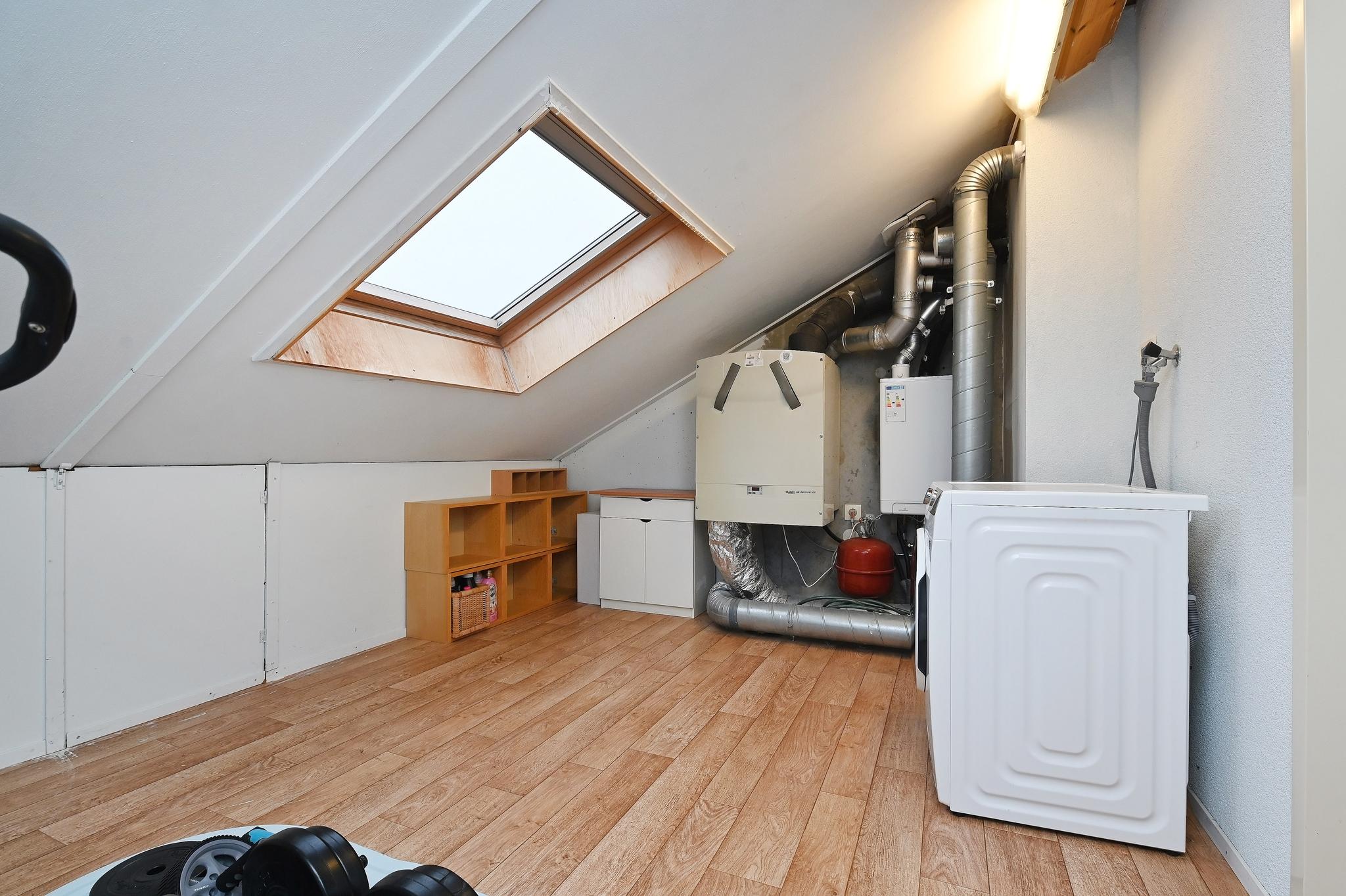 Aan de achterzijde is een ruime overloop met dakraam. Hier zijn de cv-ketel, het WTW-systeem en de wasmachine en drogeraansluiting te vinden. Aan de voorzijde is de derde slaapkamer, met een prachtige hoge nok. Ook deze kamer is voorzien van rolluiken.