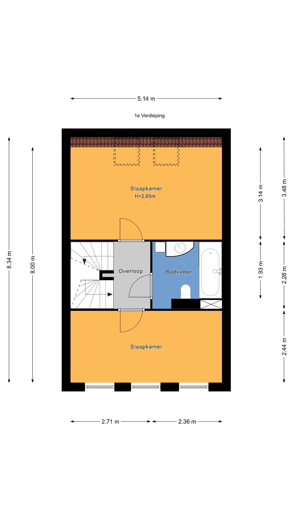 Op deze verdieping zijn twee goed formaat slaapkamers. De slaapkamer aan de voorzijde is voorzien van rolluiken. De vloer is afgewerkt met een keurige PVC visgraatvloer. De badkamer is compleet uitgerust met een ligbad, een wastafelmeubel en een tweede toilet.