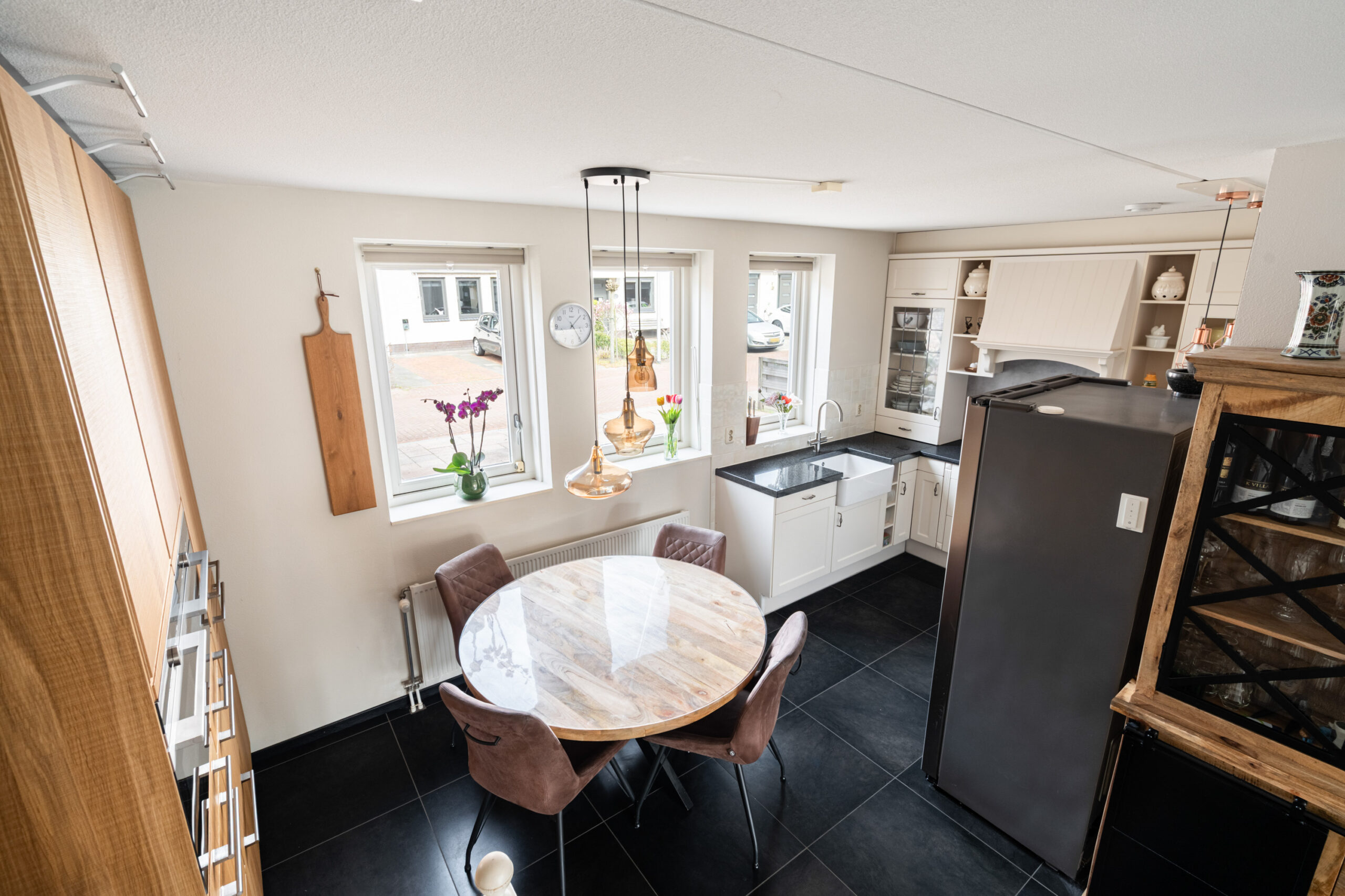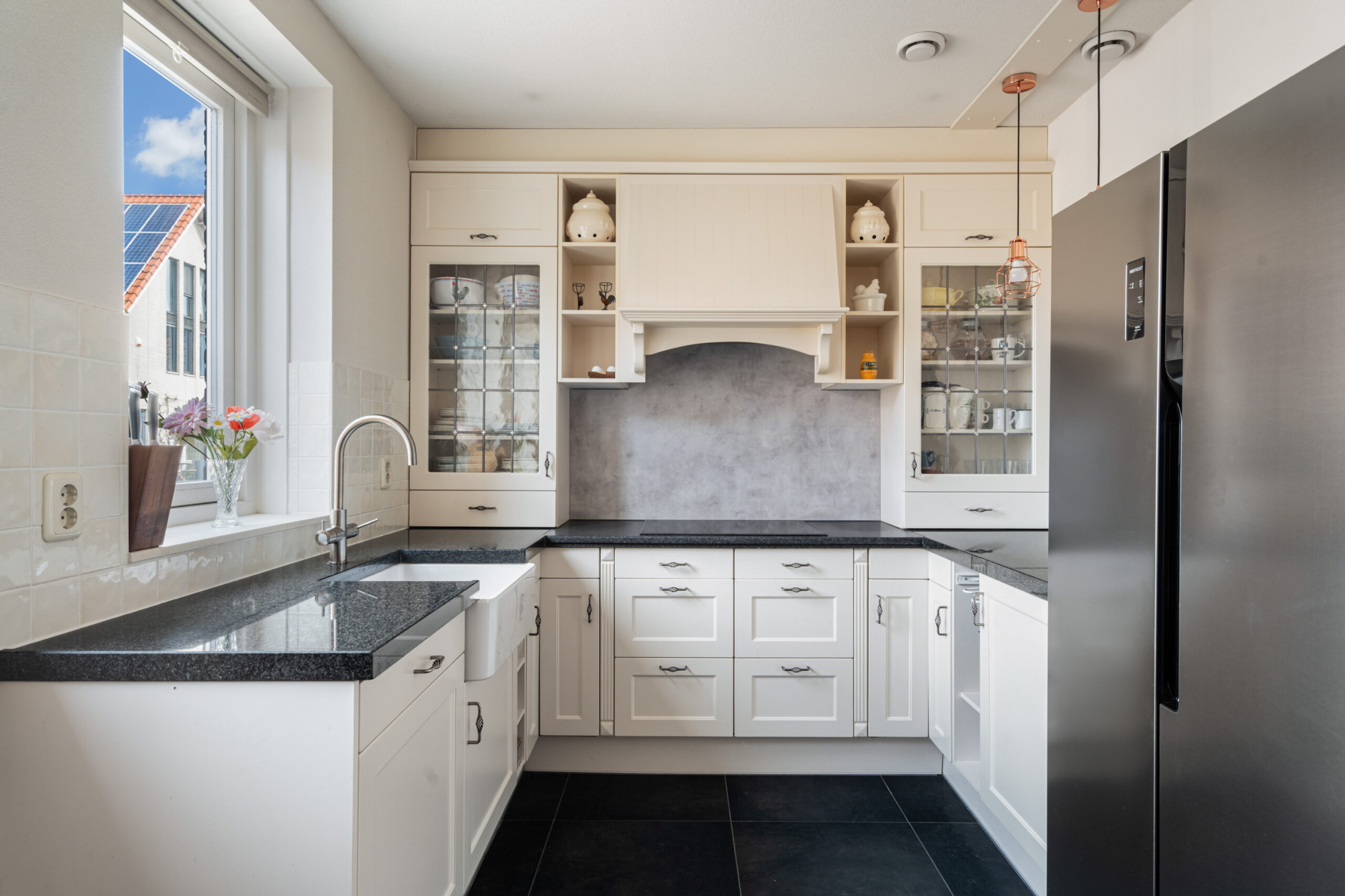 – Open keuken met apparatuur zoals: inductie kookplaat, koelkast, vriezer, magnetron, oven, vaatwasser, heet waterkraan en wasemkap