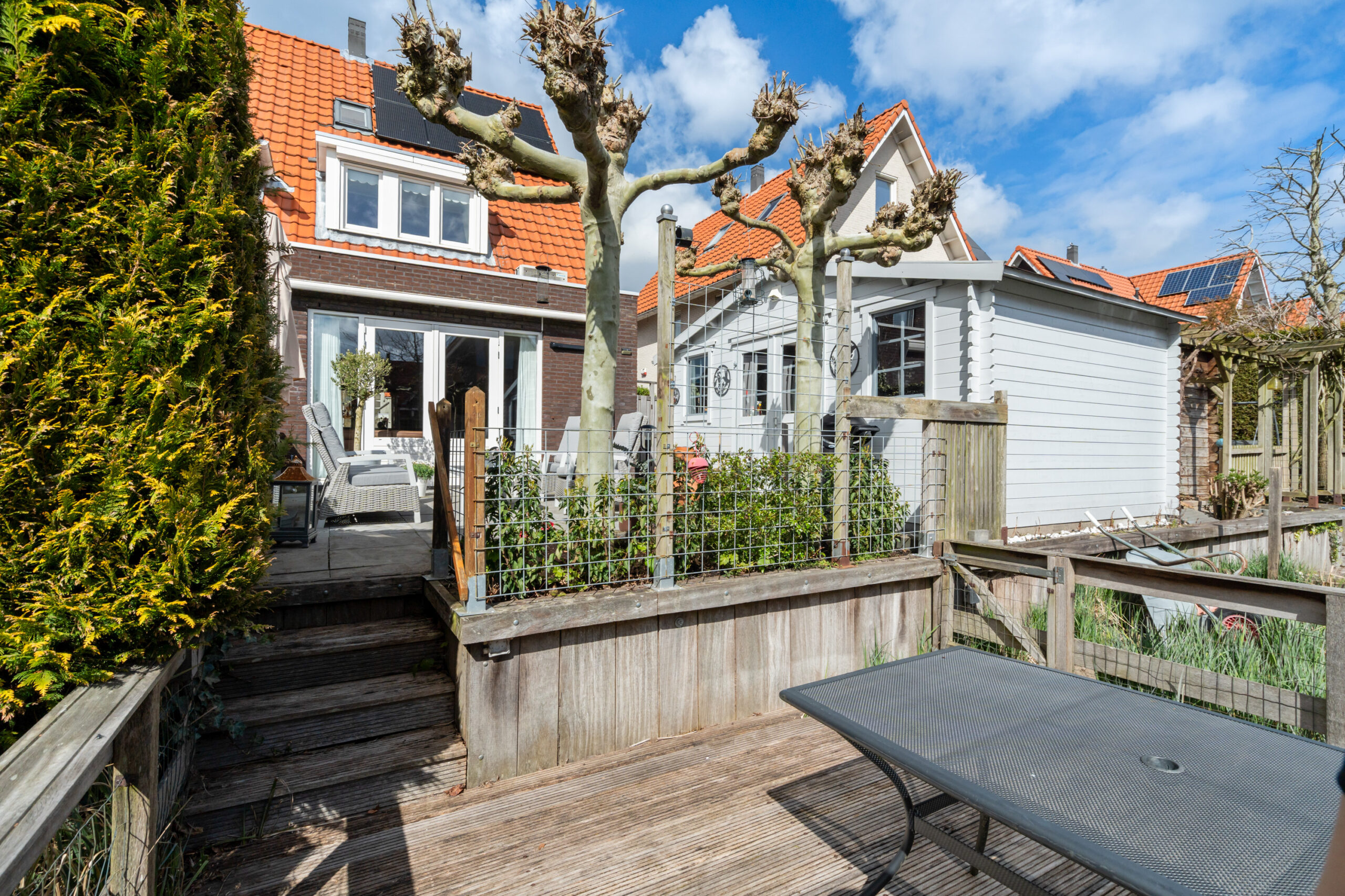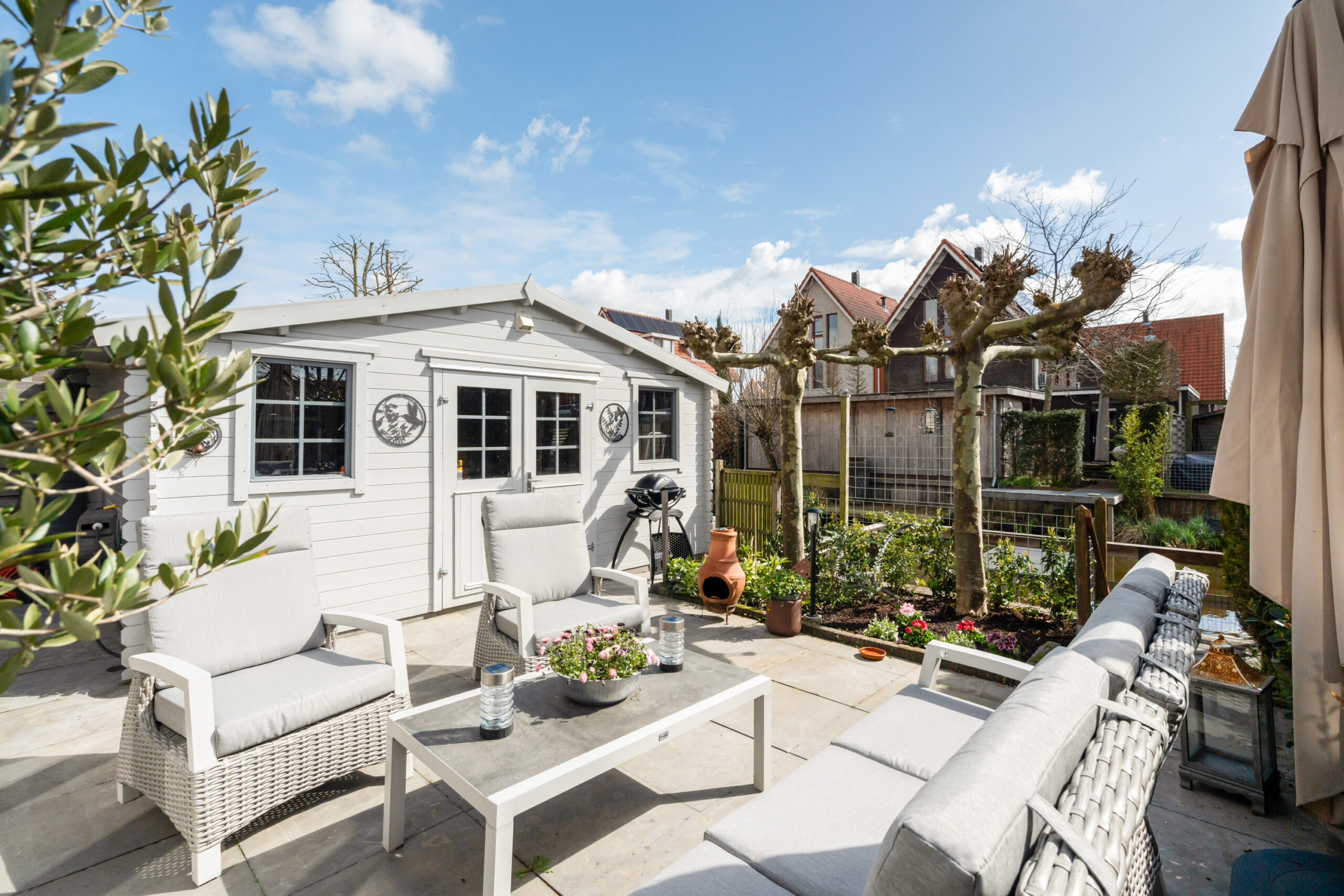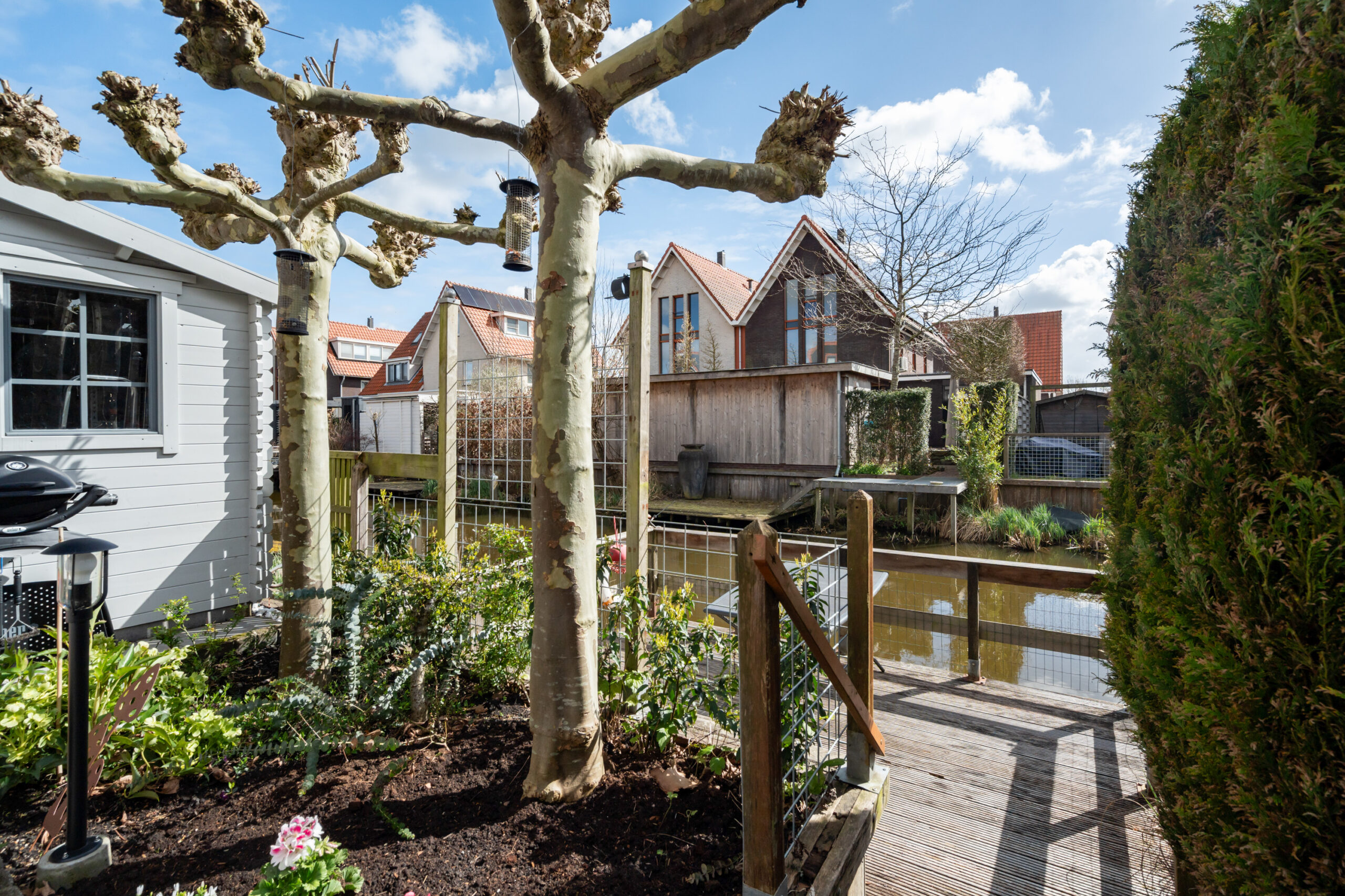 Fijne tuin met tuinhuis met elektra, terras en vlonder aan het water gesitueerd op het zuiden.