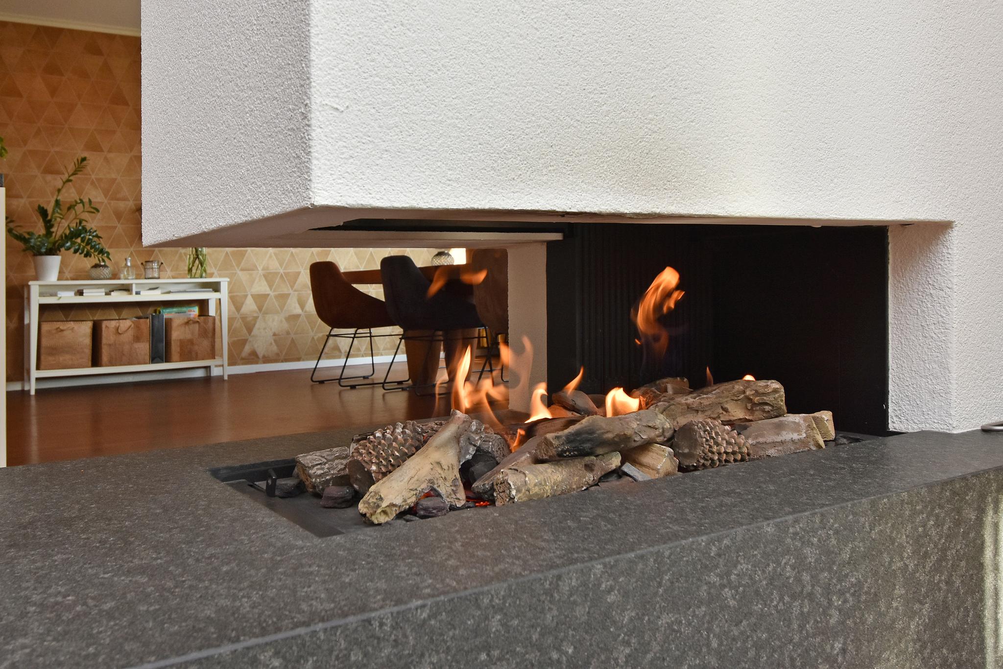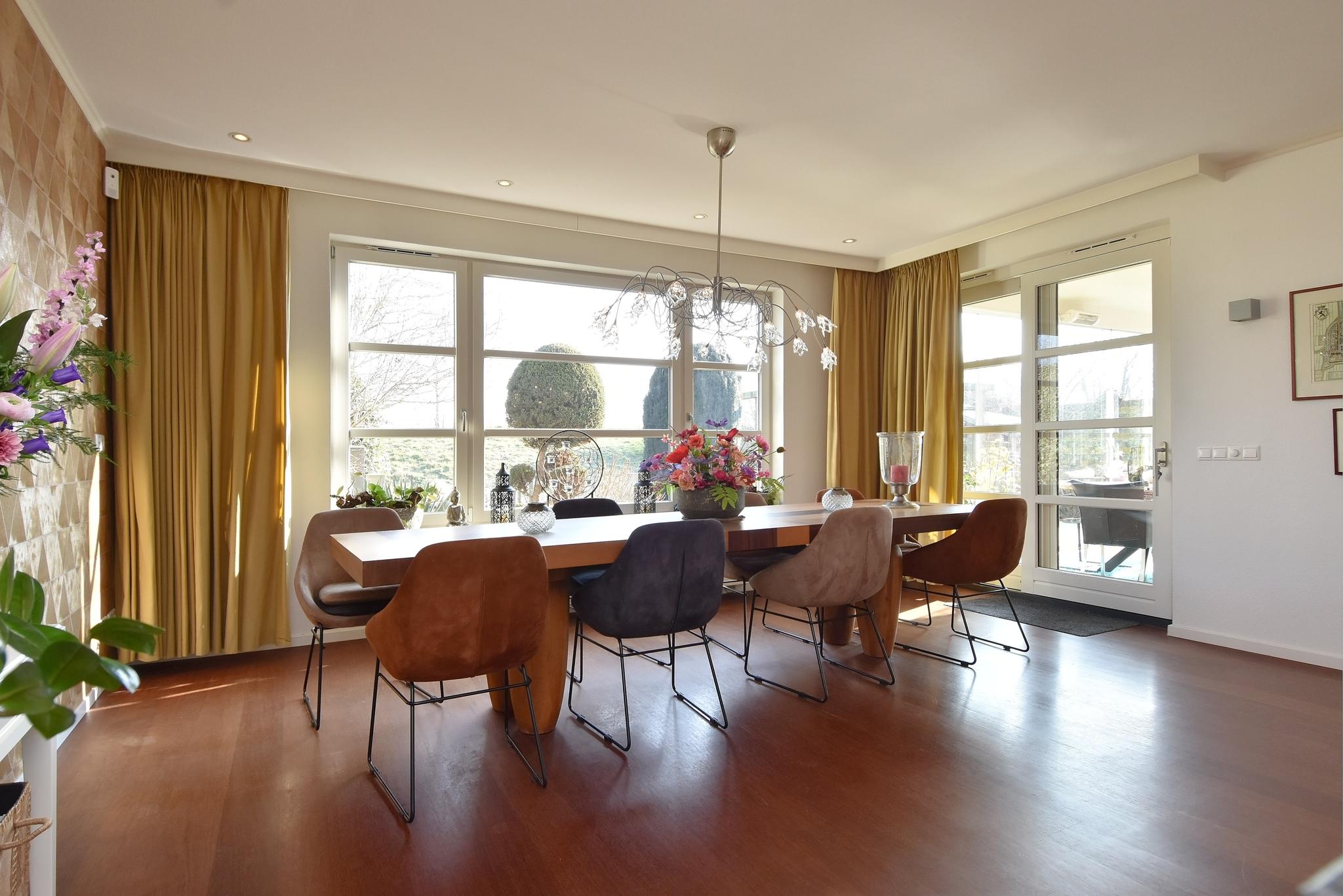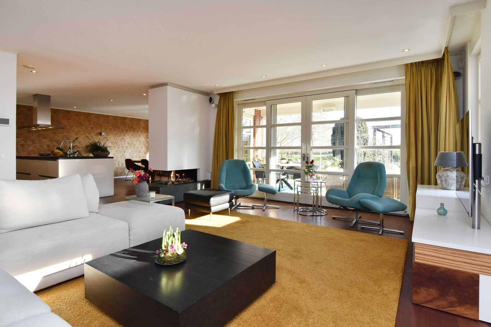 Wauw, wat een ruimte! De living is sfeervol ingericht met een erker, gashaard en parketvloer. De grote raampartijen bieden een prachtig uitzicht.