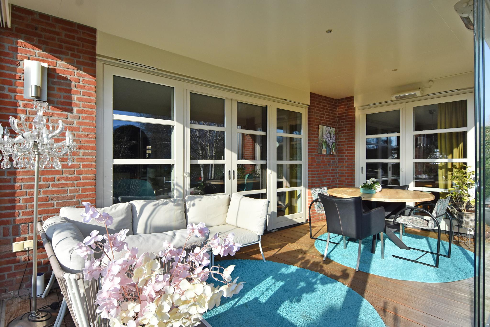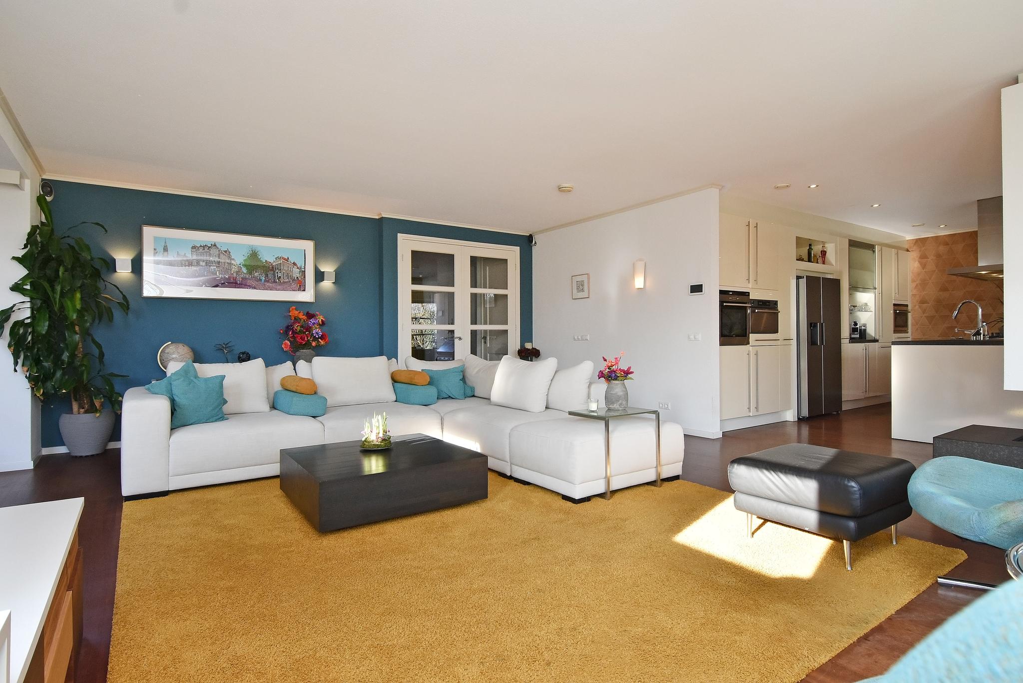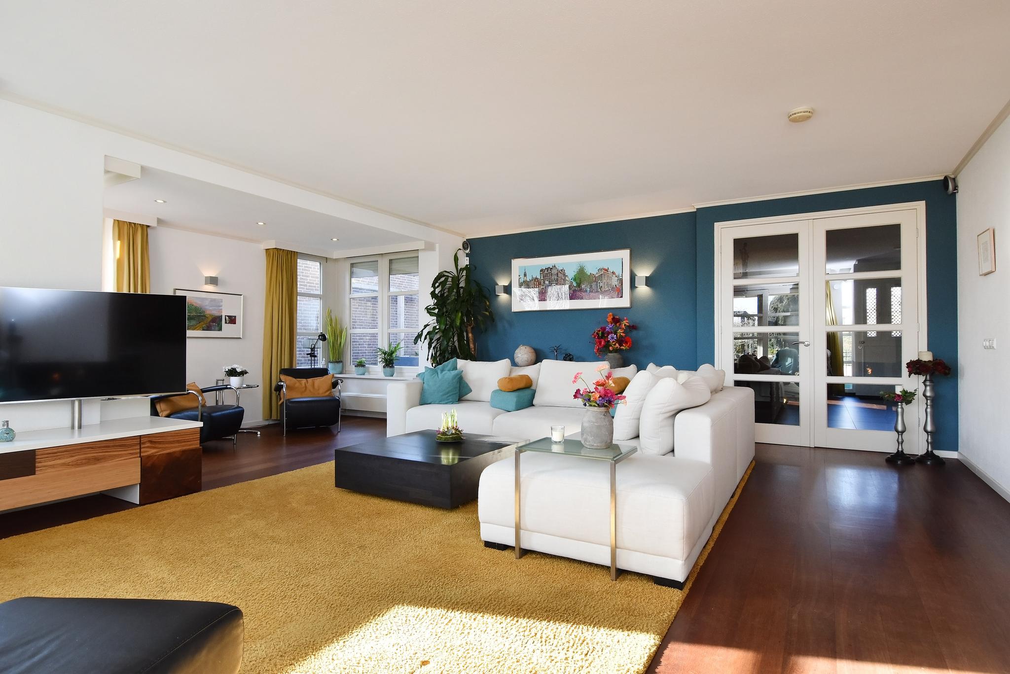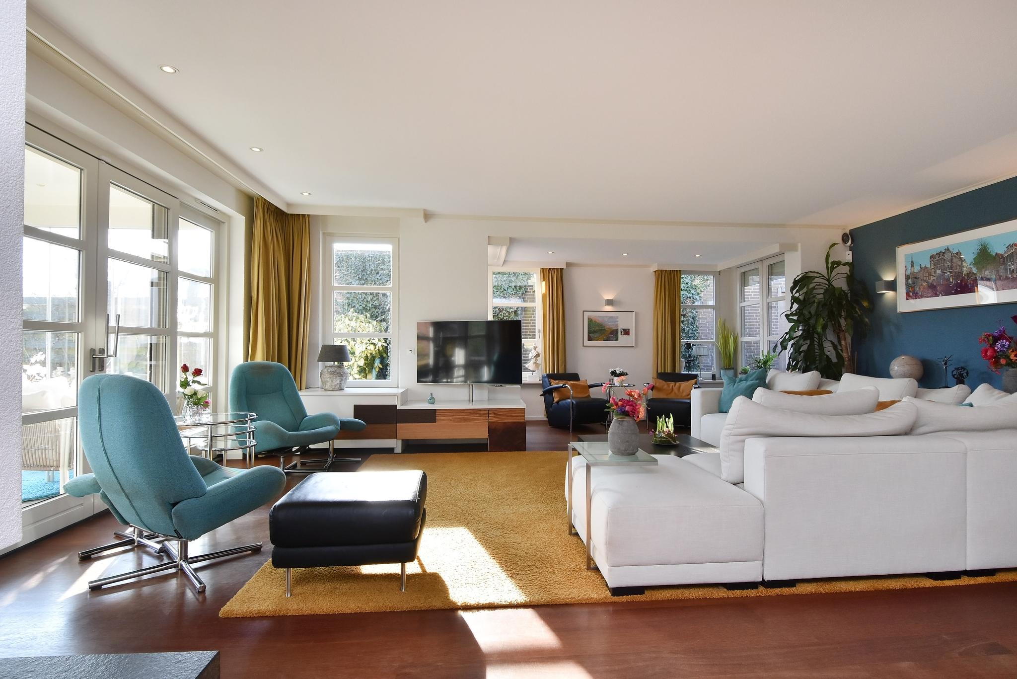 Wauw, wat een ruimte! De living is sfeervol ingericht met een erker, gashaard en parketvloer. De grote raampartijen bieden een prachtig uitzicht.
