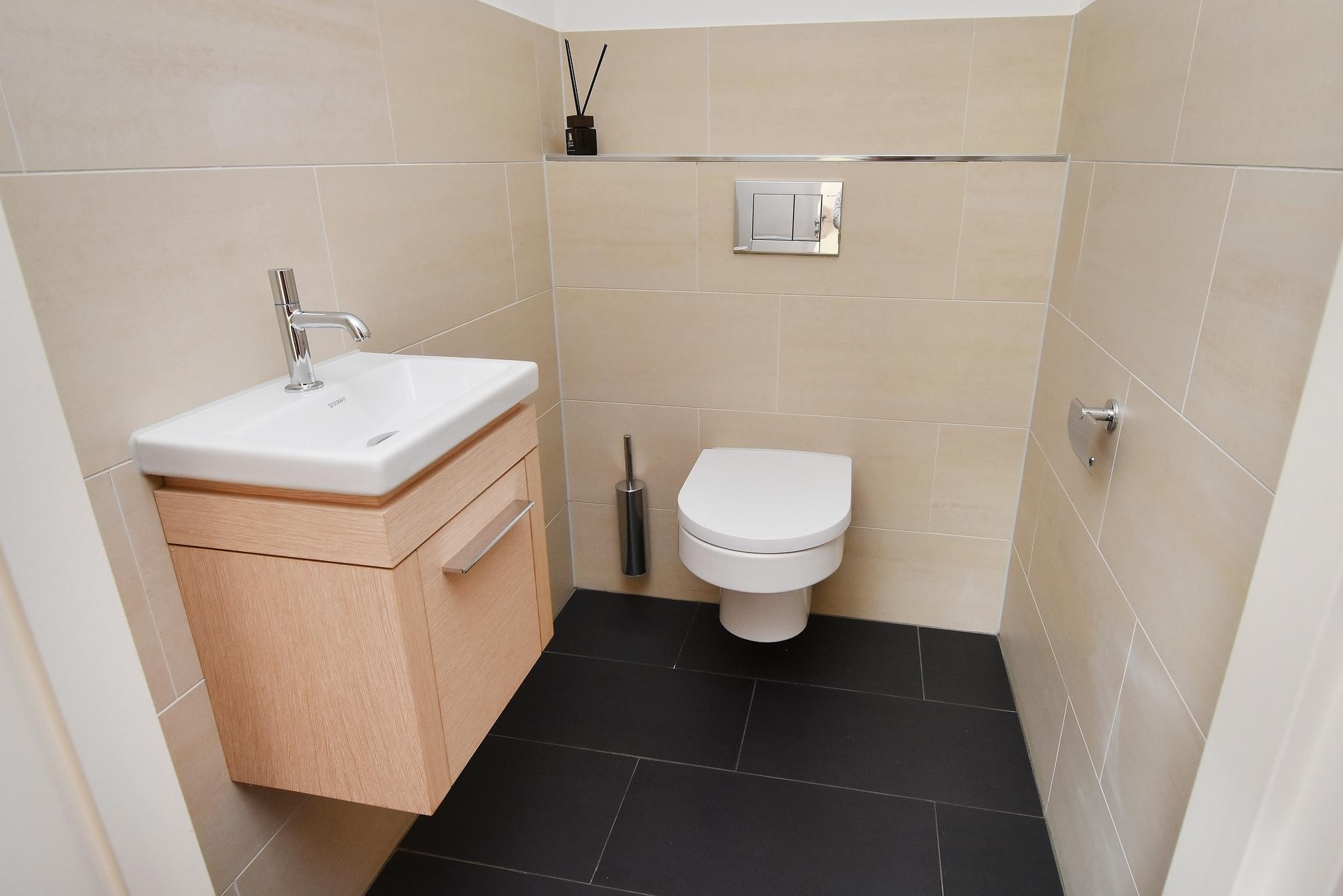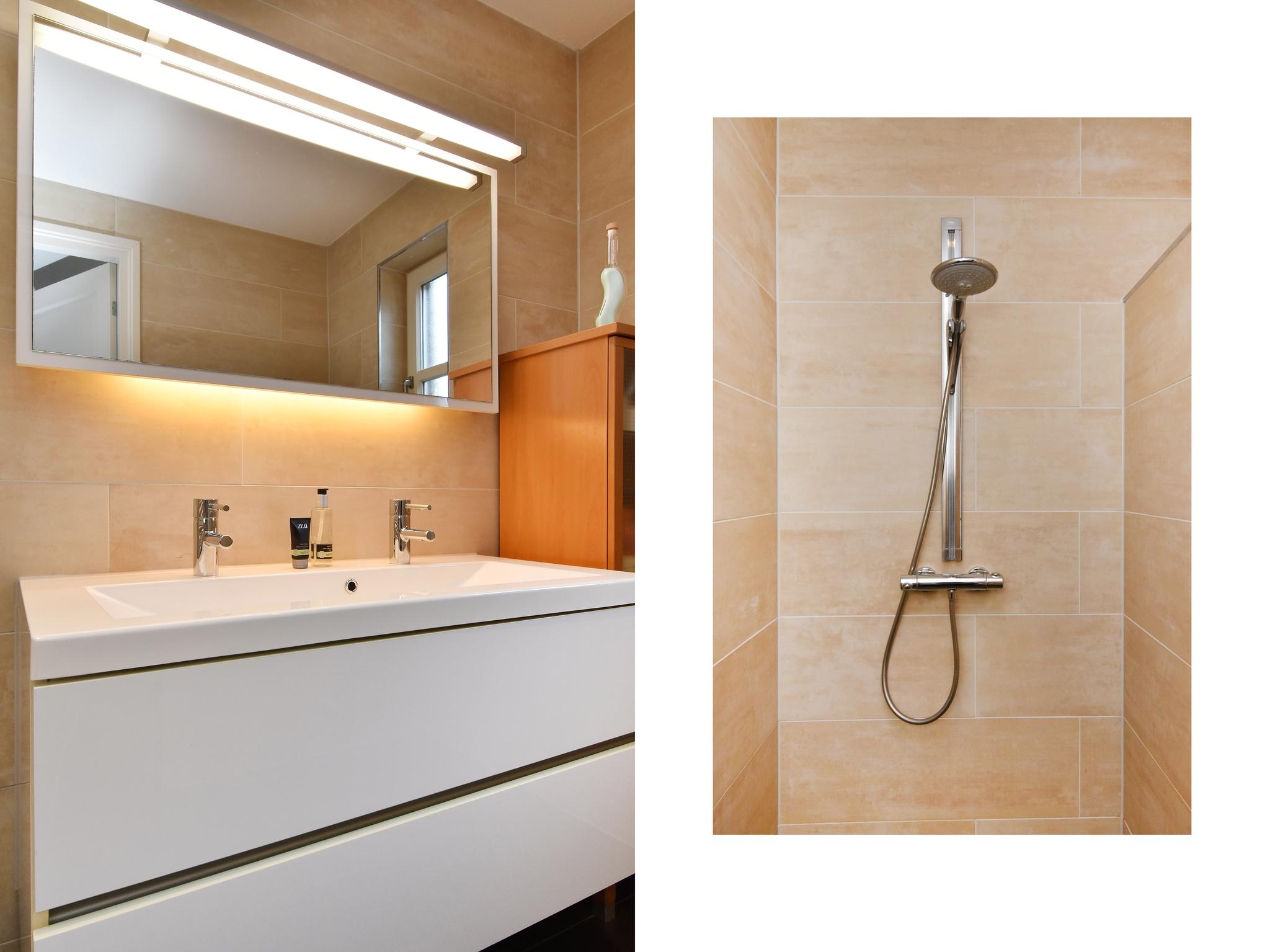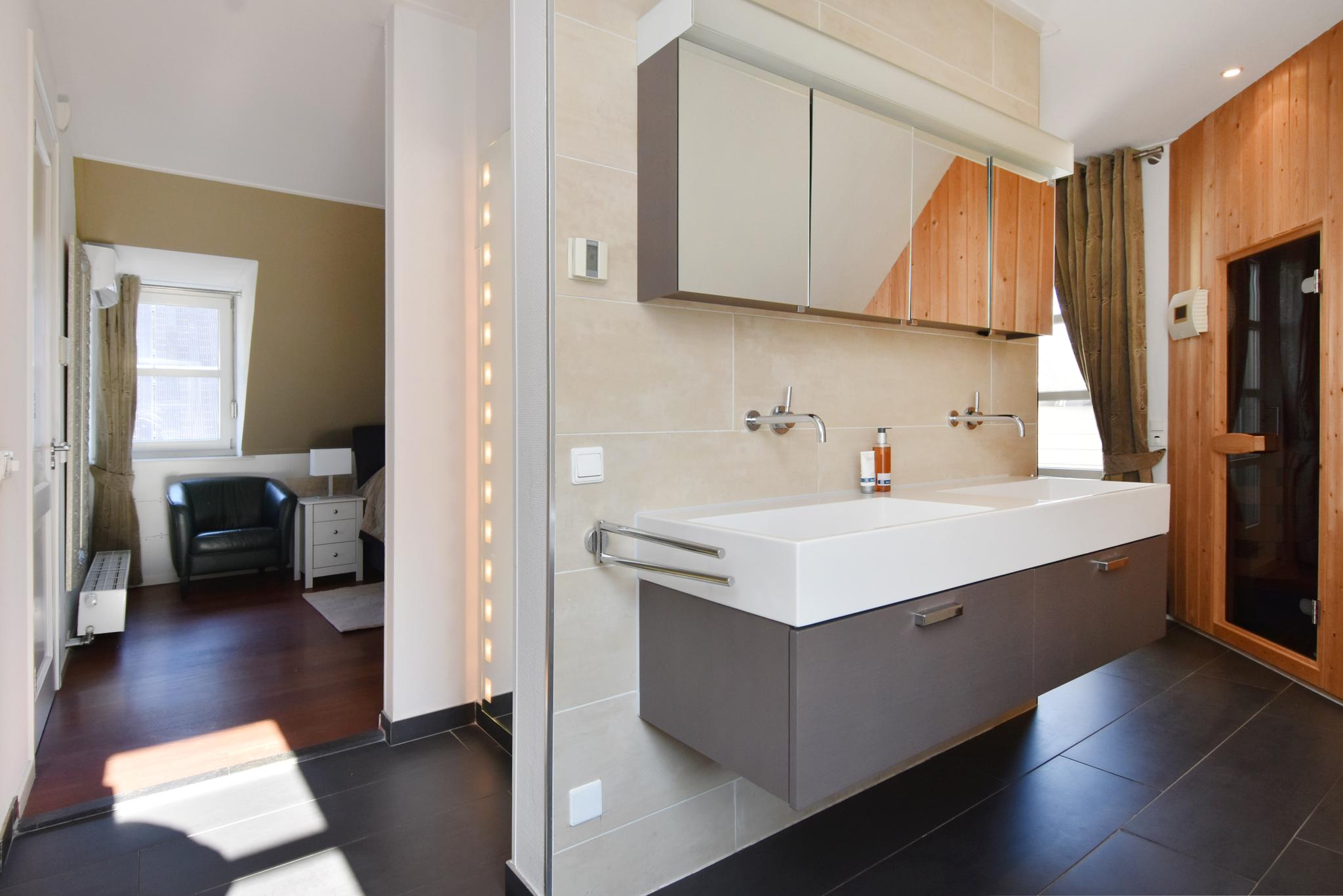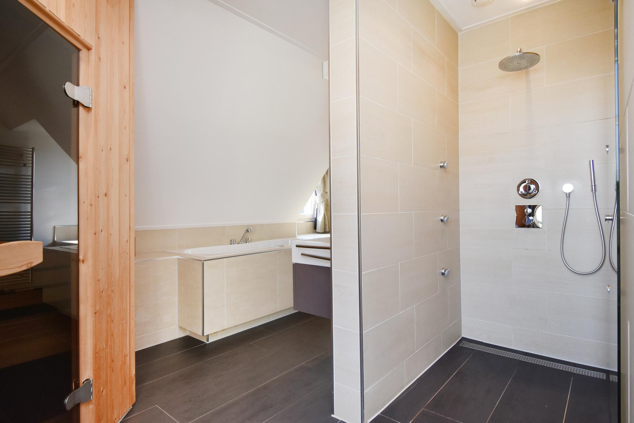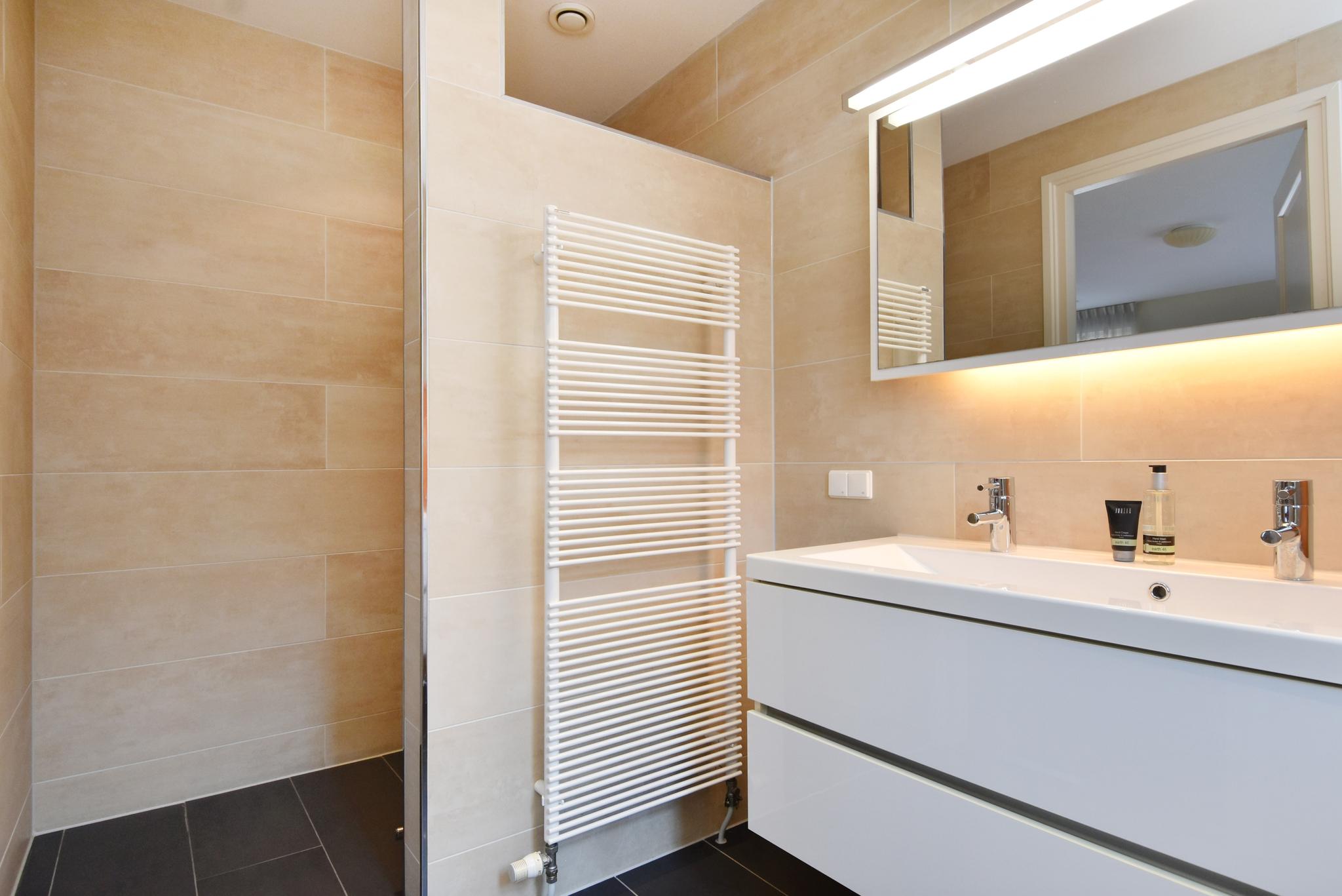 Gelijkvloers wonen is mogelijk dankzij de slaapkamer met en-suite badkamer. De badkamer is keurig afgewerkt met een inloopdouche en een dubbel wastafelmeubel.