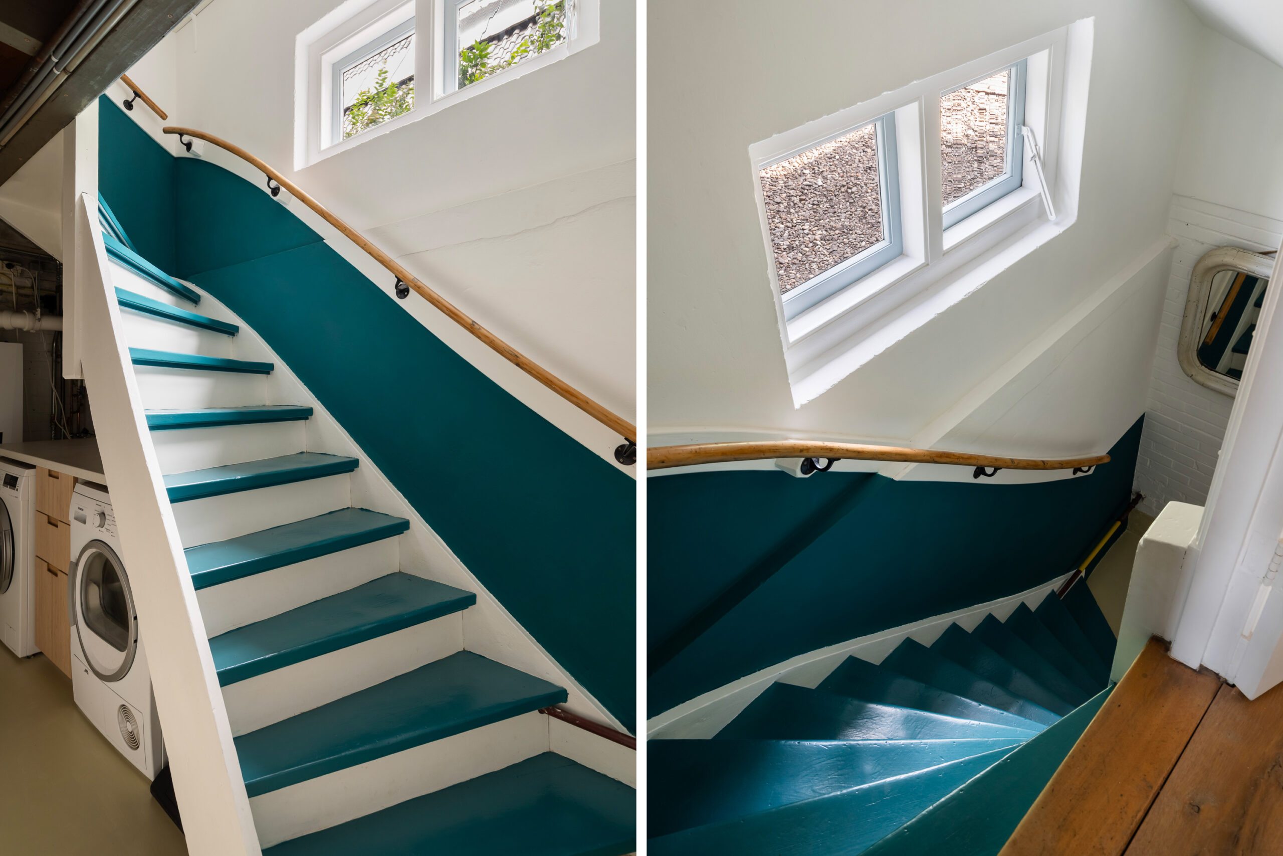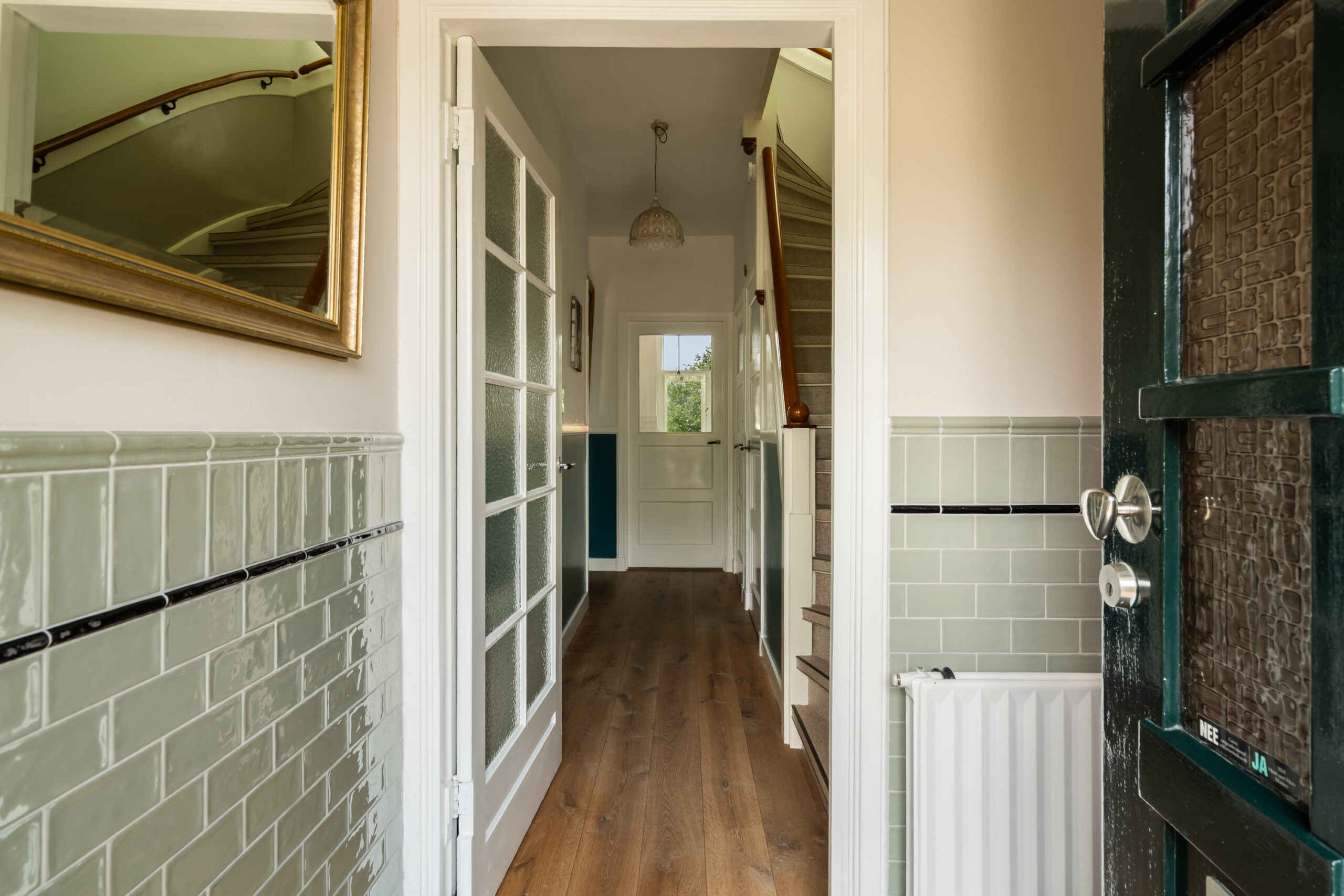 Parkeer de auto’s op eigen terrein en kom binnen. Meteen bij aankomst valt het oog op het glas-in-lood en de klassieke jaren ’30-stijl tegeltjes in het tochtportaal. In de hal bevindt zich de trapopgang, toegang tot het souterrain en een toiletruimte met fonteintje.