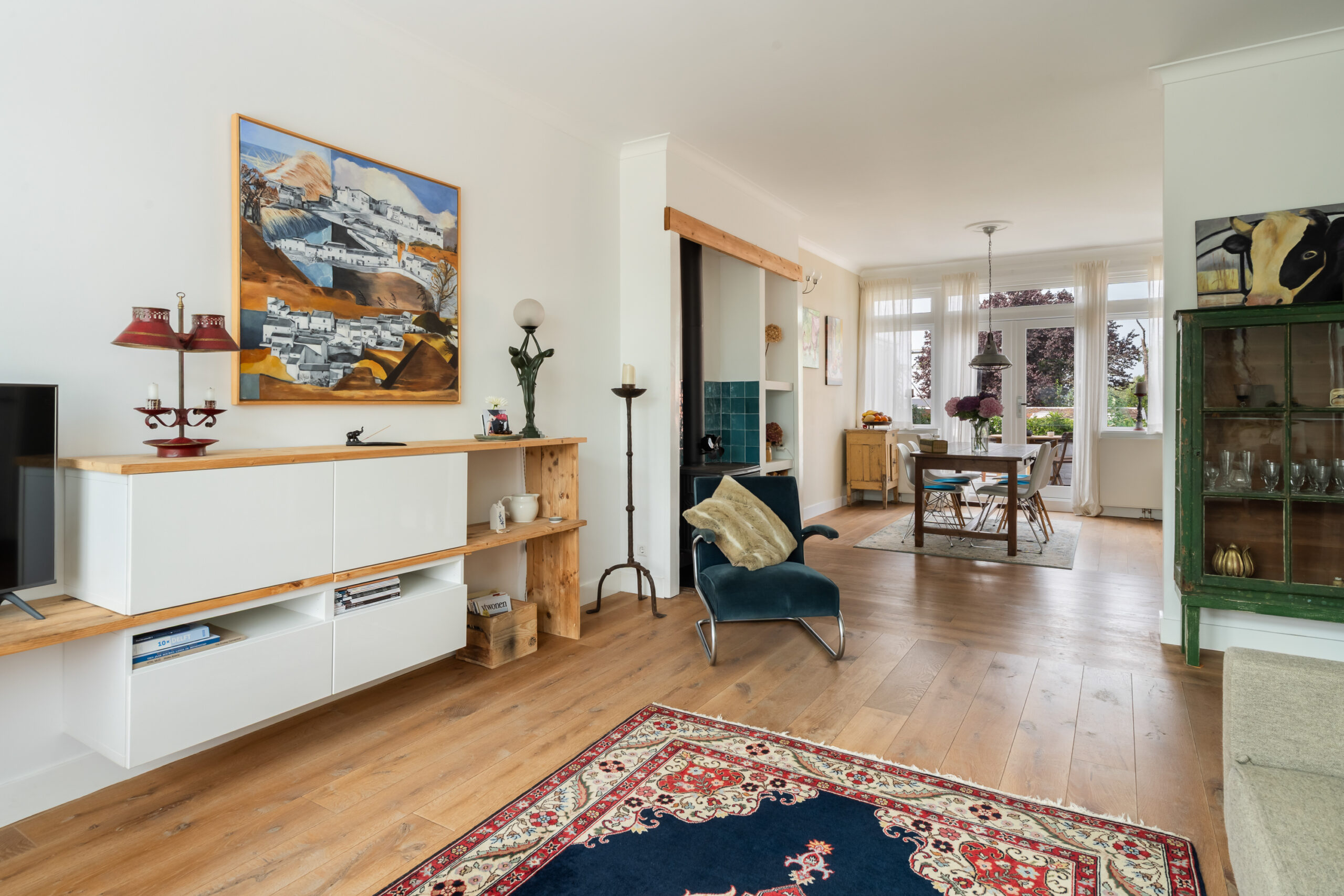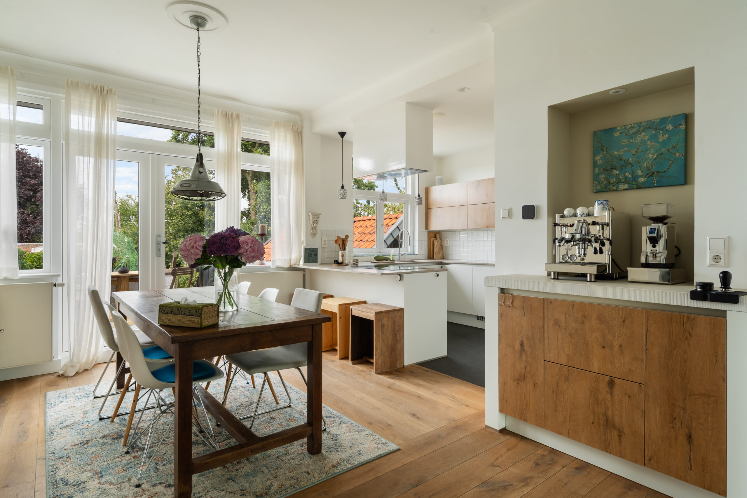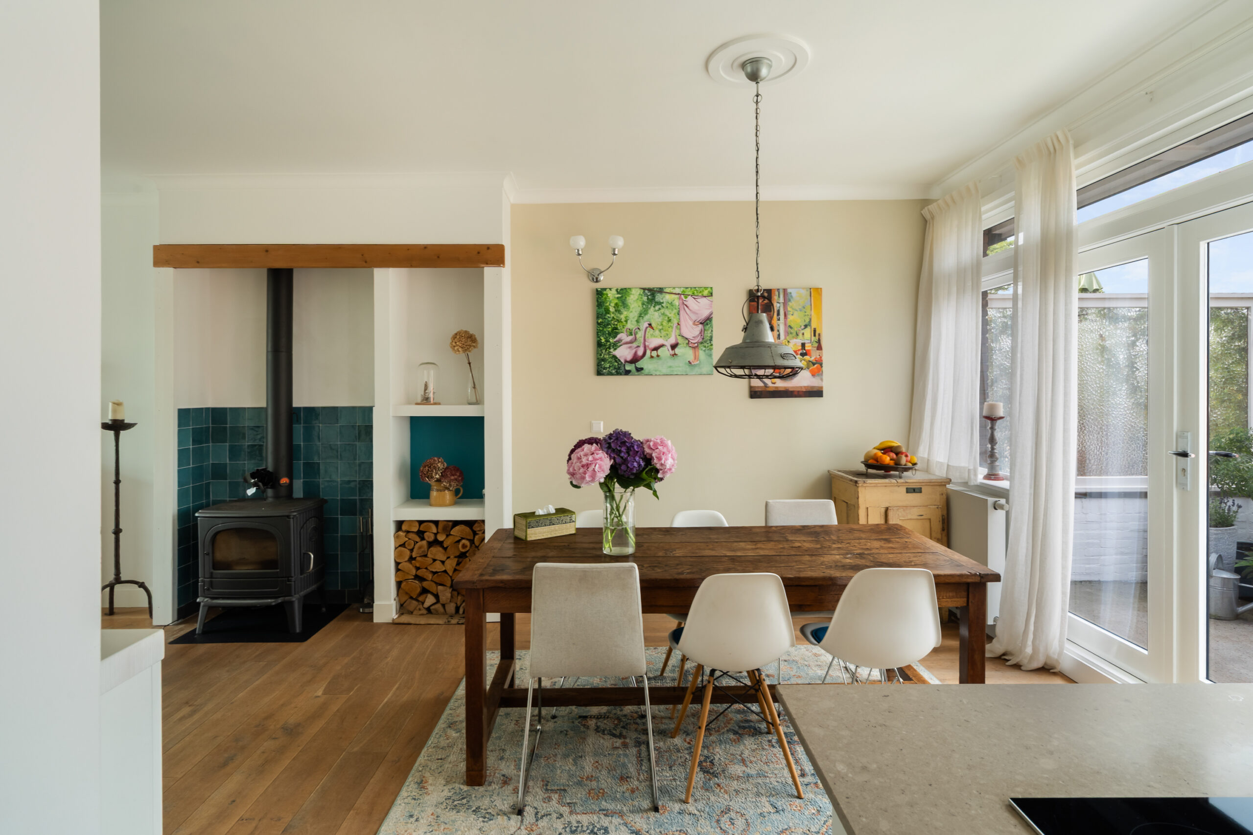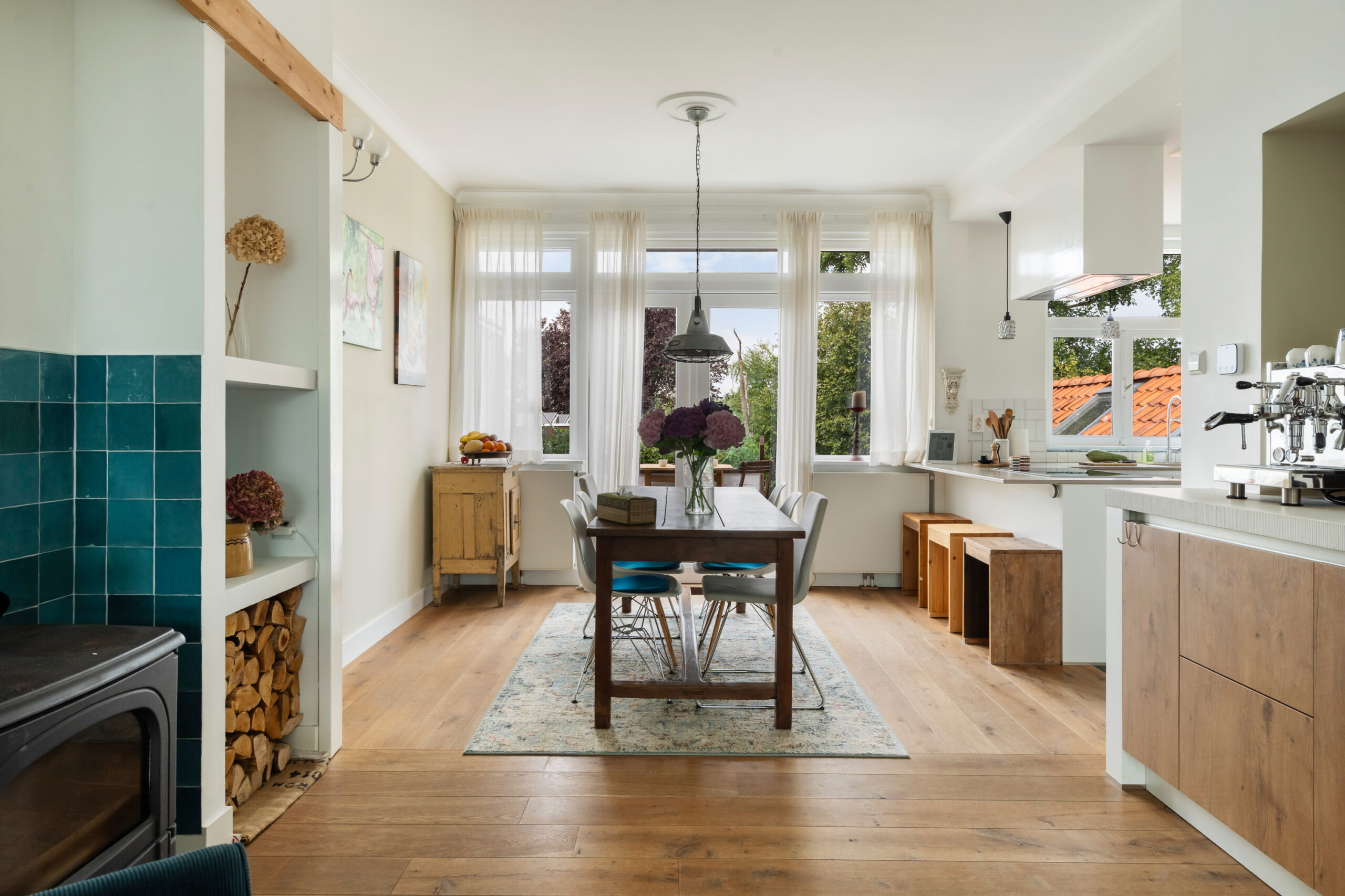 Wat een sfeer en karakter: de erker met glas-in-loodramen, de houten vloer en de gezellige houtkachel met daartegenover een stijlvolle koffiecorner. Aan de achterzijde is de moderne open keuken met kookeiland met bar, perfect om te koken en te borrelen. Openslaande deuren vanuit de eethoek geven toegang tot het balkon en bieden uitzicht op de groene achtertuin.