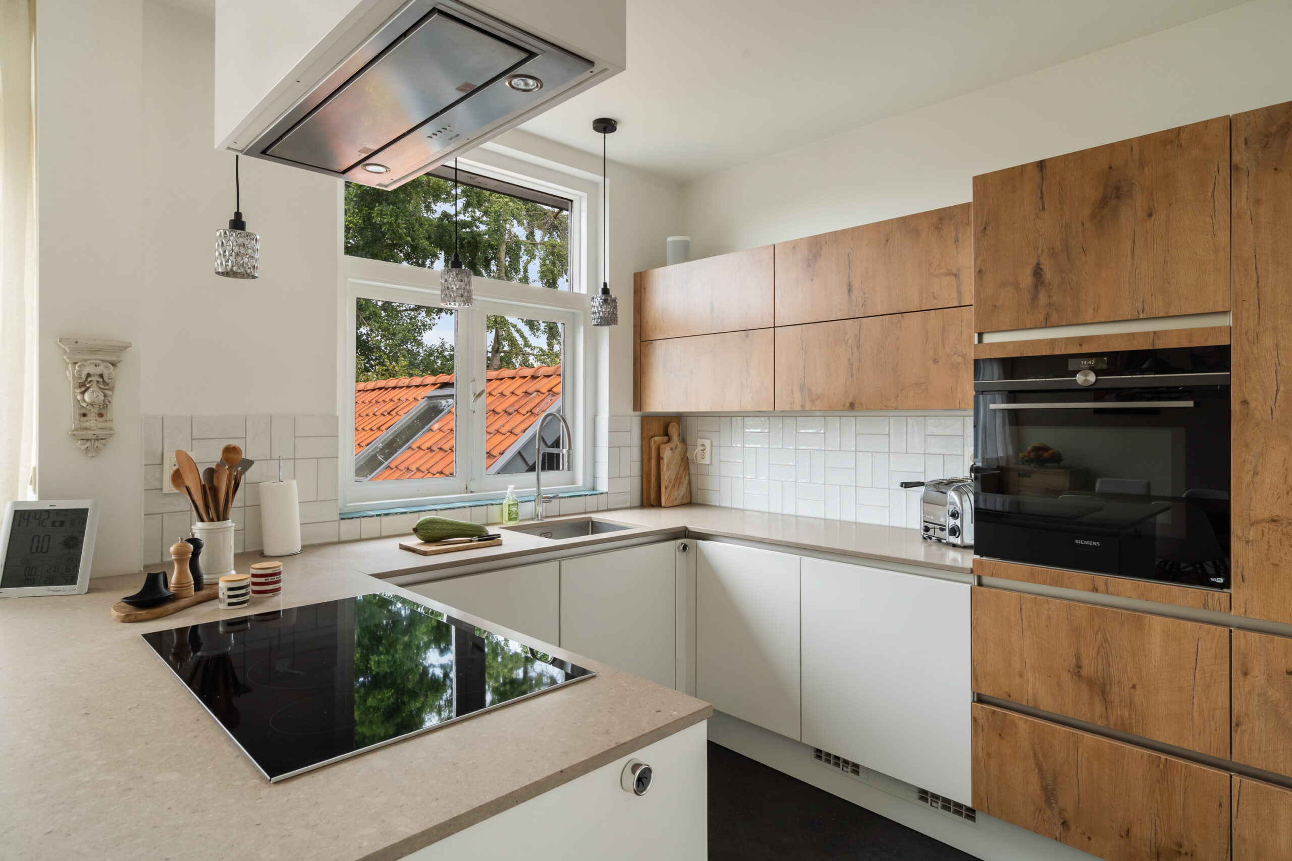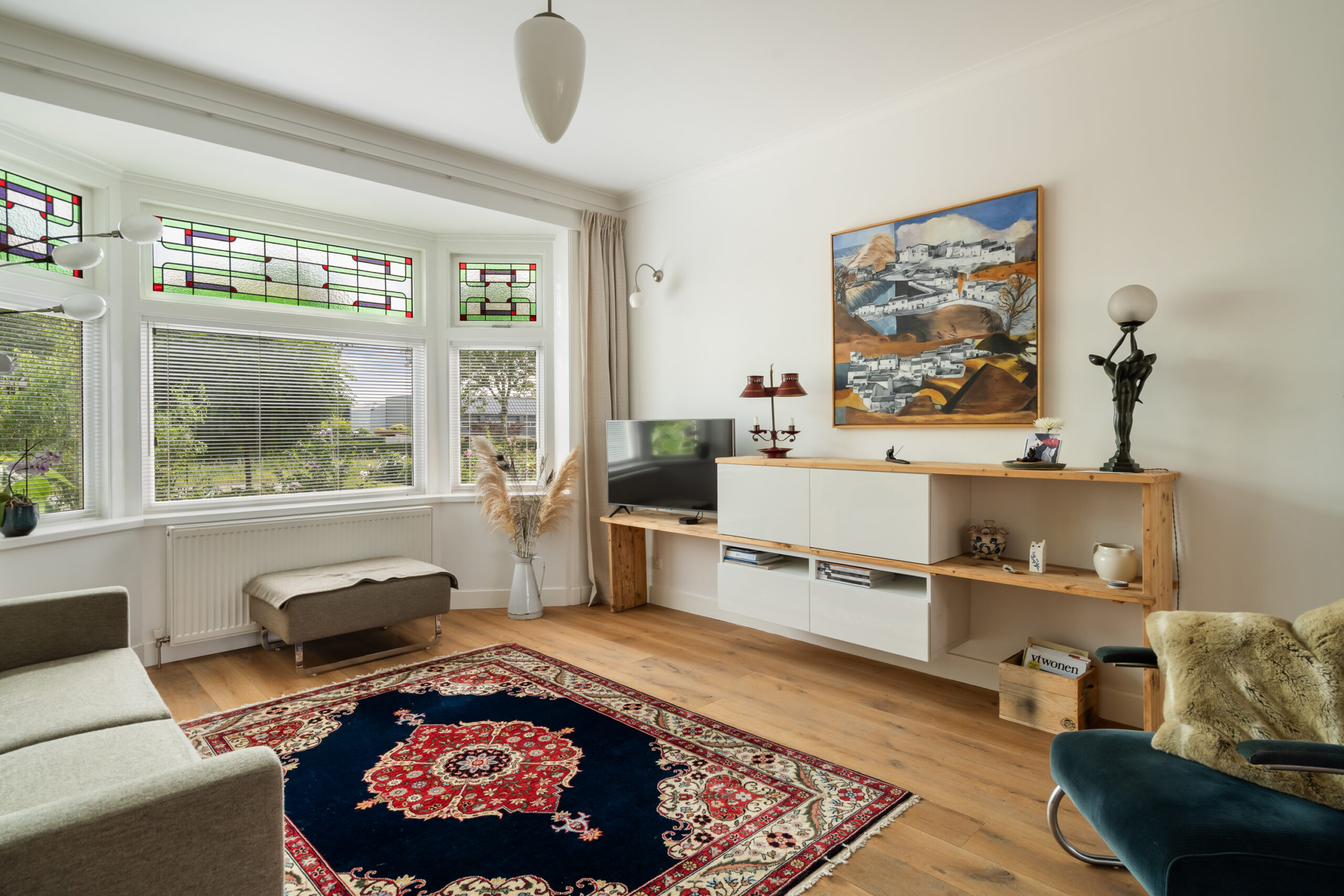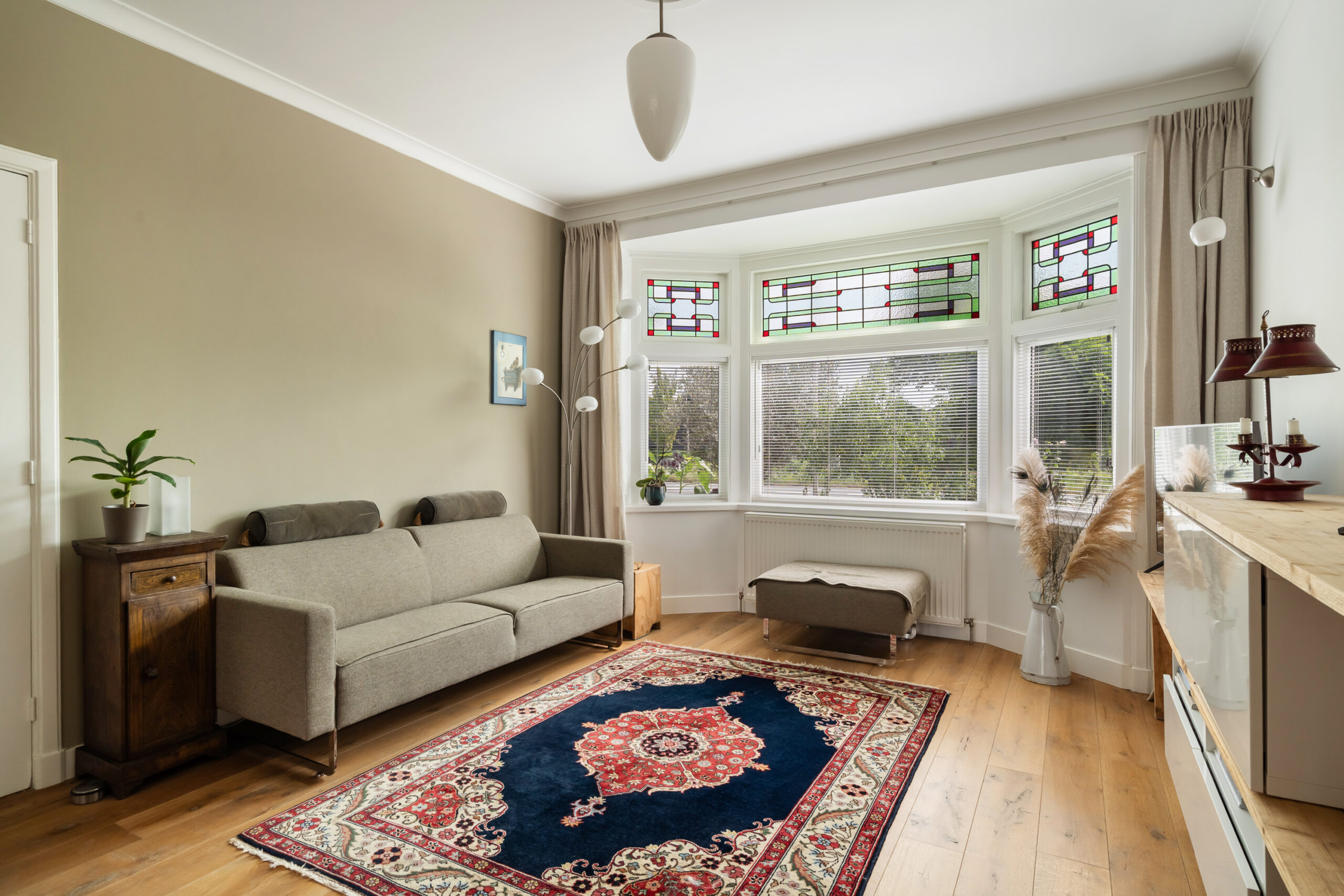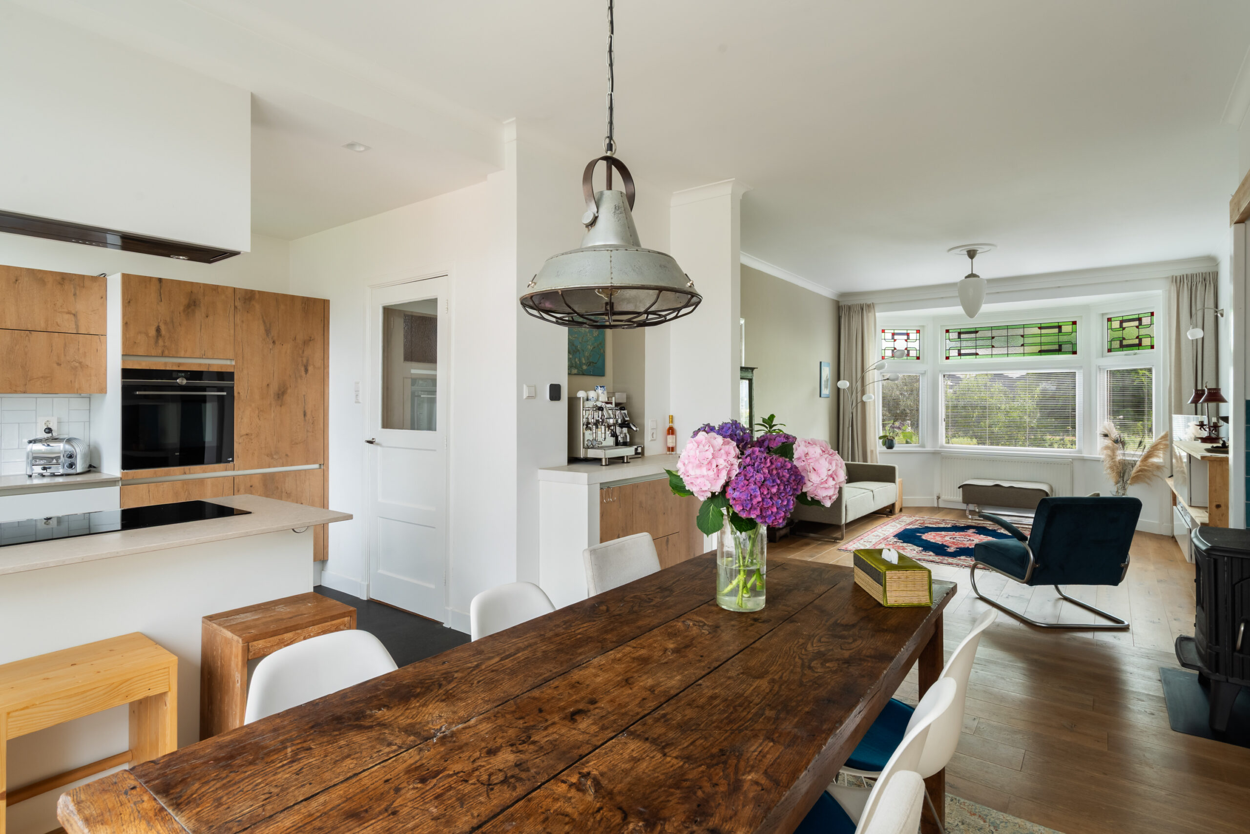 Wat een sfeer en karakter: de erker met glas-in-loodramen, de houten vloer en de gezellige houtkachel met daartegenover een stijlvolle koffiecorner. Aan de achterzijde is de moderne open keuken met kookeiland met bar, perfect om te koken en te borrelen. Openslaande deuren vanuit de eethoek geven toegang tot het balkon en bieden uitzicht op de groene achtertuin.