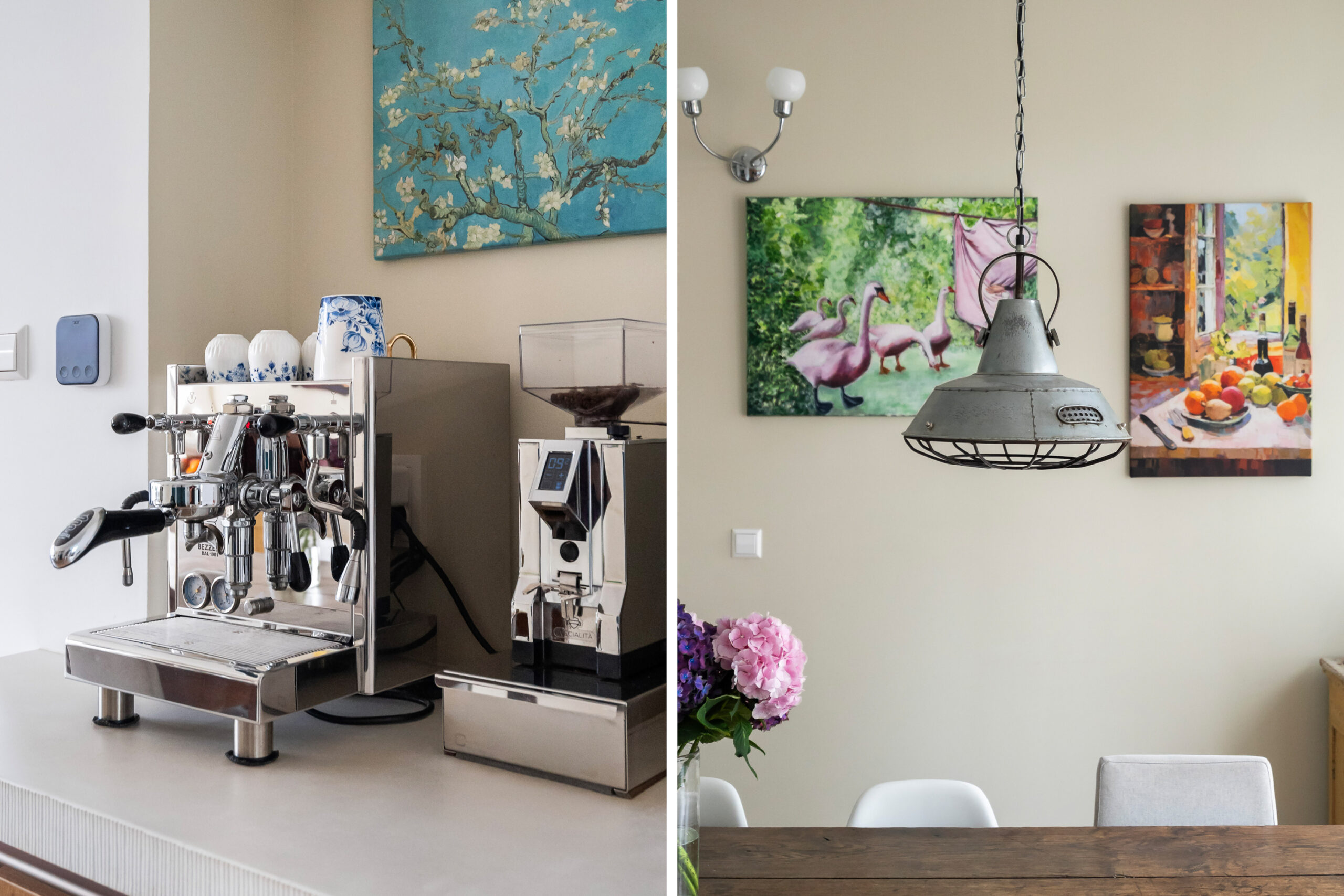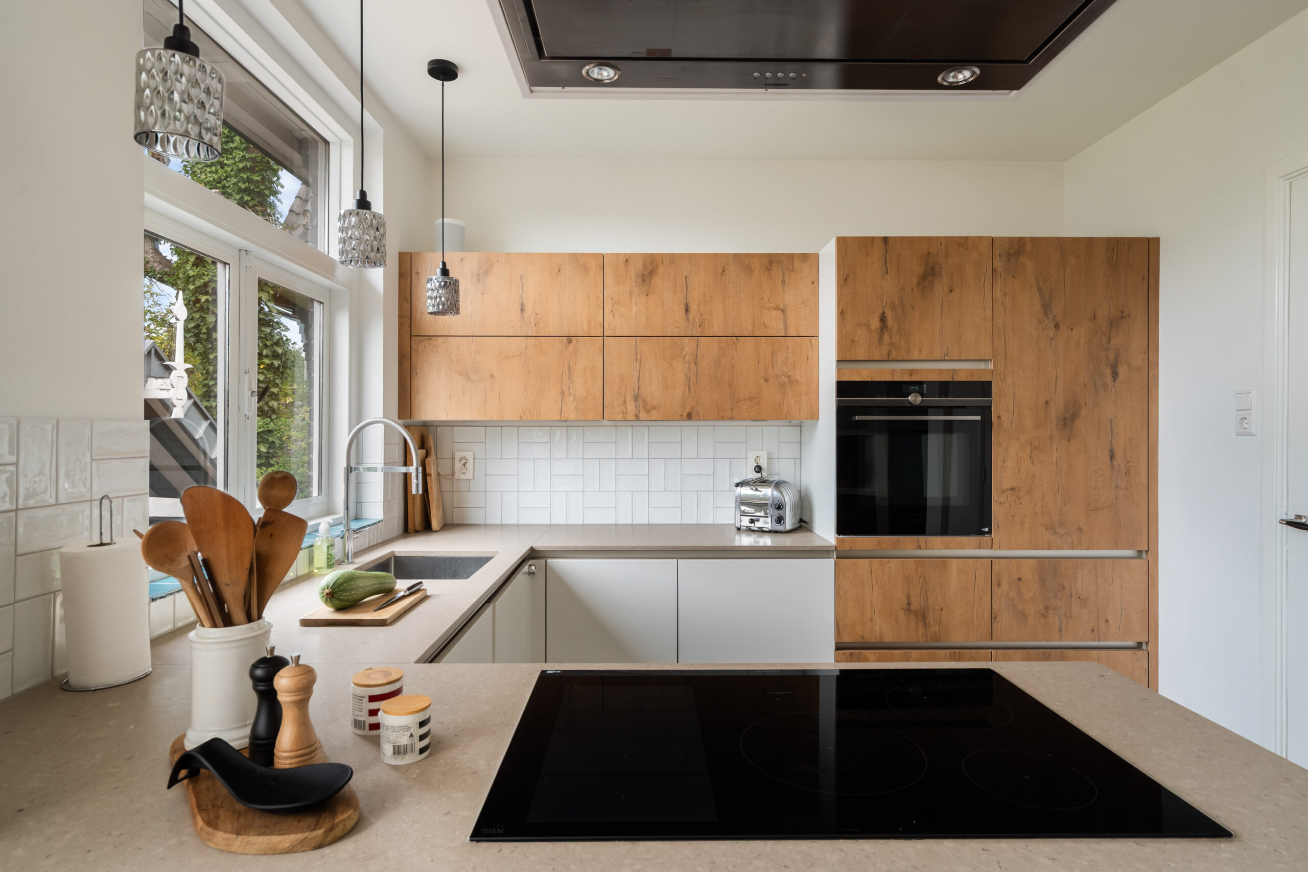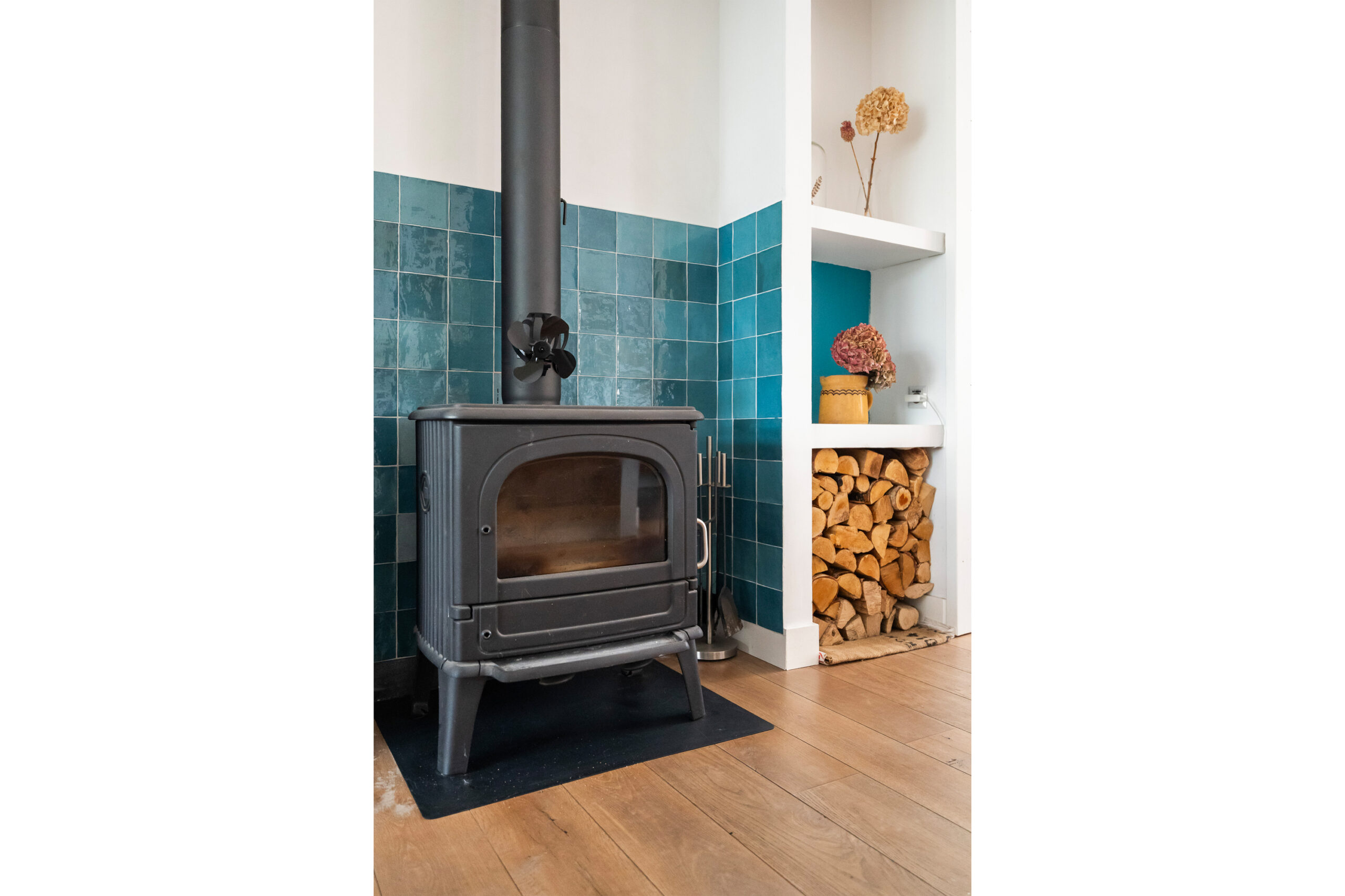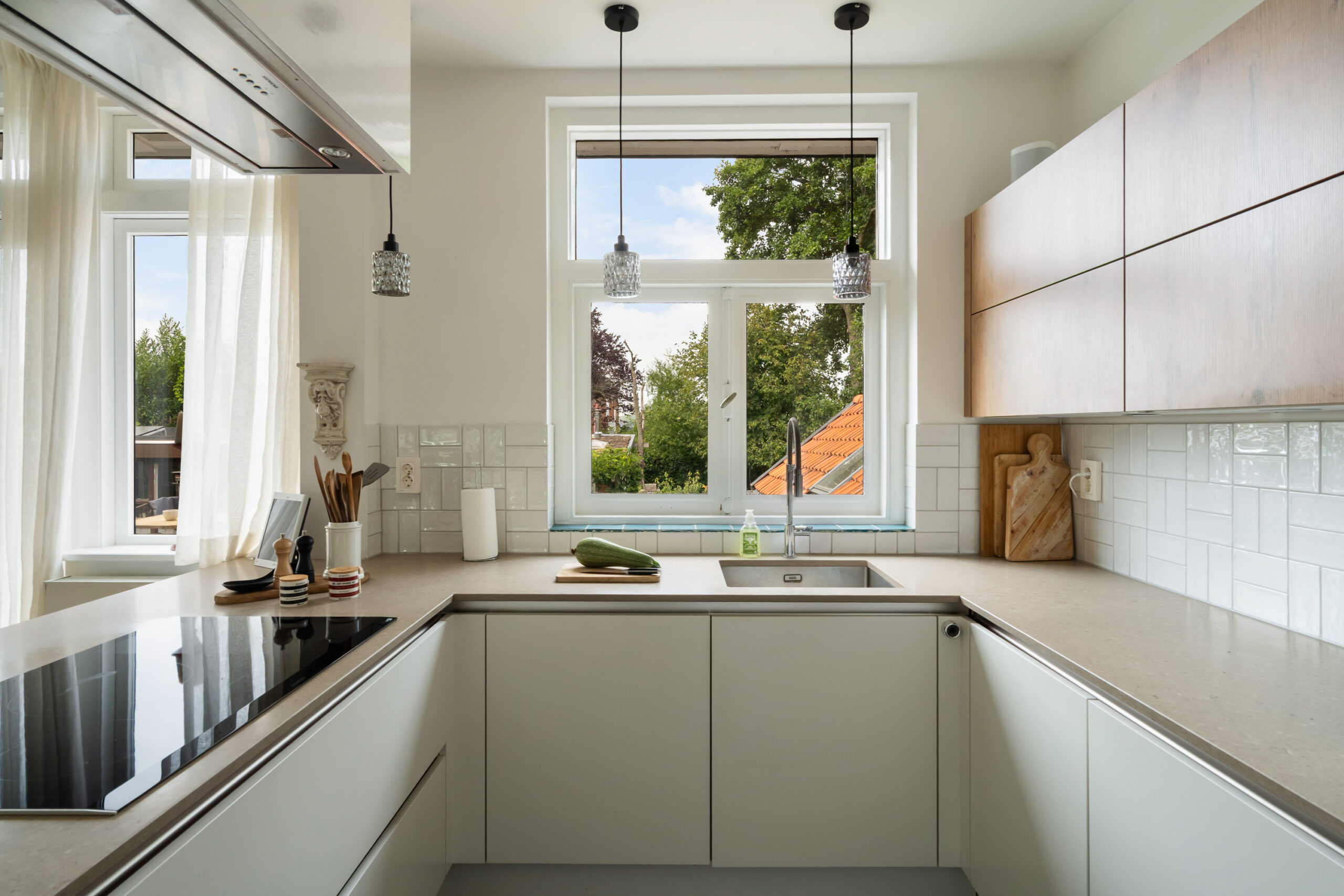 Wat een sfeer en karakter: de erker met glas-in-loodramen, de houten vloer en de gezellige houtkachel met daartegenover een stijlvolle koffiecorner. Aan de achterzijde is de moderne open keuken met kookeiland met bar, perfect om te koken en te borrelen. Openslaande deuren vanuit de eethoek geven toegang tot het balkon en bieden uitzicht op de groene achtertuin.