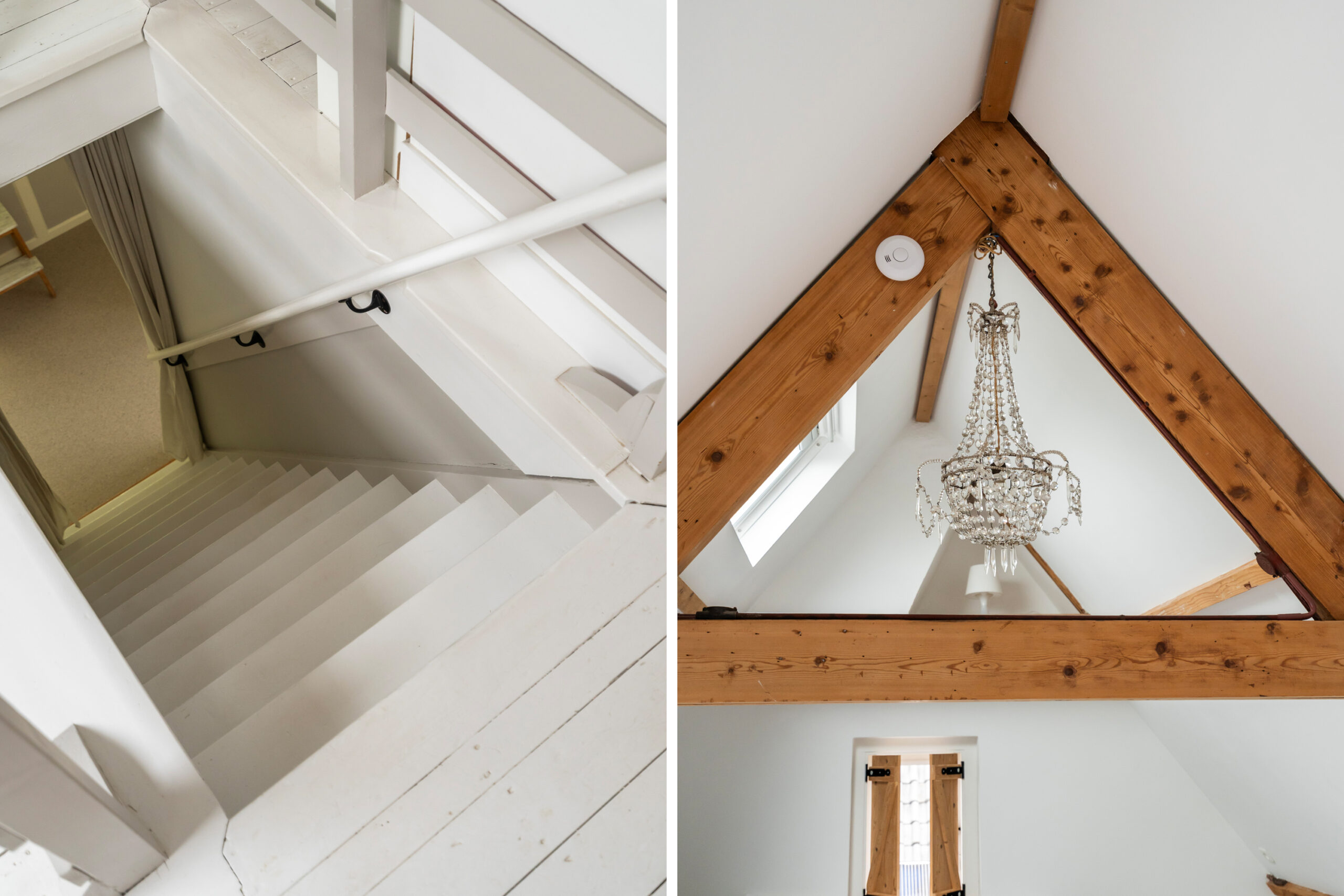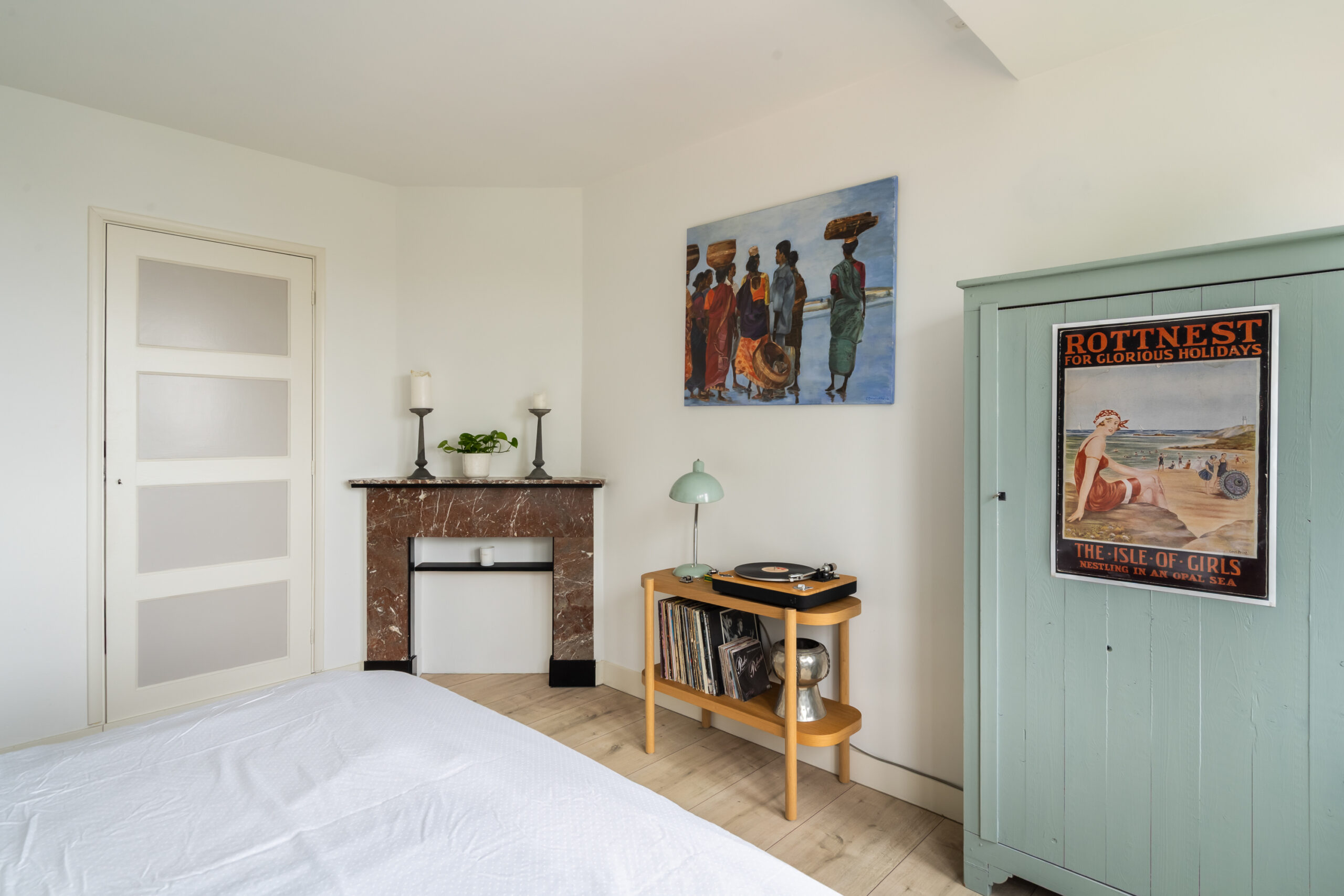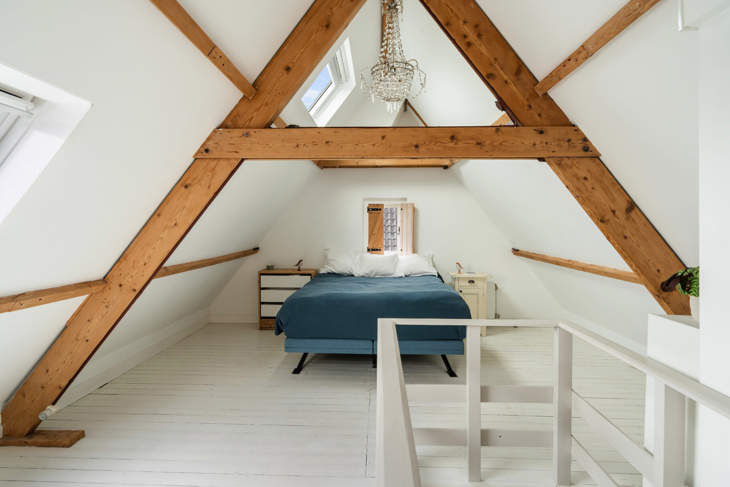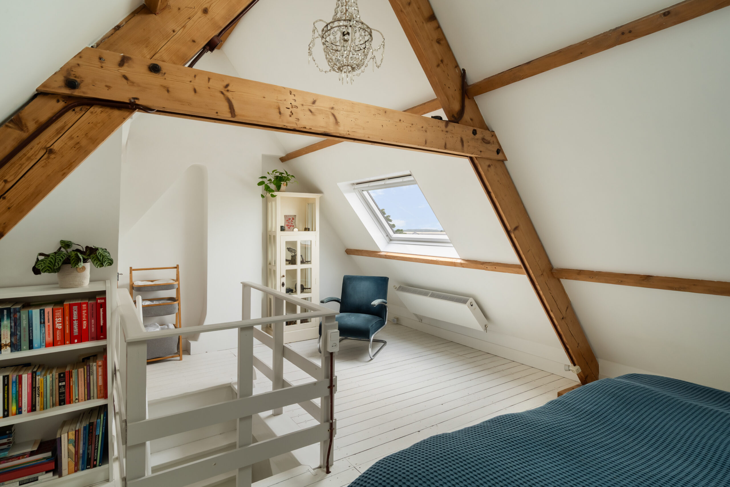 Een absolute eyecatcher zijn de originele houten spanten, deze geven de ruimte een unieke uitstraling. Deze verdieping is ingericht als slaapkamer, met een aparte toiletruimte met wastafel. Het elektrische hoge dakraam maakt de ruimte extra licht.