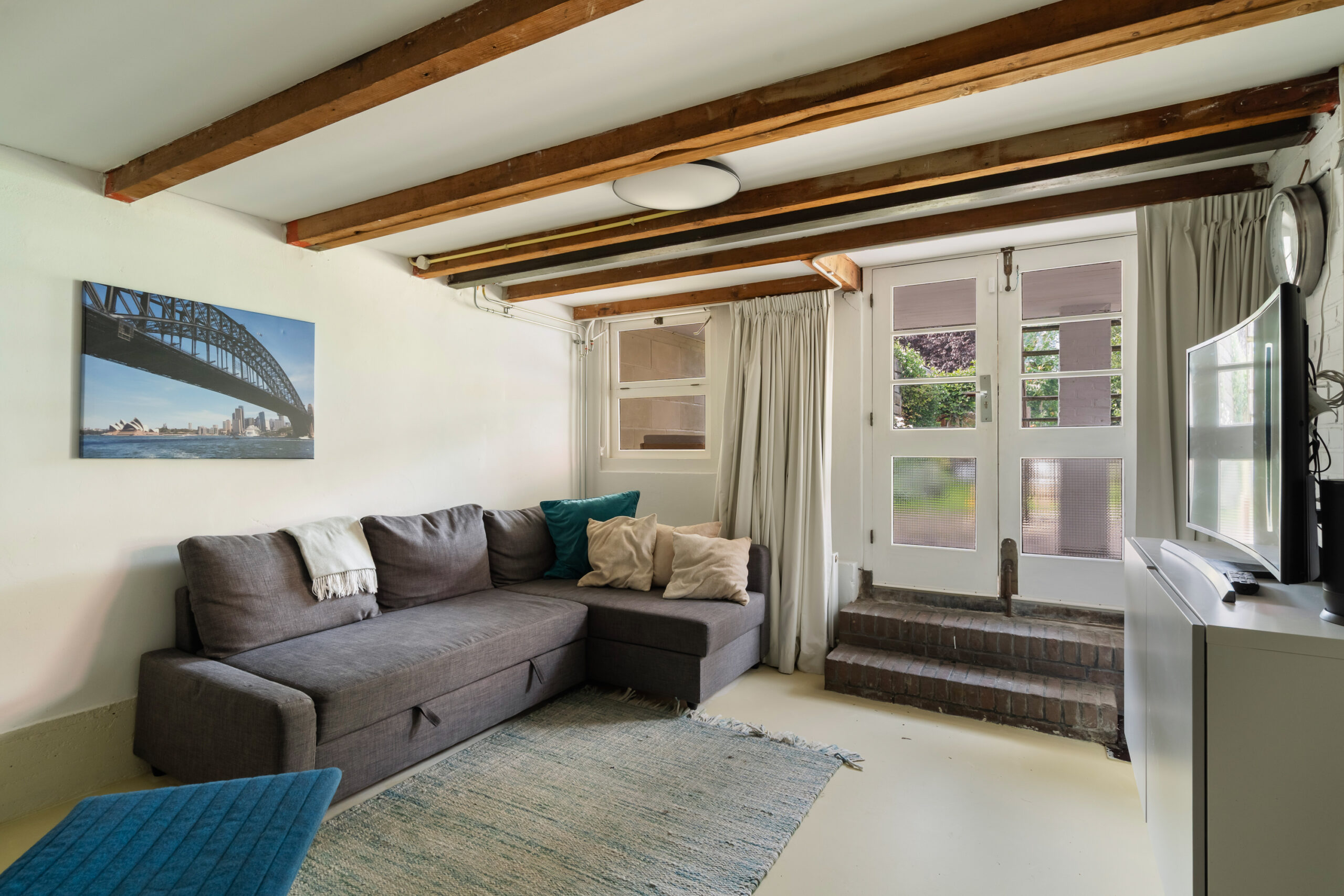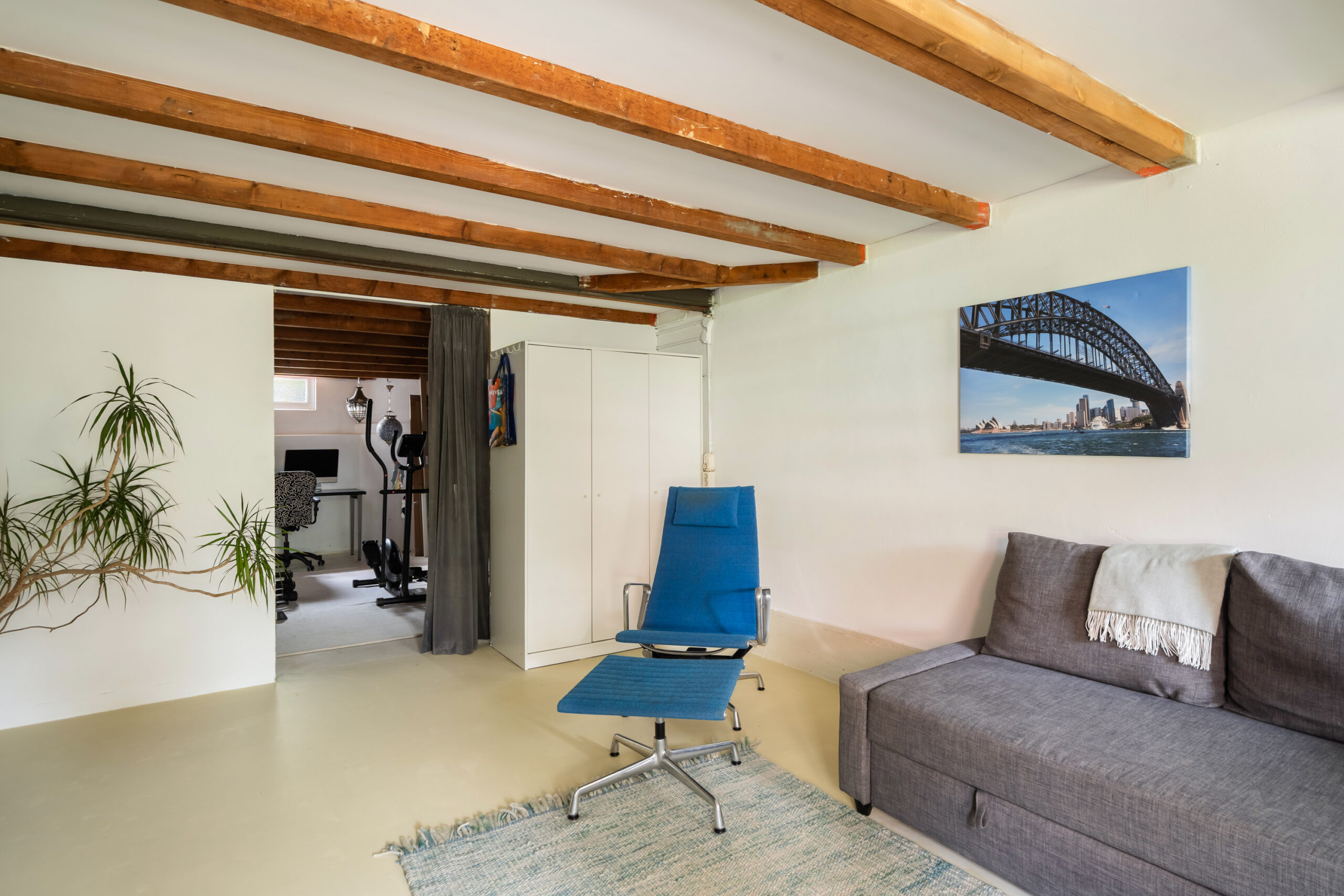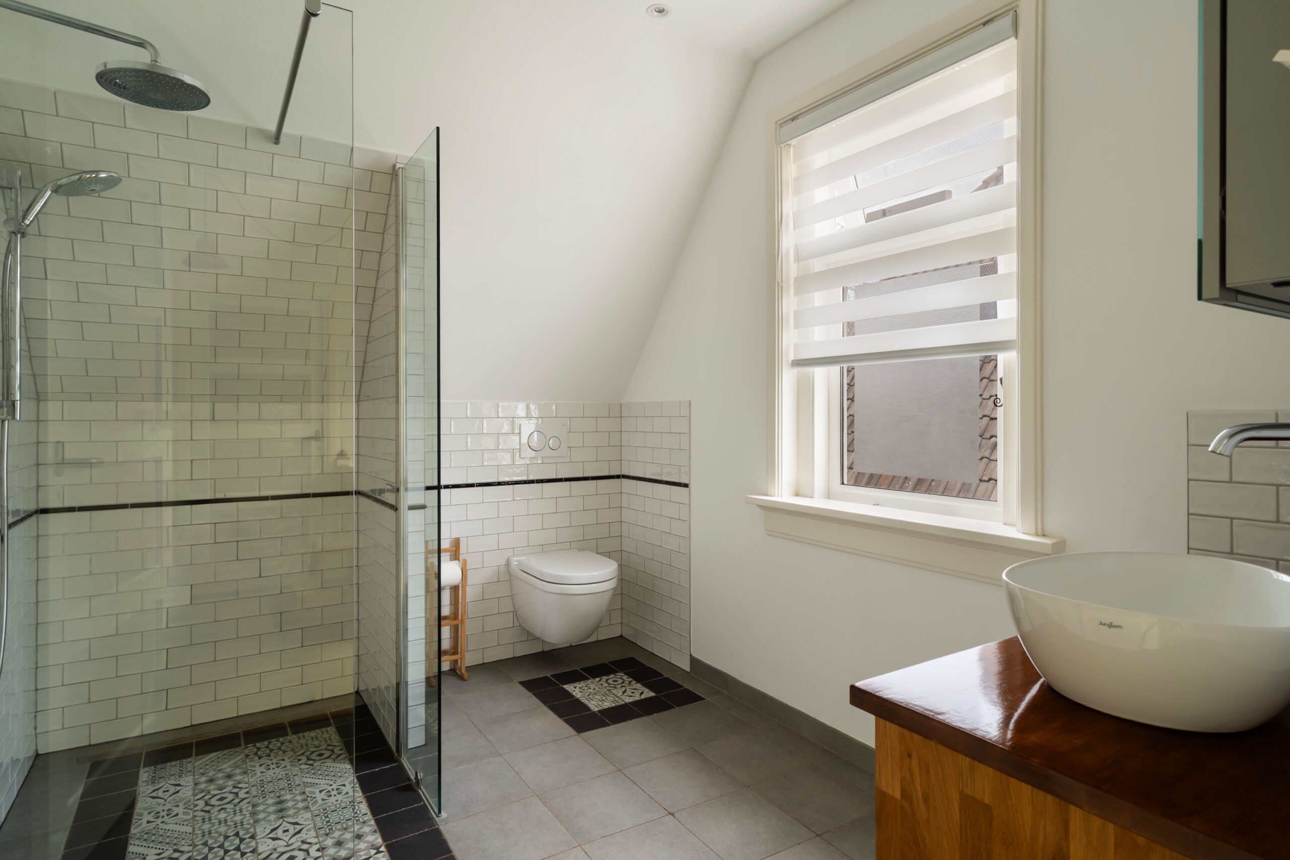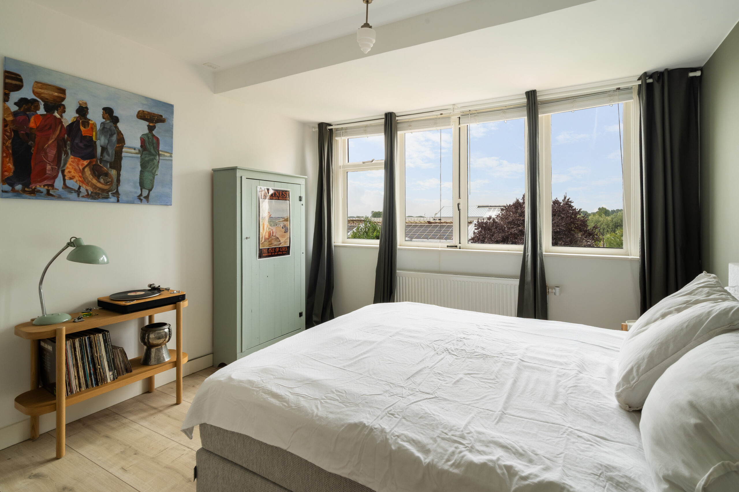 Een absolute eyecatcher zijn de originele houten spanten, deze geven de ruimte een unieke uitstraling. Deze verdieping is ingericht als slaapkamer, met een aparte toiletruimte met wastafel. Het elektrische hoge dakraam maakt de ruimte extra licht.