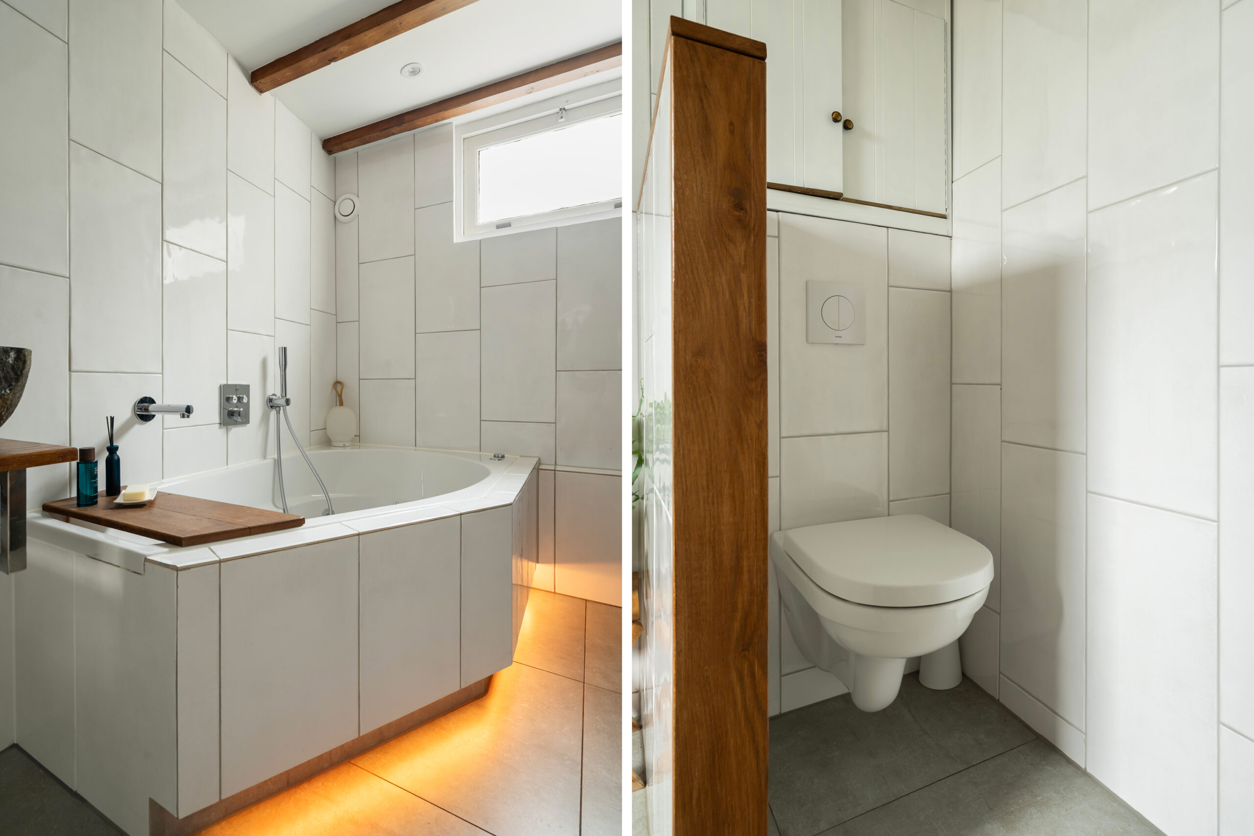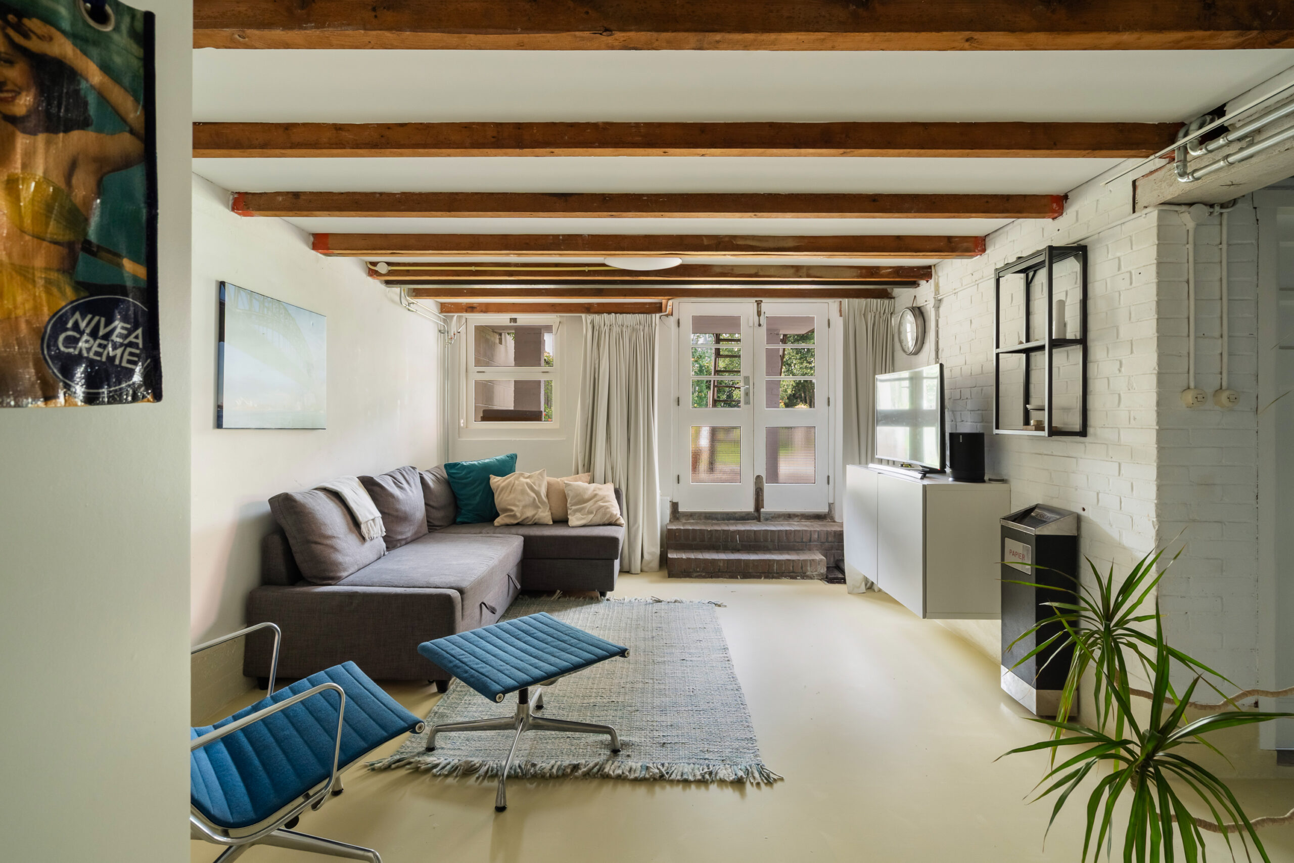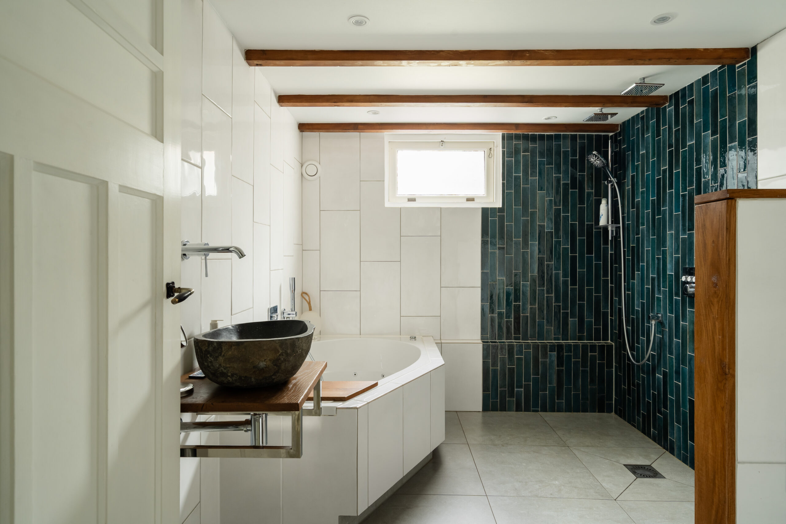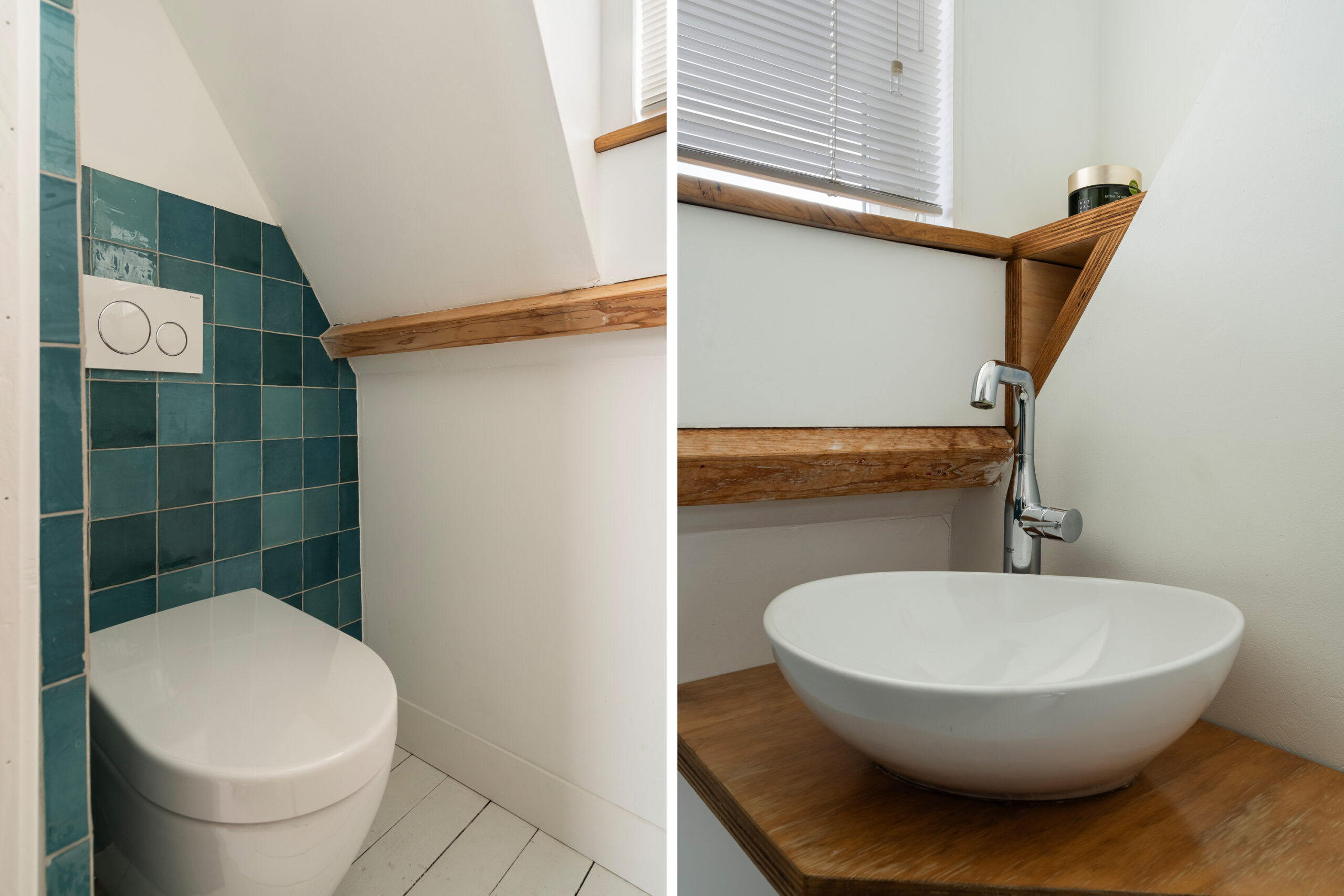 Een absolute eyecatcher zijn de originele houten spanten, deze geven de ruimte een unieke uitstraling. Deze verdieping is ingericht als slaapkamer, met een aparte toiletruimte met wastafel. Het elektrische hoge dakraam maakt de ruimte extra licht.
