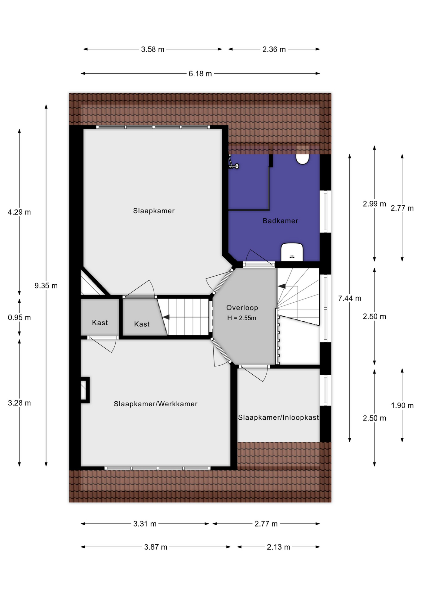 Op deze verdieping bevinden zich drie slaapkamers, waarvan één momenteel is ingericht als inloopkast. In de slaapkamer aan de achterzijde staat de authentieke marmeren schouw. Dankzij de dakkapellen aan zowel de voor- als achterzijde is de gehele verdieping verrassend ruim. De badkamer is modern en compleet, voorzien van een inloopdouche, toilet, wastafelkom en een elektrisch te openen raam voor natuurlijke ventilatie en daglicht.