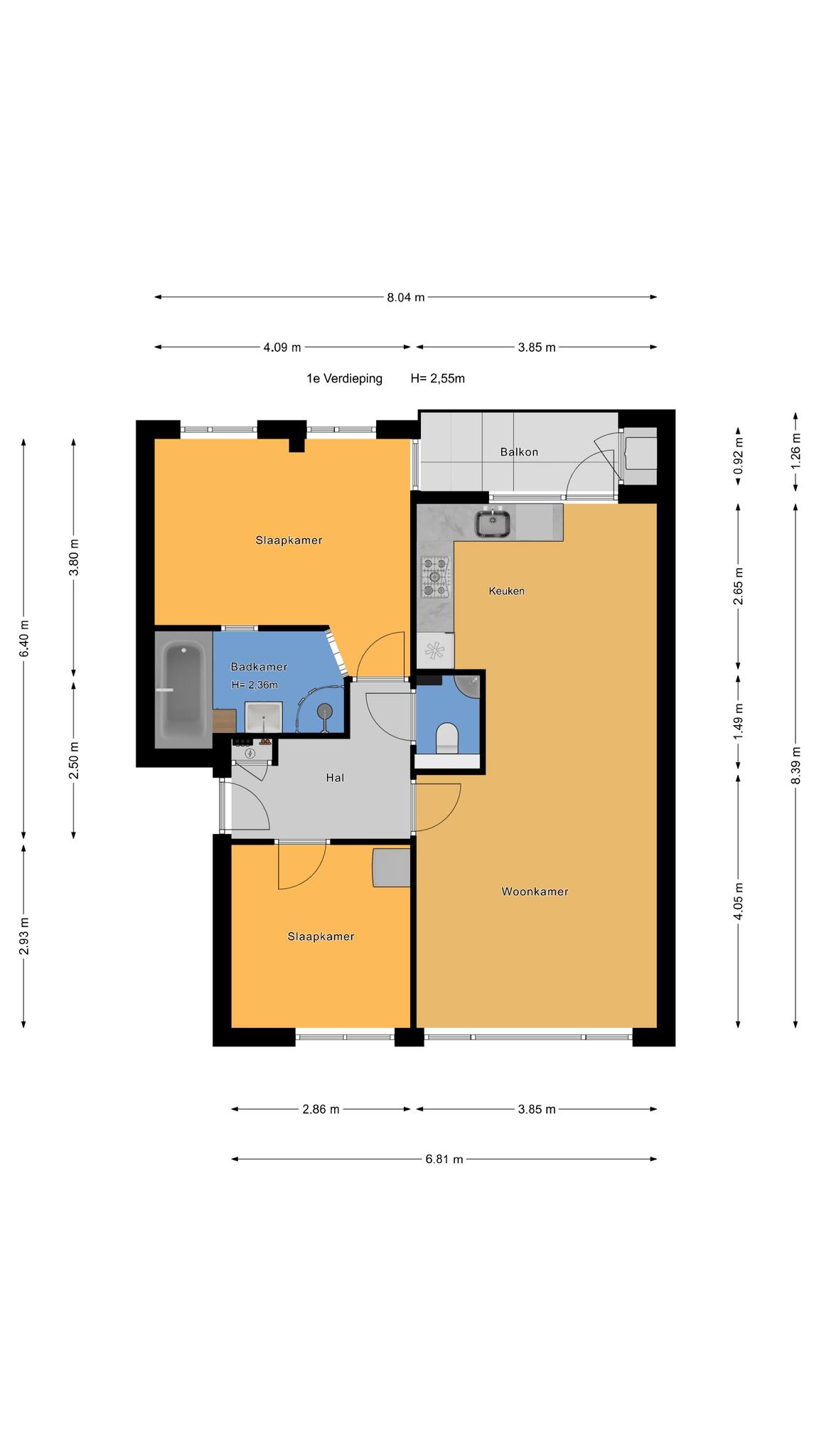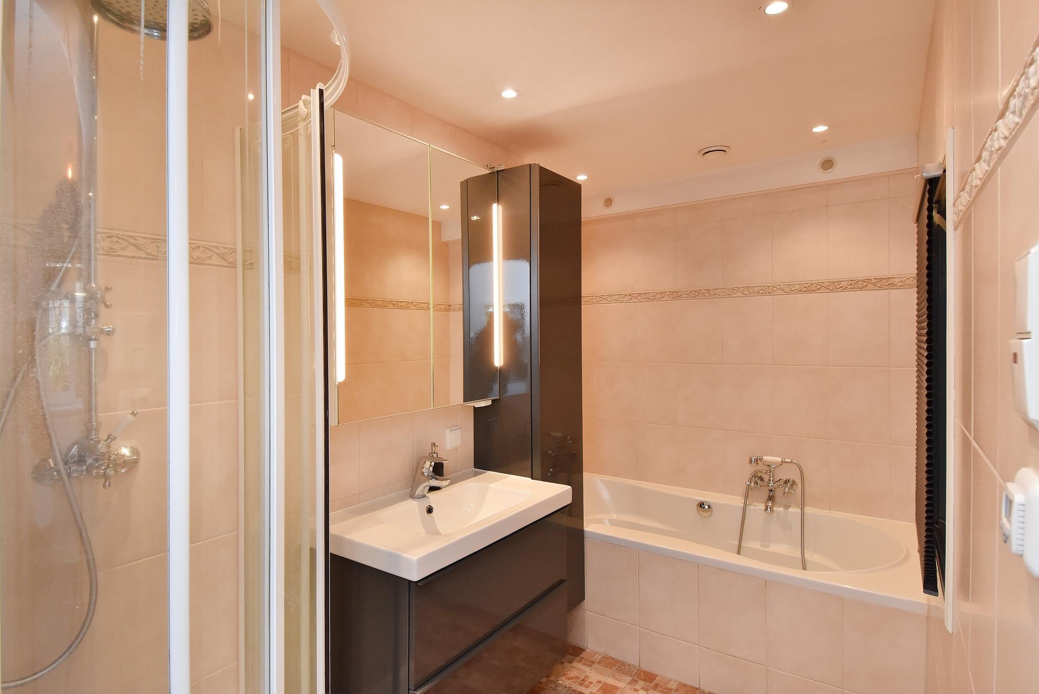 De indeling van het appartement is erg praktisch: de slaapkamers bevinden zich aan zowel de voor- als de achterzijde van de woning. De slaapkamer aan de achterzijde is voorzien van airconditioning, ideaal voor warme zomernachten. De badkamer is voorzien van een bad, douche, een wastafelmeubel en vloerverwarming. Separaat toilet vanuit de hal bereikbaar.