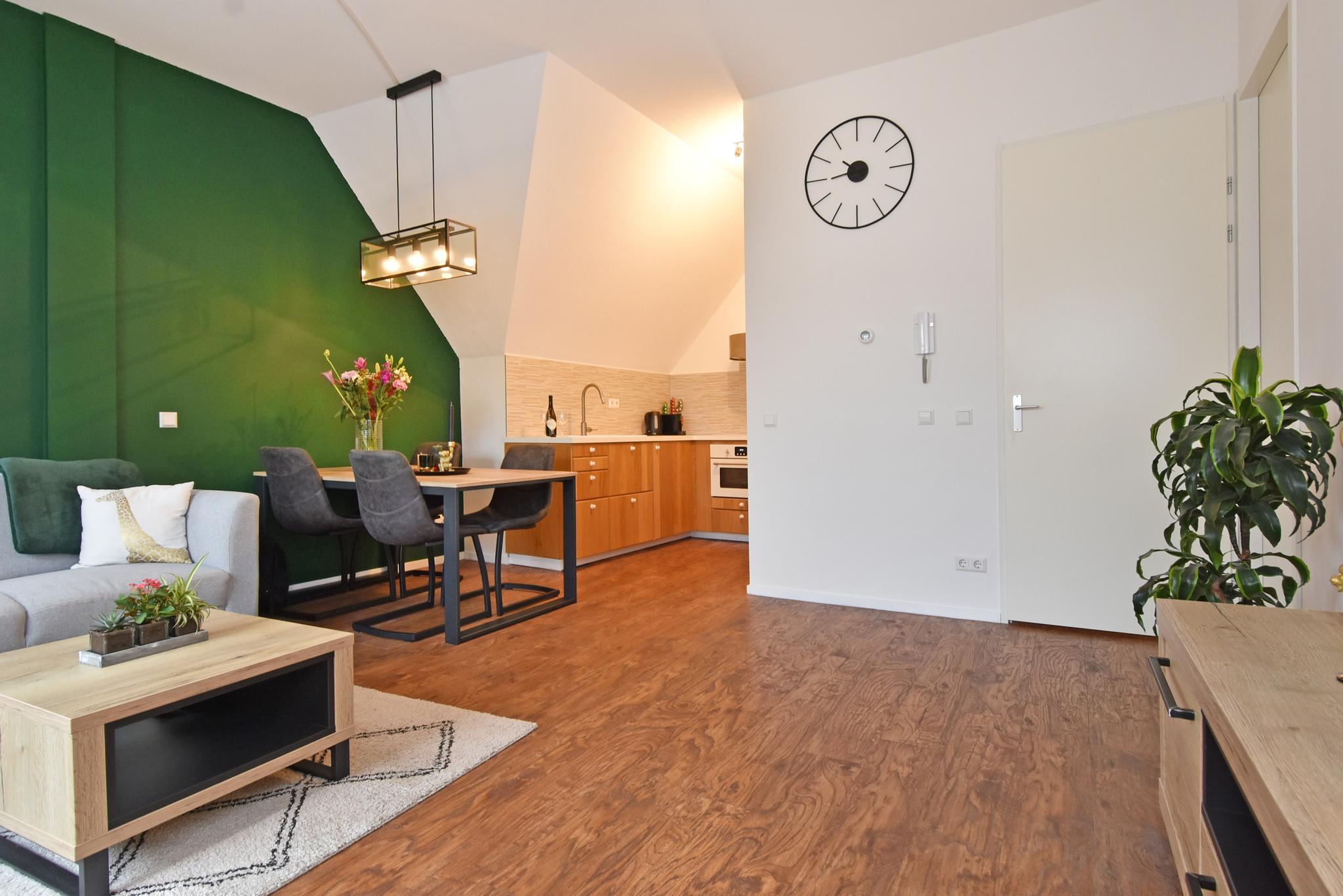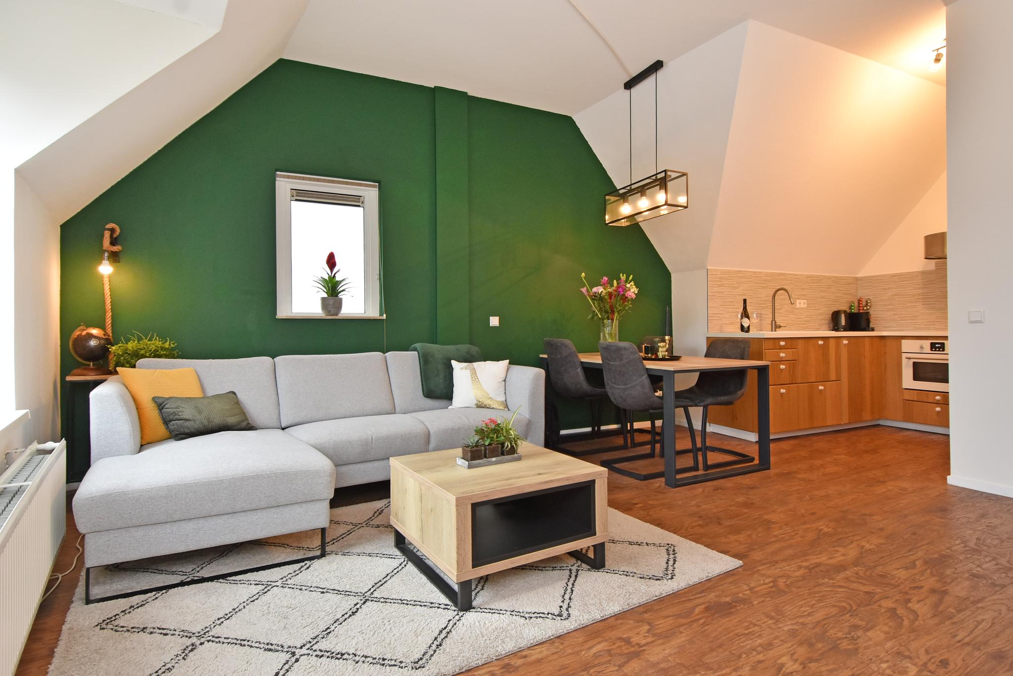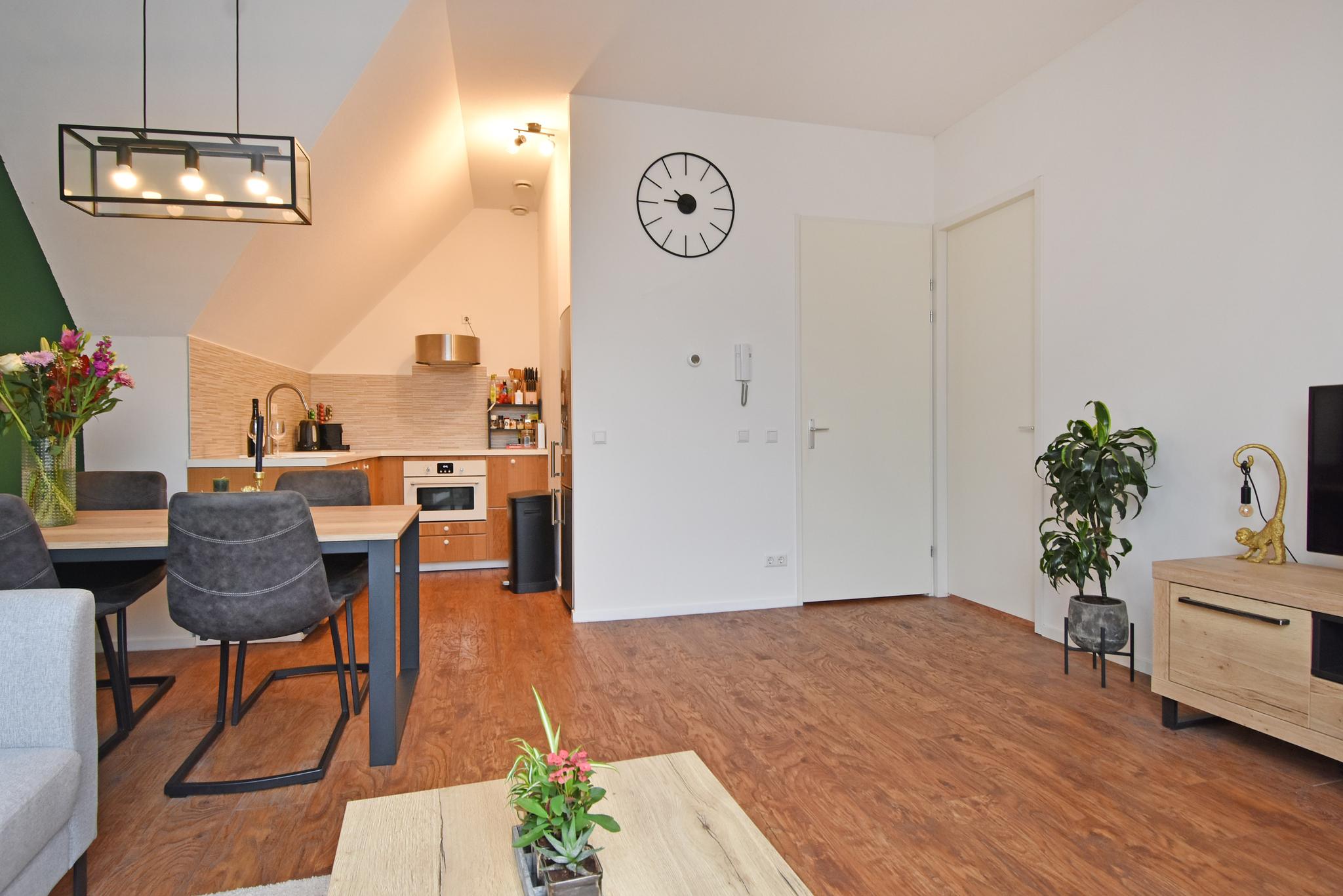 1e verdieping: Via de trap of lift toegang tot het appartement. Entree appartement, berging met kasten en wasmachine, toilet met fontein, gezellige woonkamer met een dakkapel met vrij uitzicht over het Dorpsplein, aangrenzend de ruime slaapkamer. Deze verdieping is v.v. een pvc-vloer. De moderne inbouwkeuken is praktisch ingedeeld en voorzien van een 4-pits inductiekookplaat, afzuigkap en combimagnetron. Vanuit de slaapkamer heb je toegang/doorgang naar de badkamer met een fijne douche en wastafelcombinatie. Aparte toegang/deur tot de berging met eigen CV ketel.