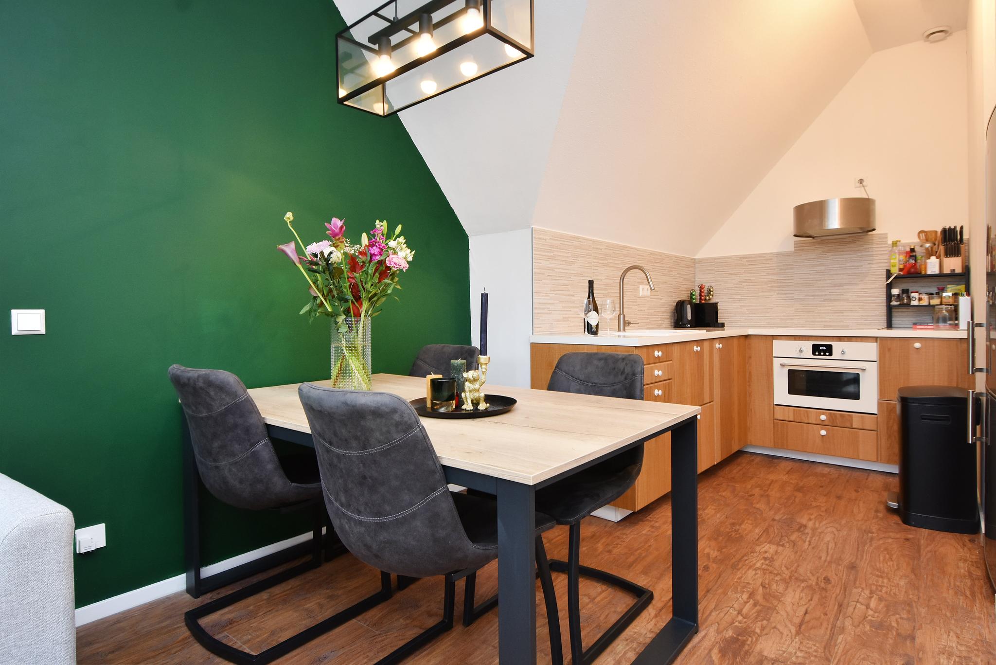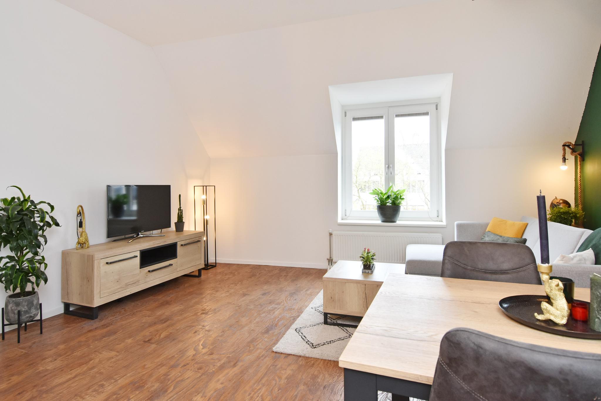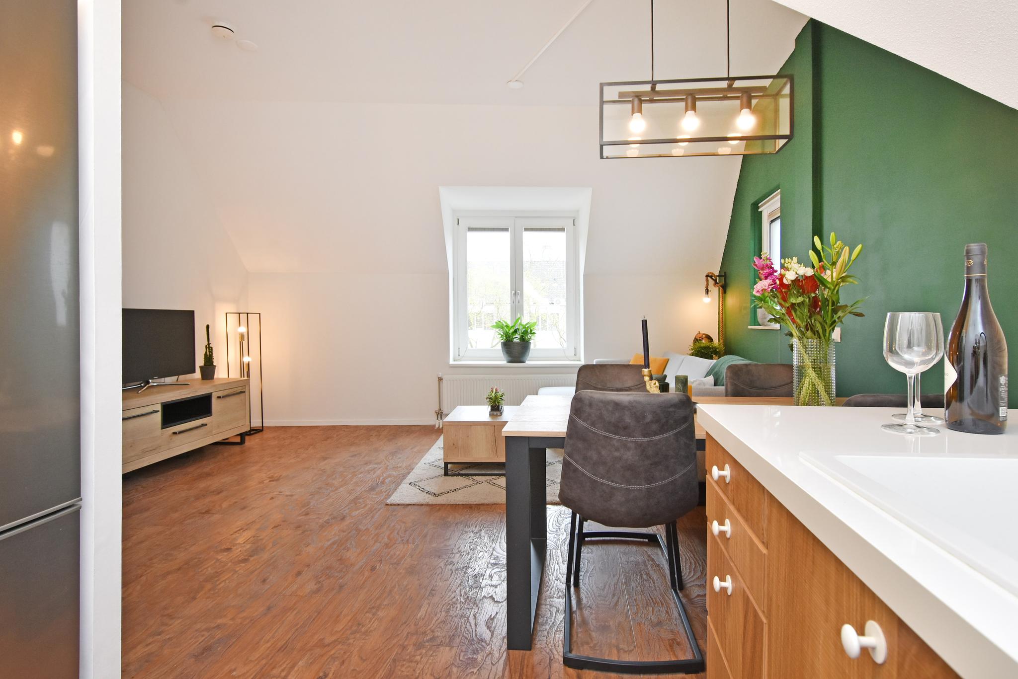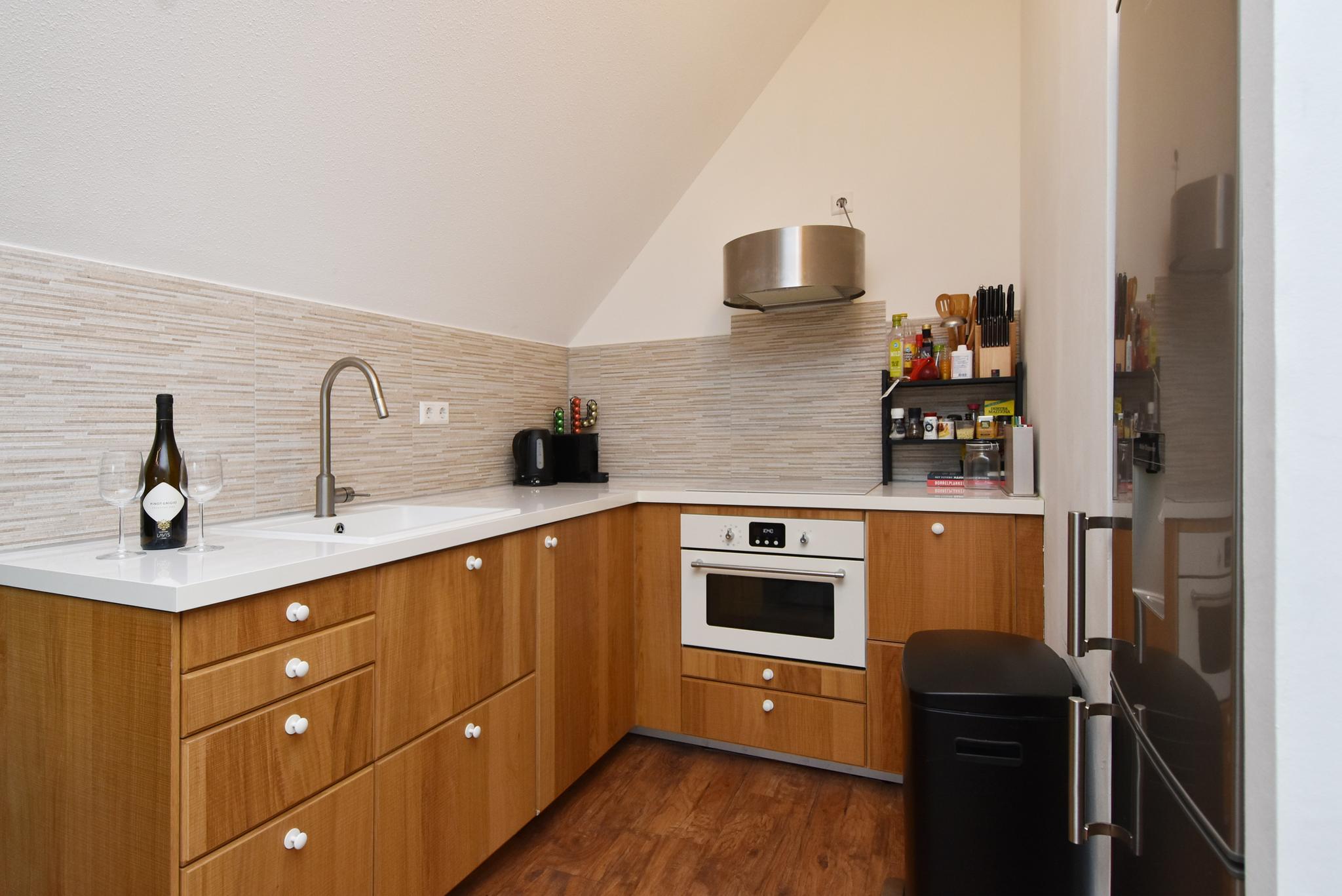 1e verdieping: Via de trap of lift toegang tot het appartement. Entree appartement, berging met kasten en wasmachine, toilet met fontein, gezellige woonkamer met een dakkapel met vrij uitzicht over het Dorpsplein, aangrenzend de ruime slaapkamer. Deze verdieping is v.v. een pvc-vloer. De moderne inbouwkeuken is praktisch ingedeeld en voorzien van een 4-pits inductiekookplaat, afzuigkap en combimagnetron. Vanuit de slaapkamer heb je toegang/doorgang naar de badkamer met een fijne douche en wastafelcombinatie. Aparte toegang/deur tot de berging met eigen CV ketel.