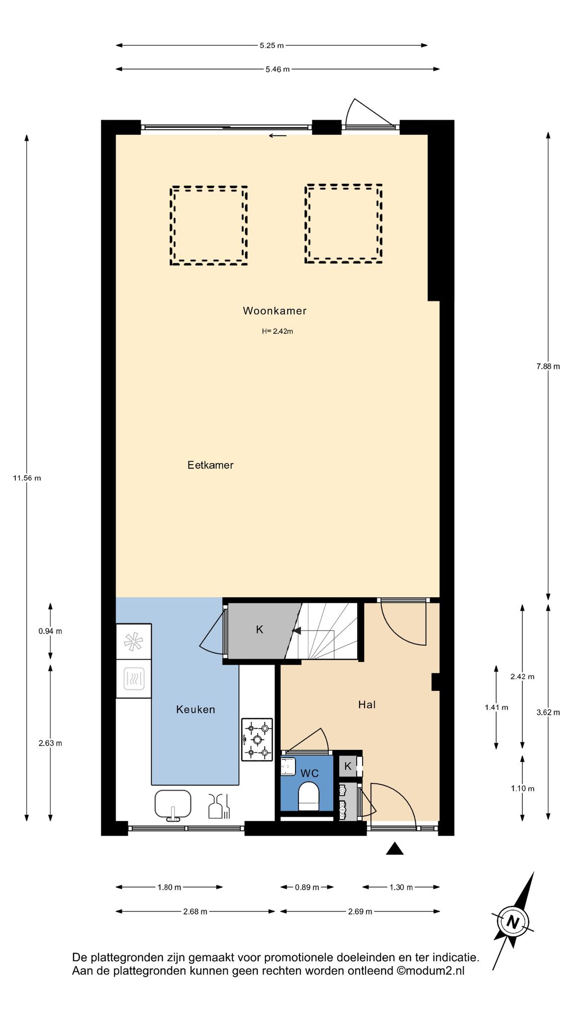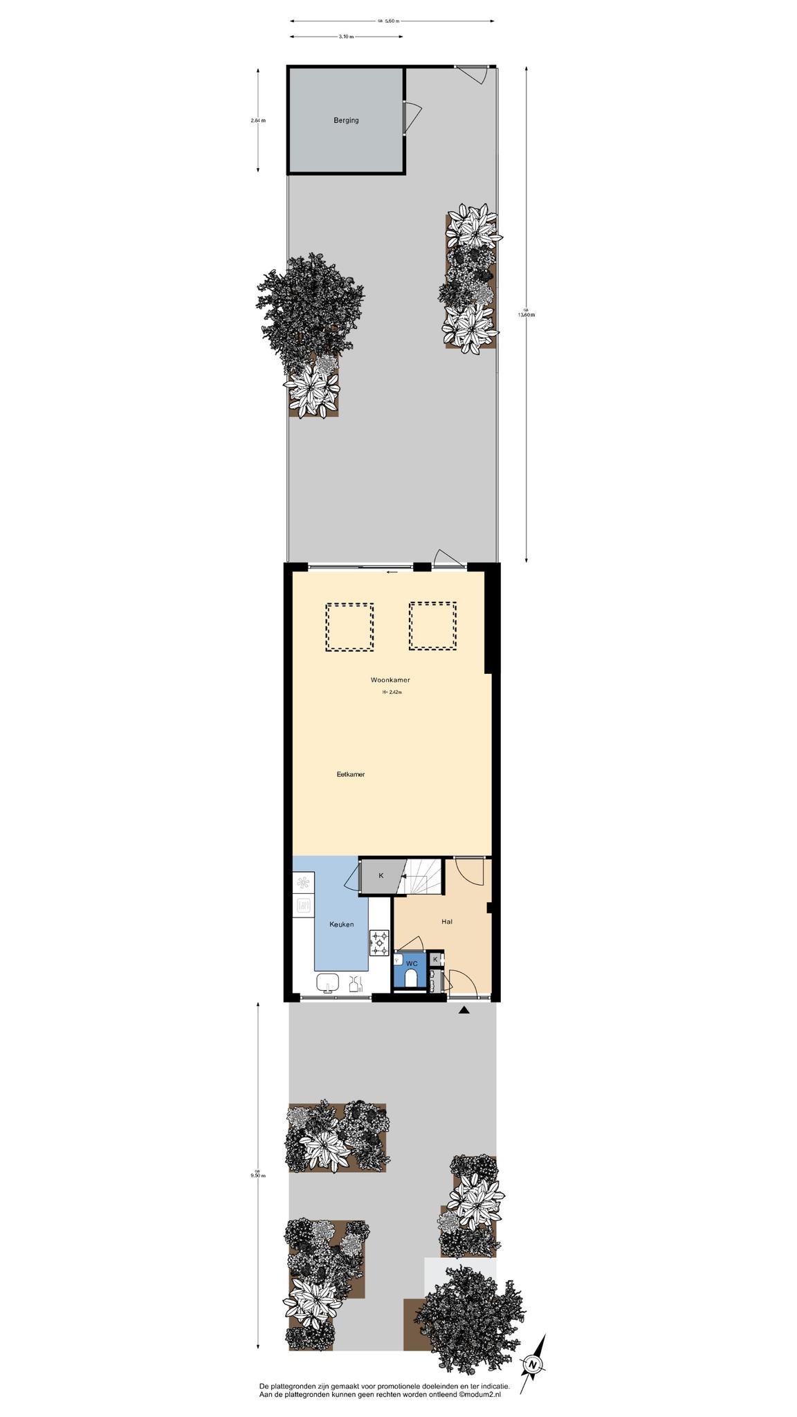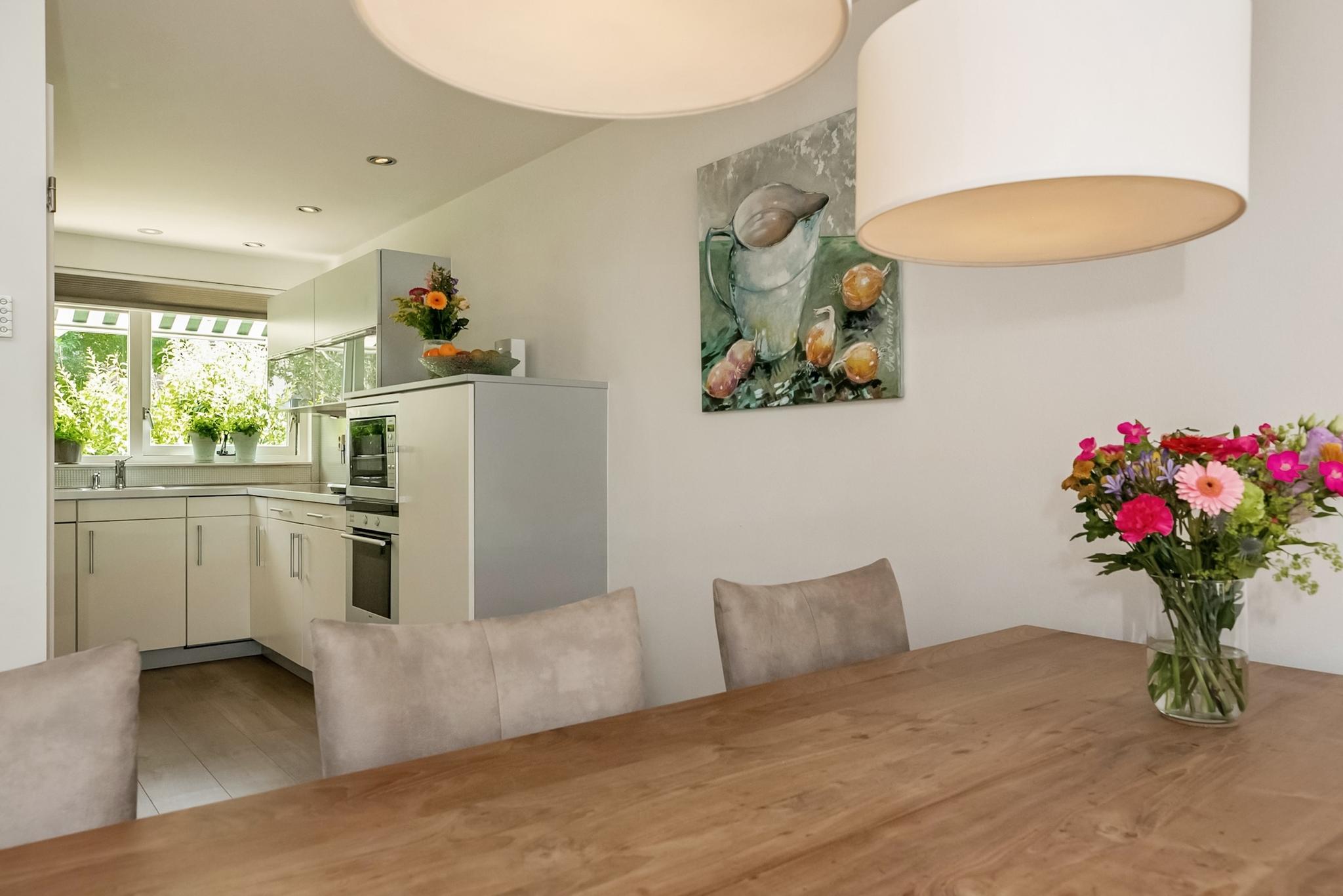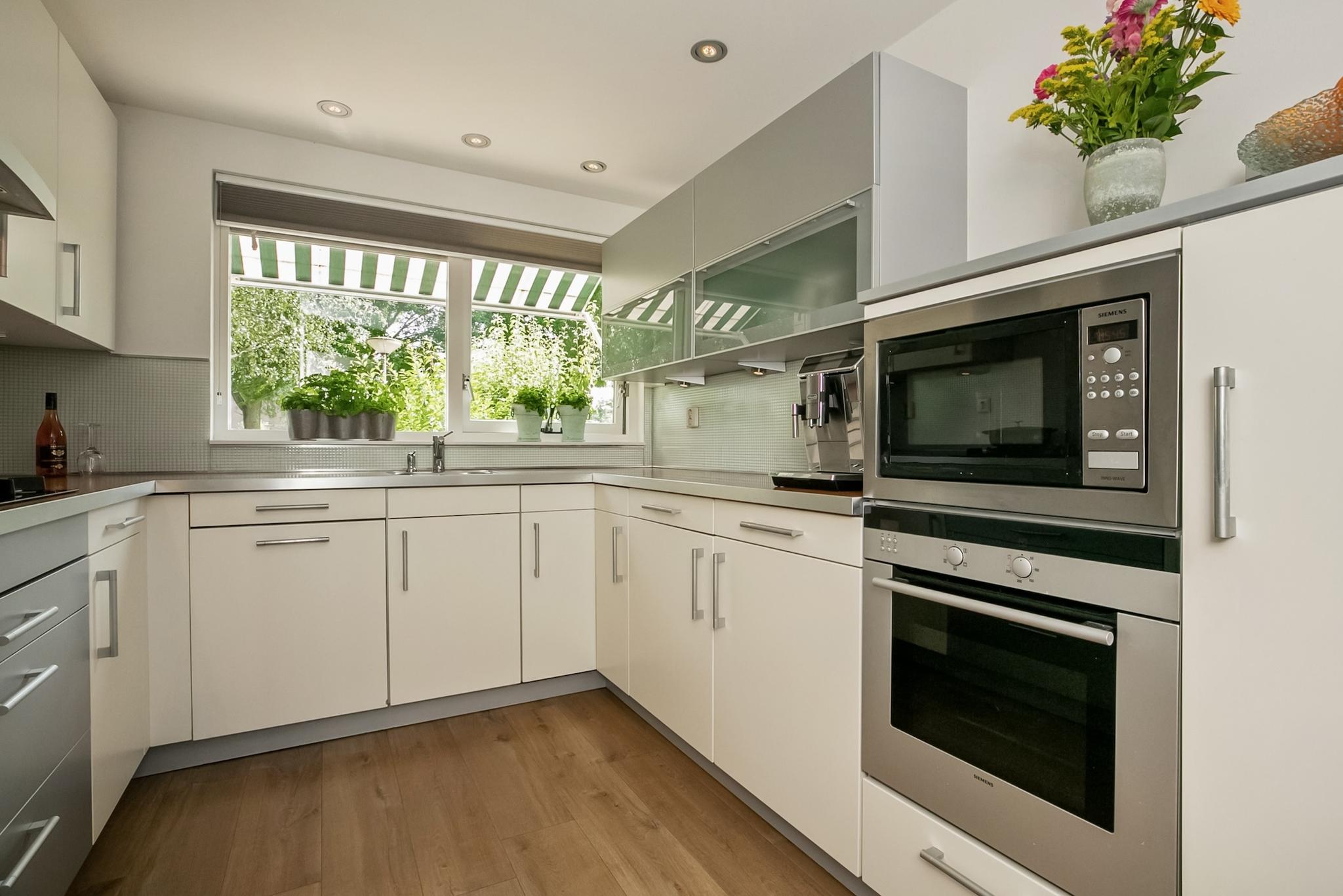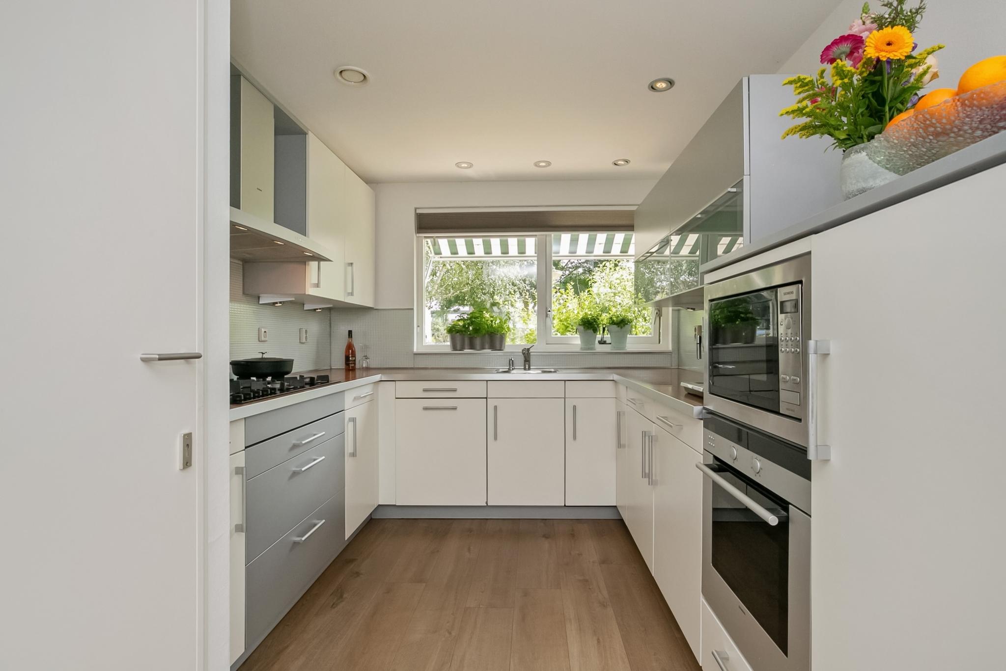 Indeling: Ruime hal/entree met meterkast en toiletruimte. Grote woonkamer, aan achterzijde uitgebouwd (2001) en v.v. twee lichtkoepels. Lekker veel lichtinval, mooie pvc-vloer in houtmotief, op de begane grond ligt vloerverwarming. De keuken is praktisch opgesteld in U-vorm, in lichte kleurtinten en v.v. diverse apparatuur. Grote inloopkast-voorraadkast direct in verbinding met de keuken. Aan achterzijde is de royale tuin toegankelijk, onderhoudsvriendelijk aangelegd, meerdere zitjes met mooie grote terrastegels. Berging met overkapping.