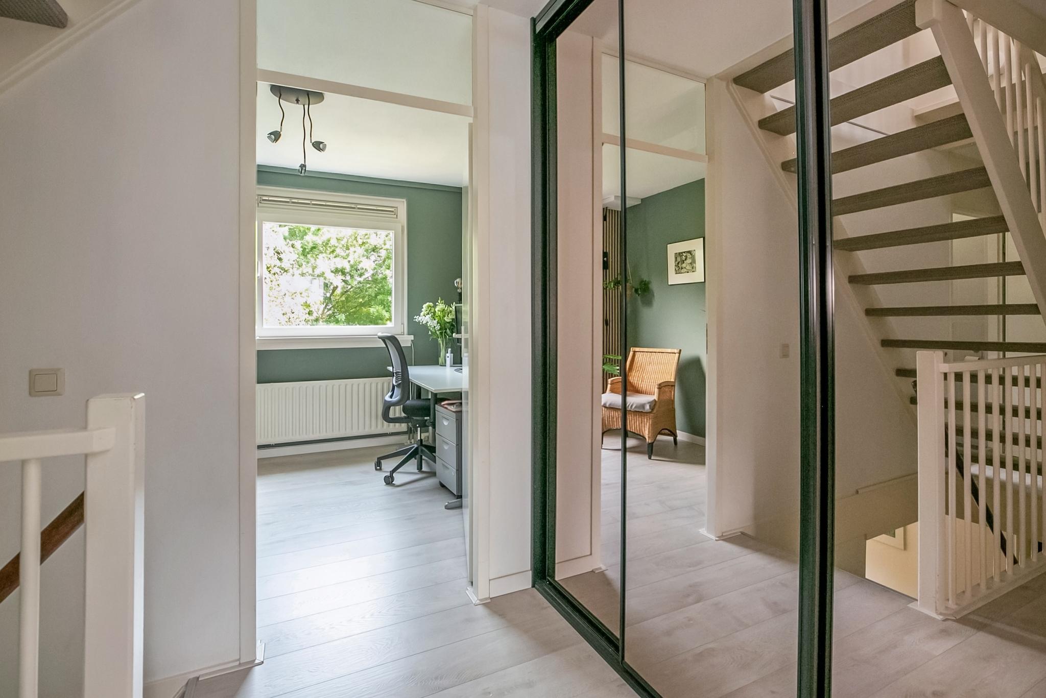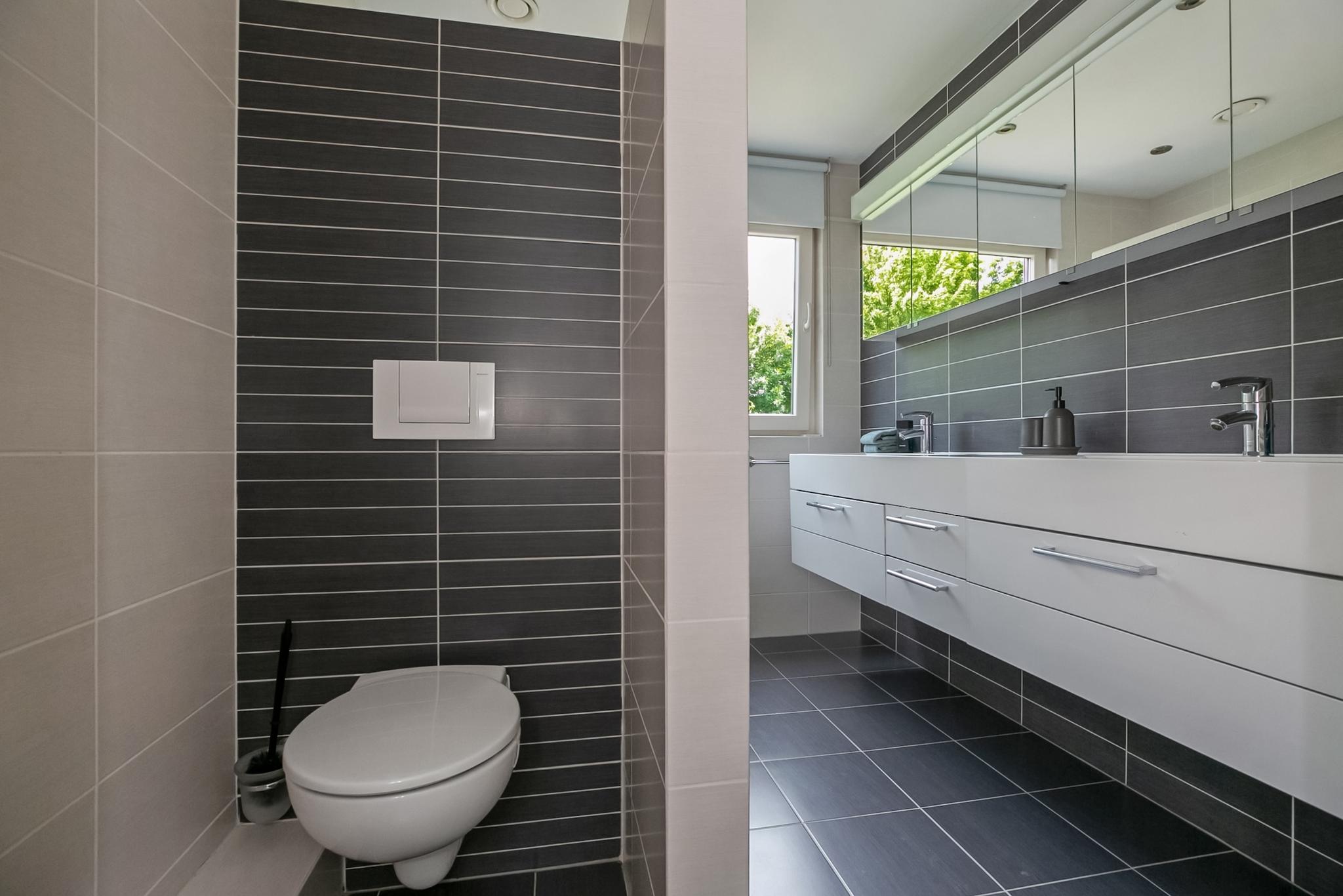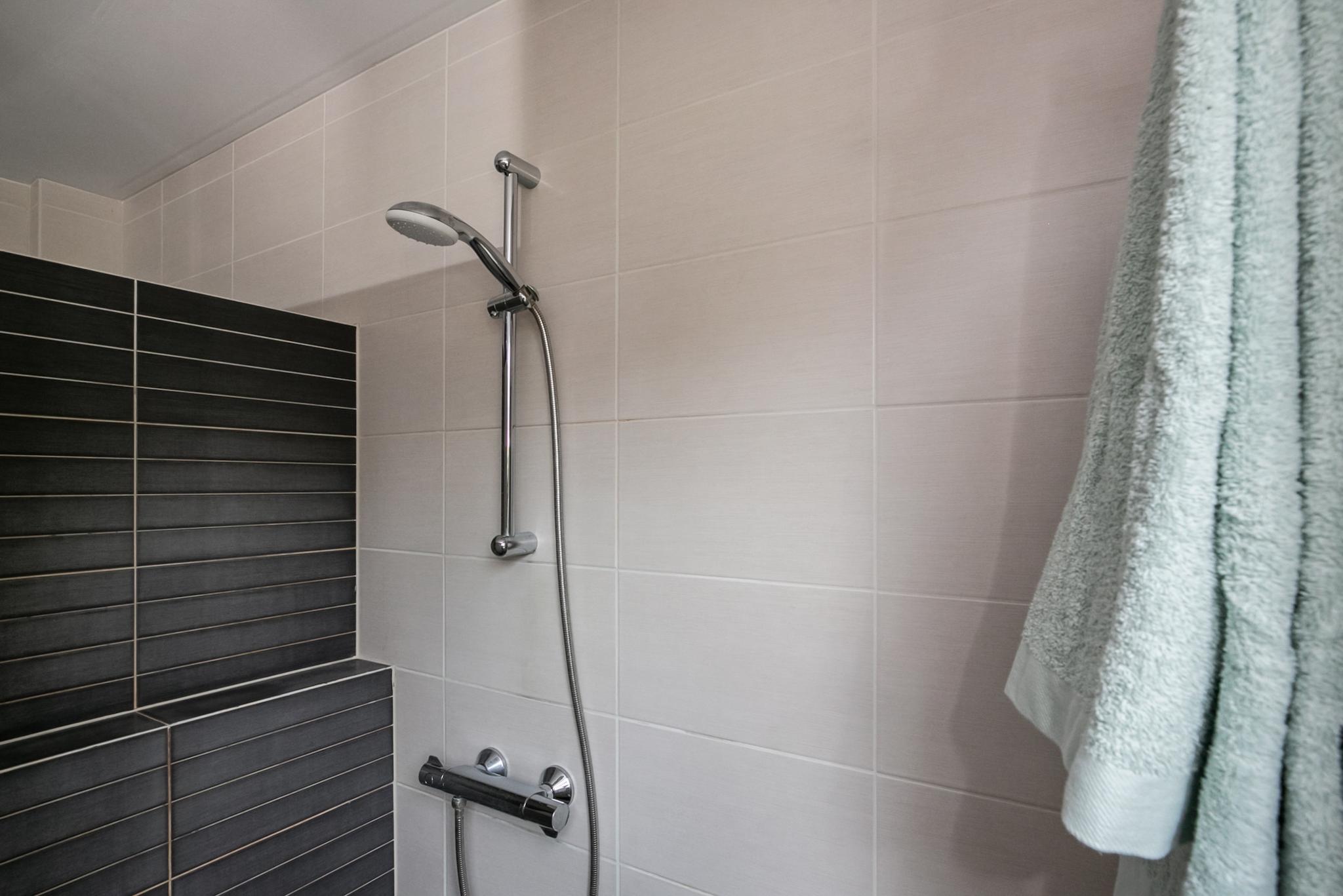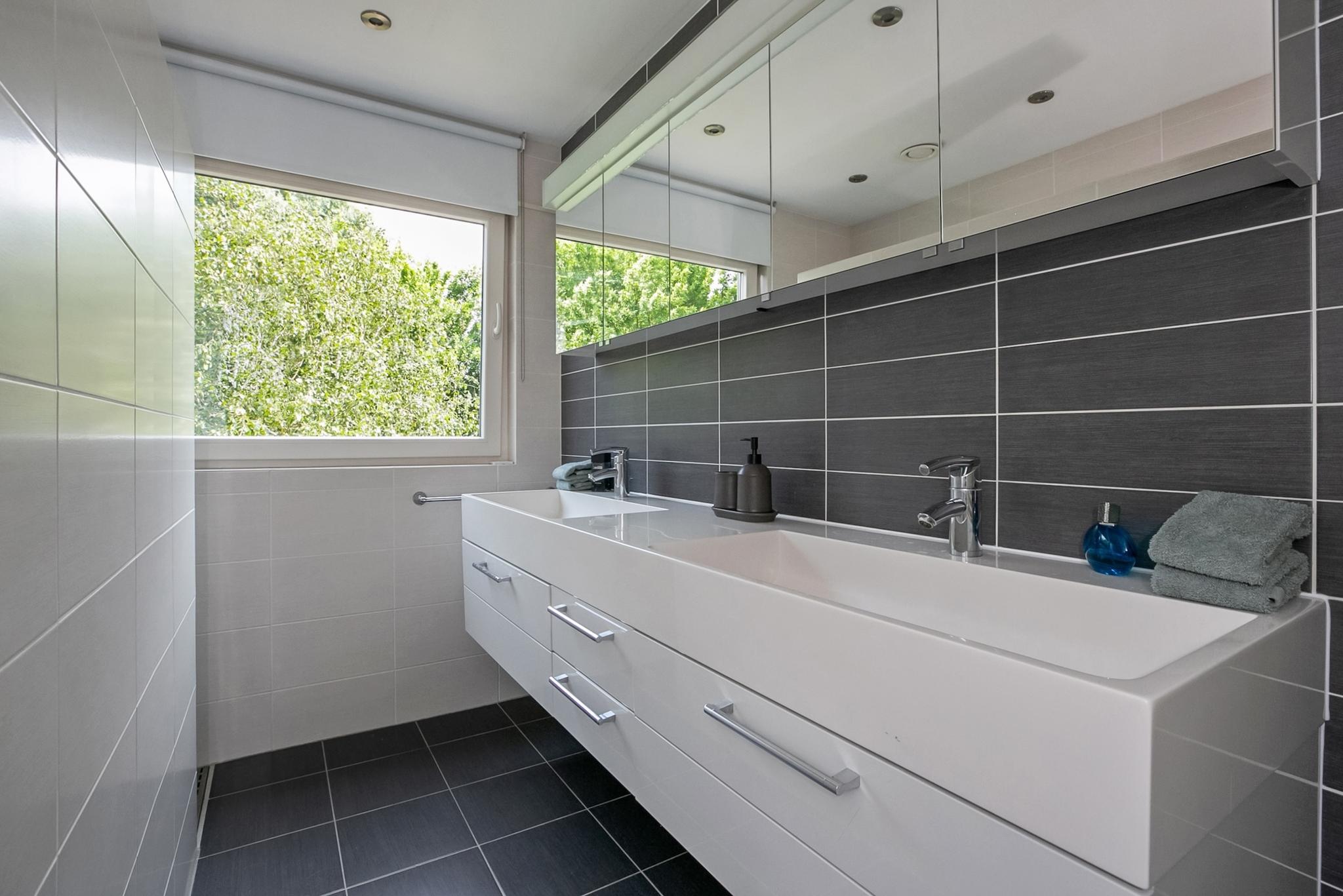 1e verdieping: Overloop met 2 slaapkamers. Oorspronkelijk 3 slaapkamers, de indeling is eenvoudig terug te brengen naar 3 slaapkamers. De hoofdslaapkamer ligt aan de achterzijde met een prettige & praktische indeling naar inloopgarderobe en privé kantoor-/studeerkamer. Moderne badkamer antracietgrijs/wit betegeld en toegerust met een grote inloopdouche, 2e toilet en breed wastafelmeubel met dubbele kraan.