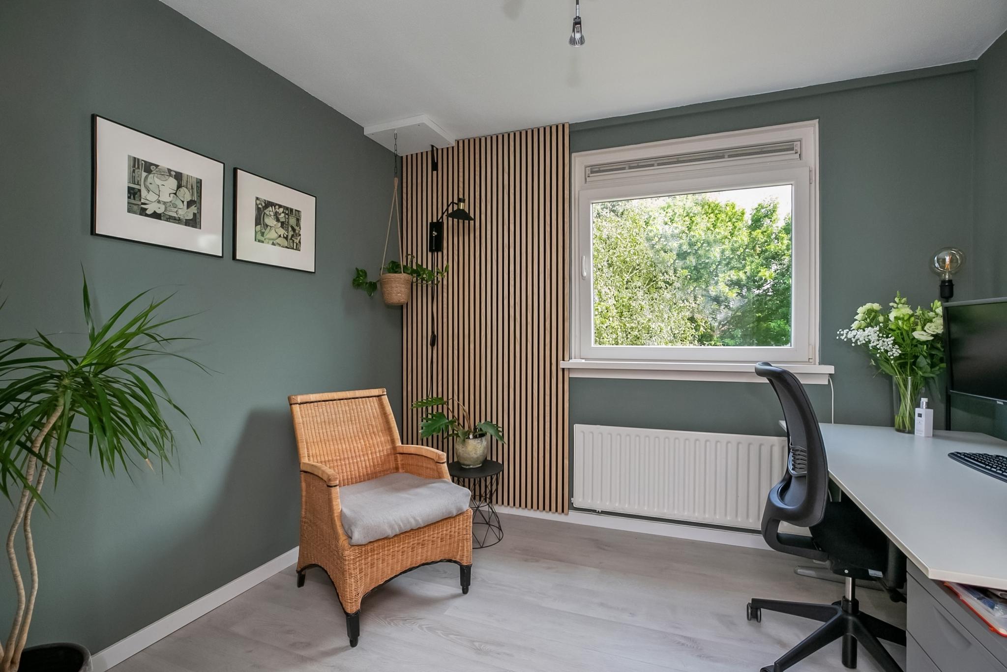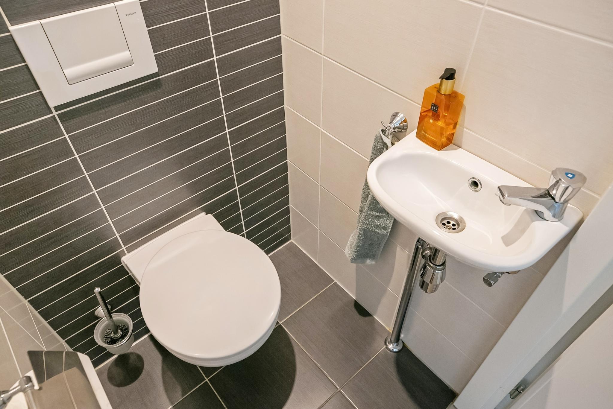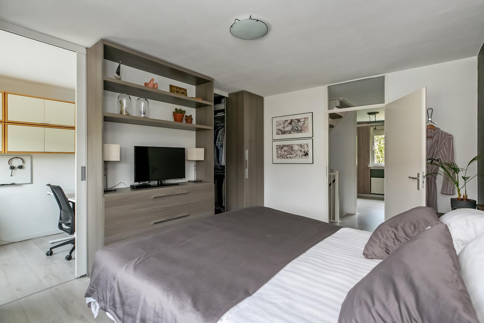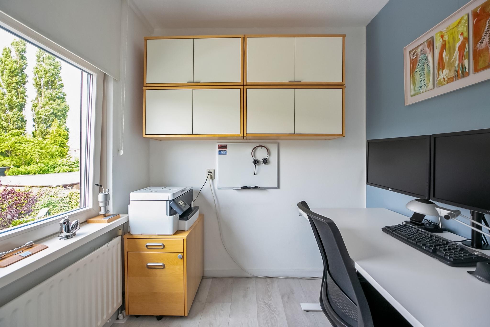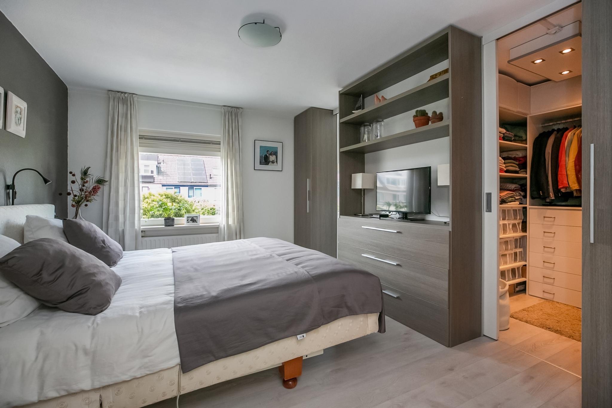 1e verdieping: Overloop met 2 slaapkamers. Oorspronkelijk 3 slaapkamers, de indeling is eenvoudig terug te brengen naar 3 slaapkamers. De hoofdslaapkamer ligt aan de achterzijde met een prettige & praktische indeling naar inloopgarderobe en privé kantoor-/studeerkamer. Moderne badkamer antracietgrijs/wit betegeld en toegerust met een grote inloopdouche, 2e toilet en breed wastafelmeubel met dubbele kraan.