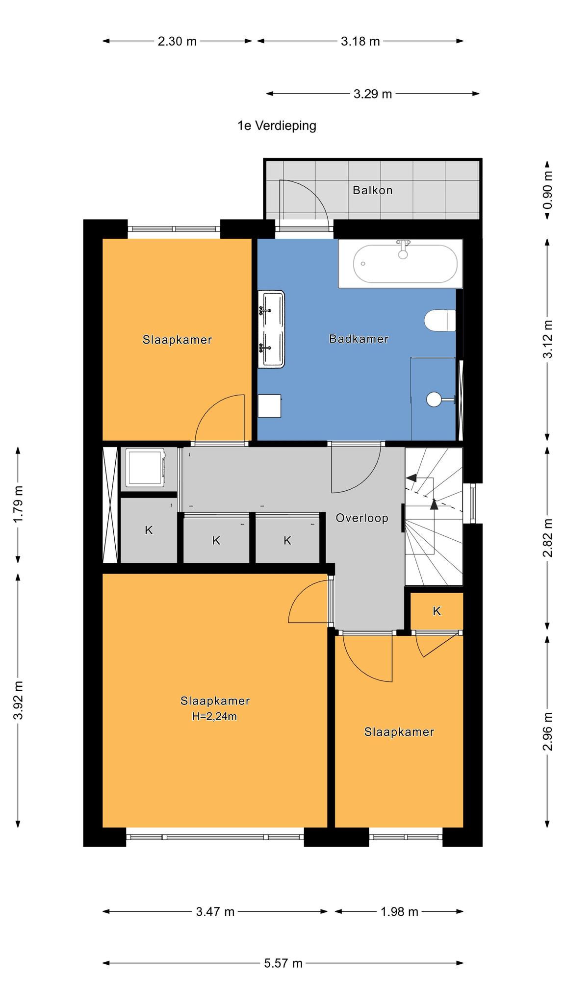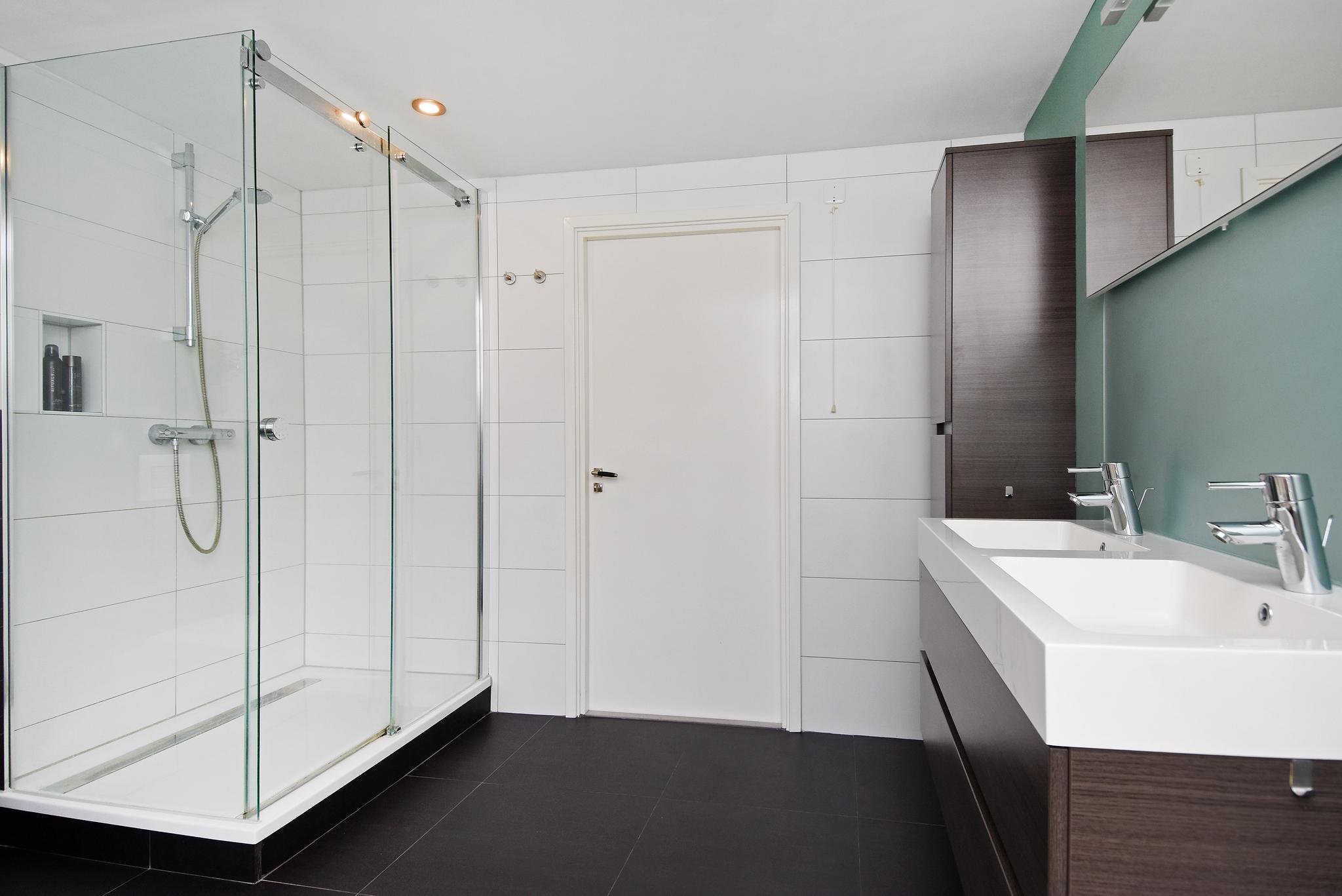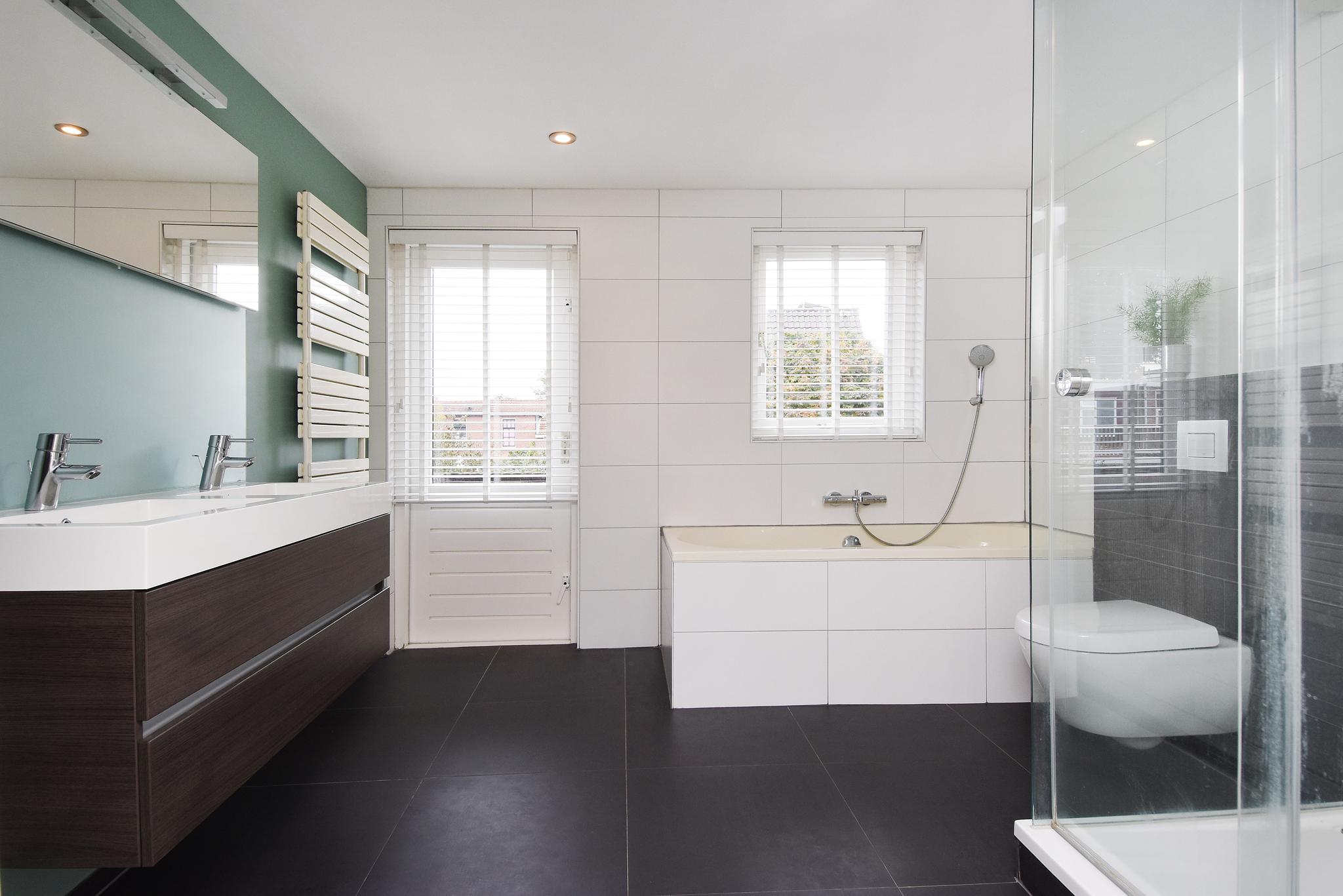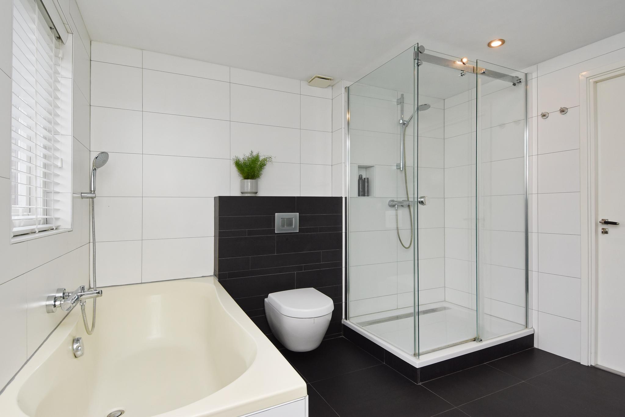 1e Verdieping: L-vormige overloop met kastenwand en kast met opstelling wasapparatuur. 2 Voorslaapkamers waarvan 1 met vaste kast en 1 achterslaapkamer. Riante aan achterzijde gesitueerde, luxe badkamer met ligbad, ruime inloopdouche, toilet, dubbele wastafel en toegang tot het balkon.